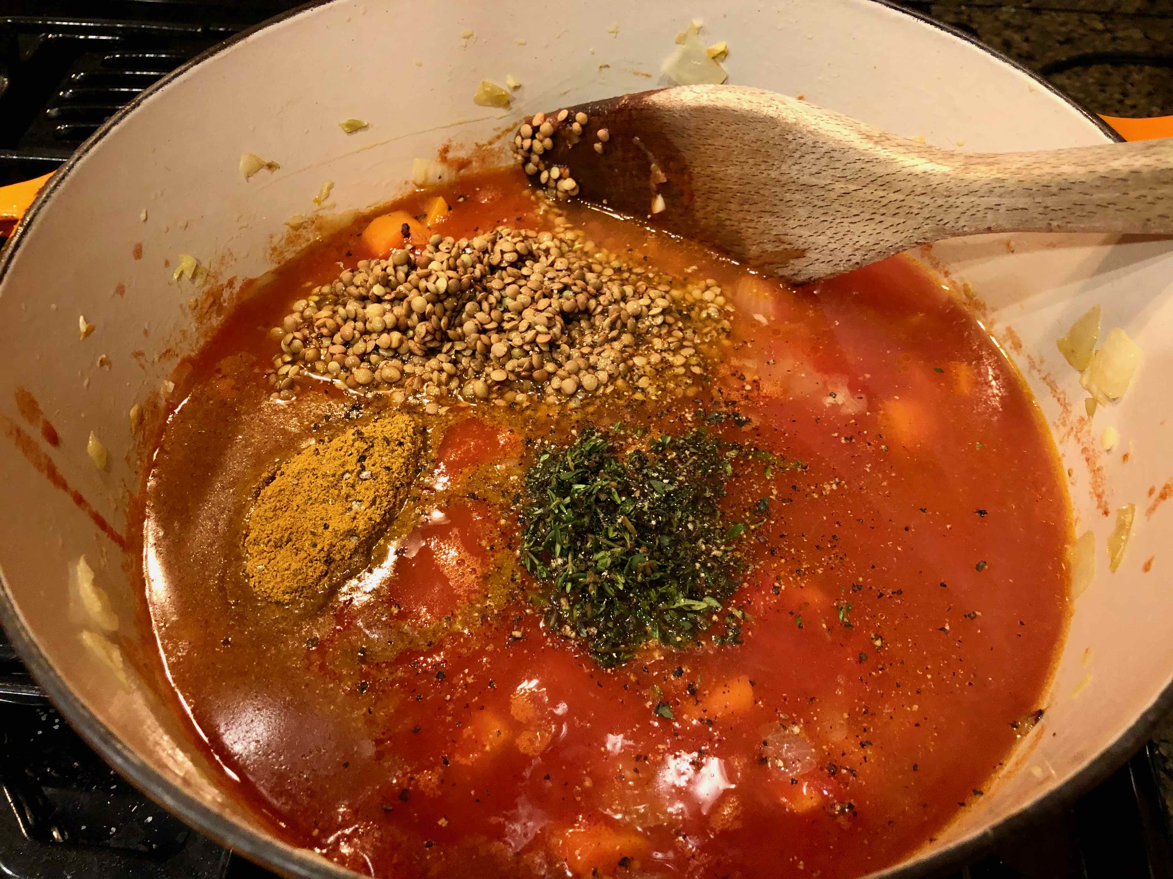 5. Add the tomatoes, lentils, chicken stock, curry, thyme, 1 tablespoon salt, and 1 teaspoon pepper to the pot.