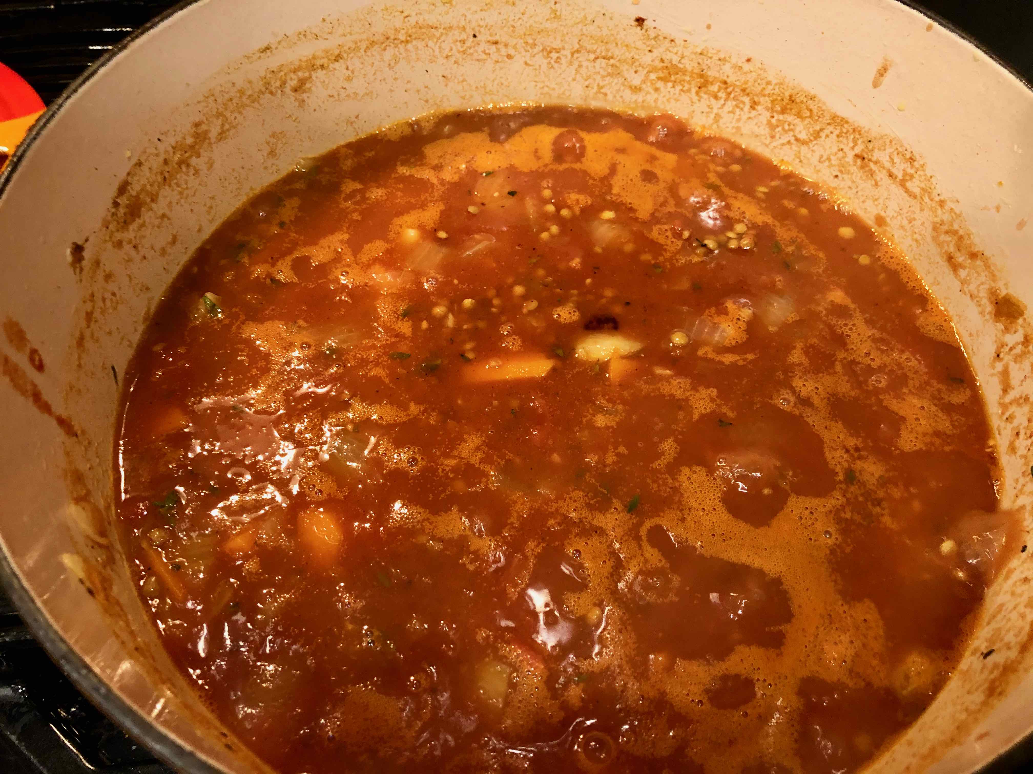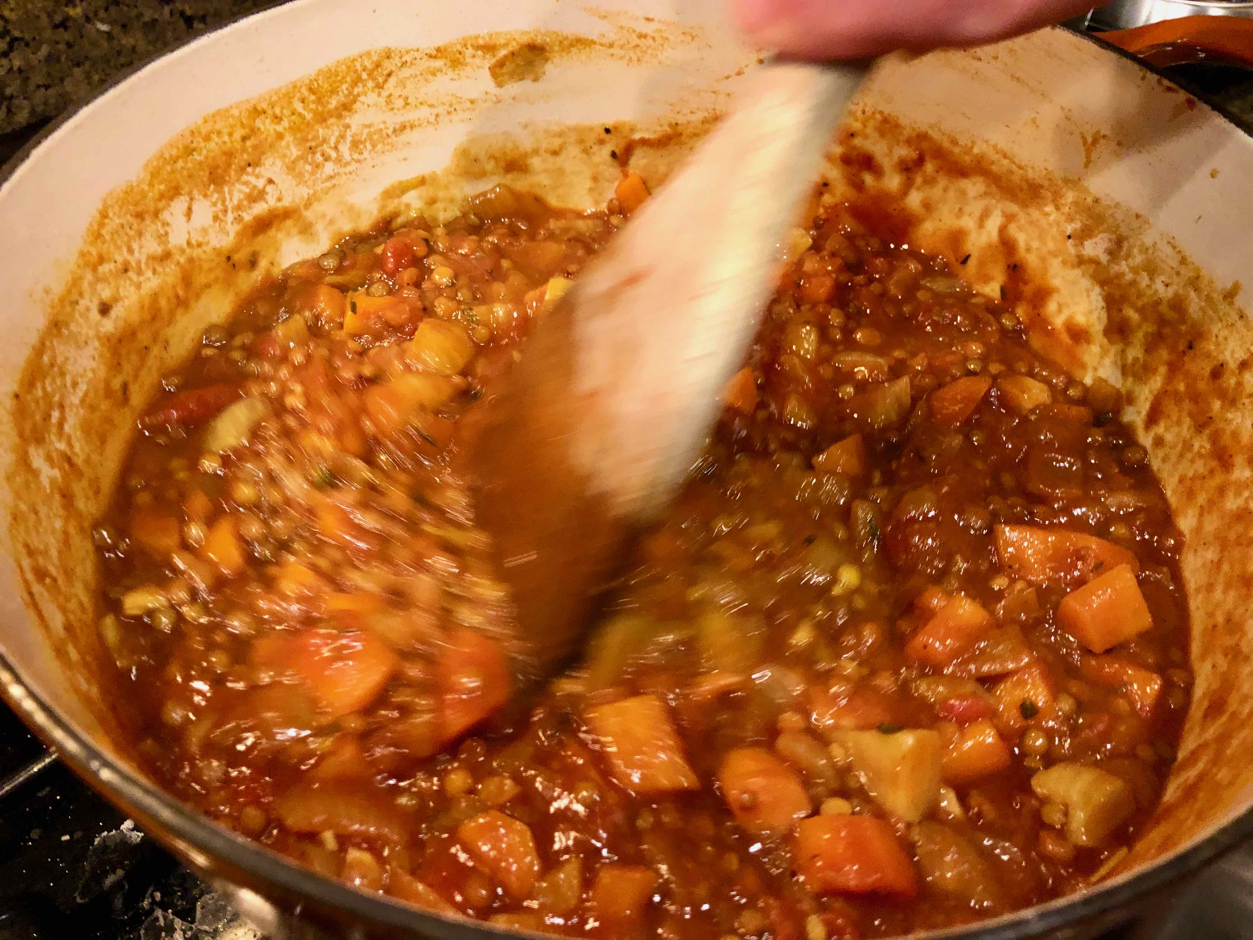 6. Bring to a boil, lower the heat, and simmer, covered, for 30 to 40 minutes, until the lentils are tender. Stir occasionally, scraping the bottom of the pot, with a wooden spoon and check to be sure the liquid is simmering.