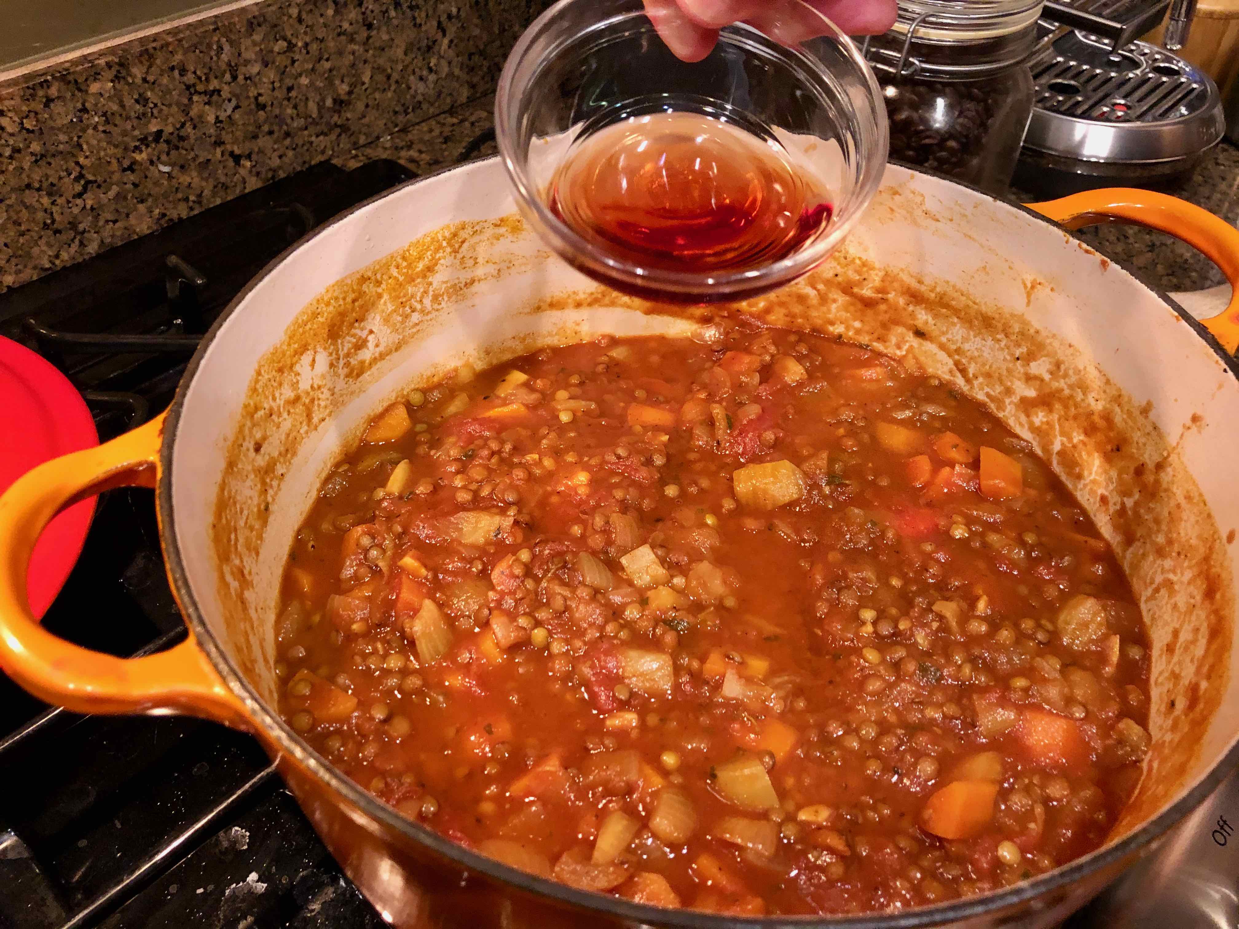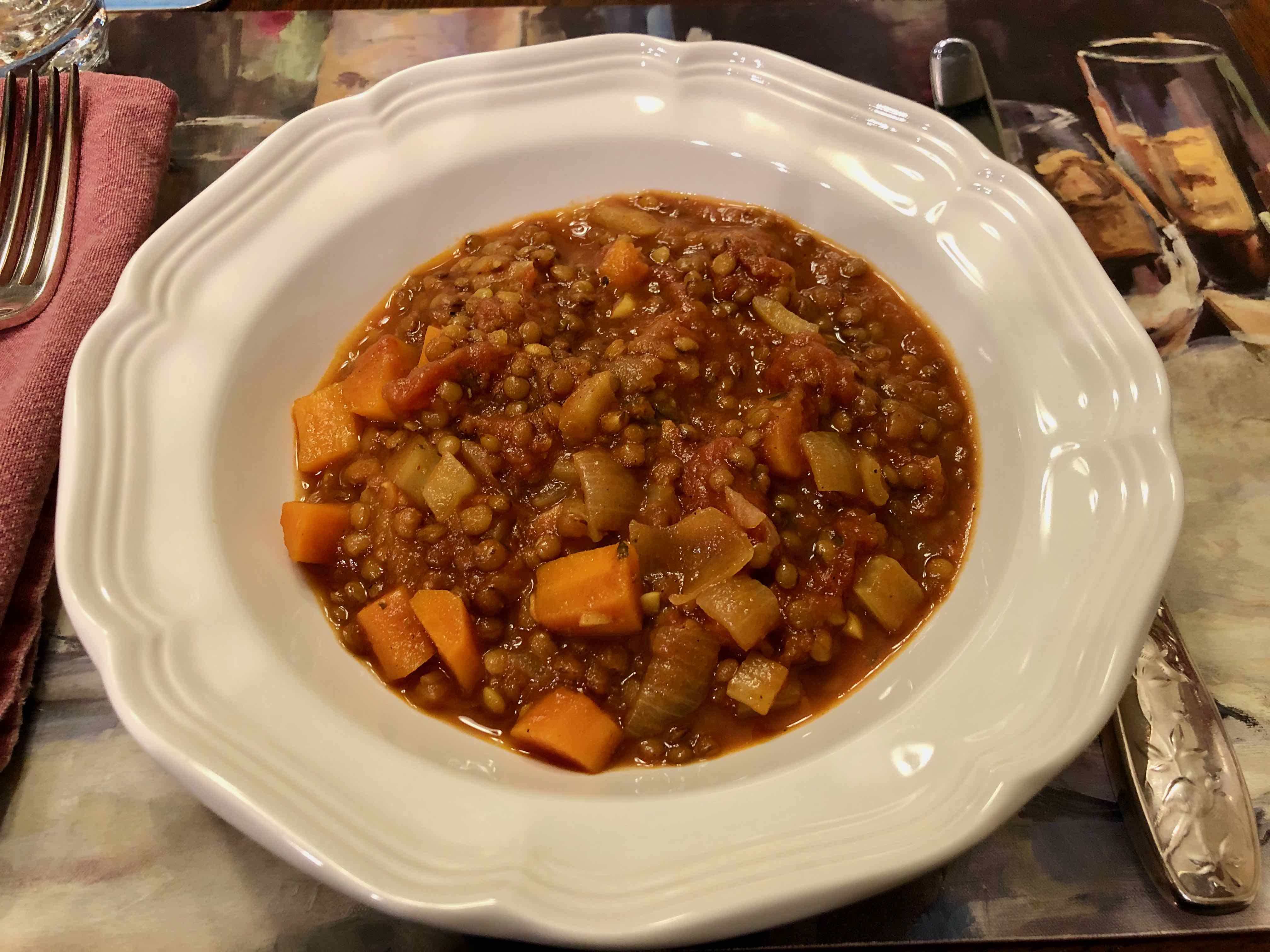 The recipe calls for readily available ingredients and a minimal amount of preparation. The most difficult part is waiting for the stew to cook as its tantalizing aromas fill the kitchen. But when it’s done, you have a dish with earthy aromatics as well as savory and sweet flavors. The lentils still have some bite and are complemented by the unctuous texture of the chunky carrots, onions, and fennel. There’s an underpinning of spice from the curry powder, an herbaceous note from the thyme, and a brightness from the touch of red-wine vinegar added before serving.
