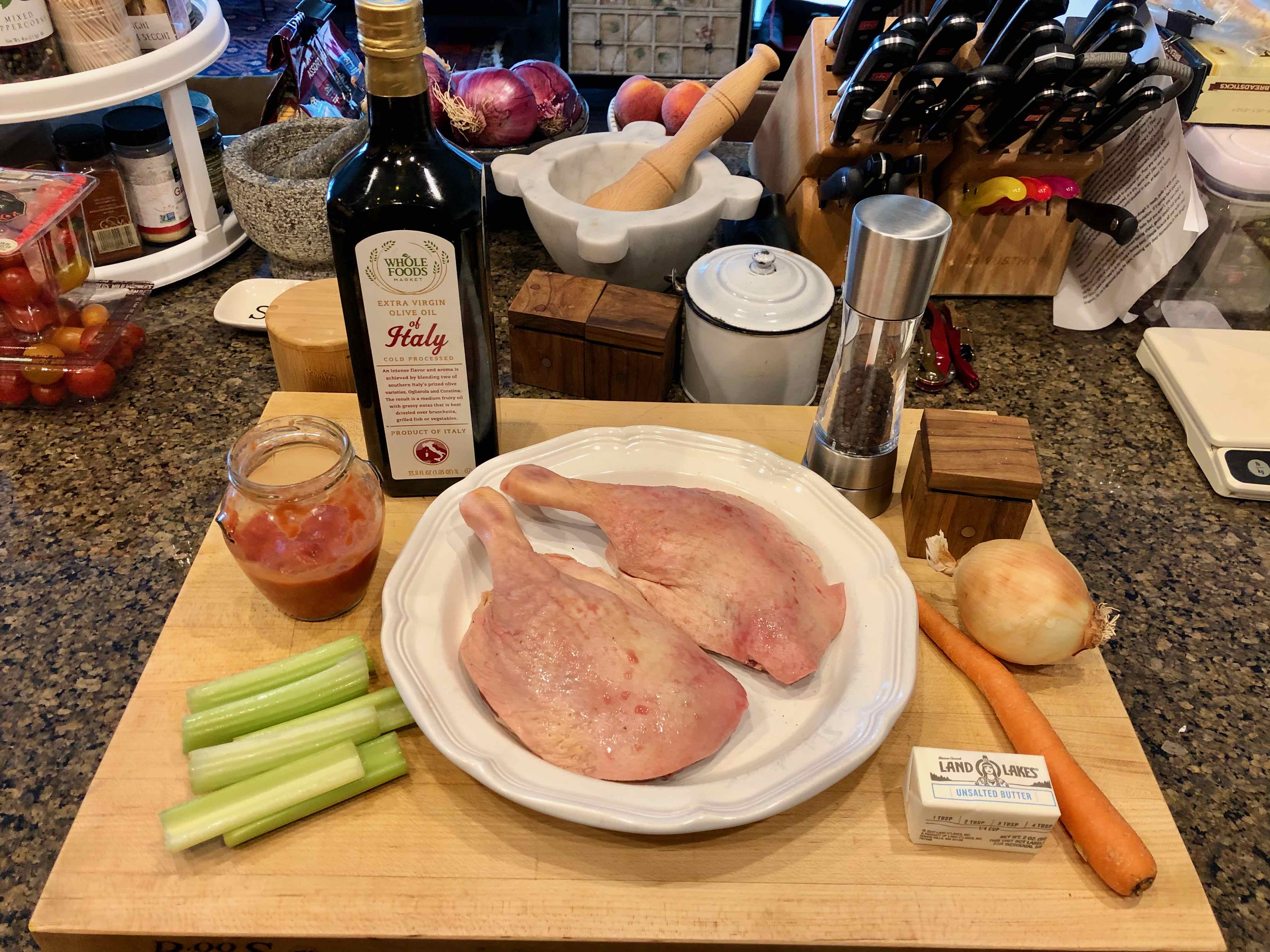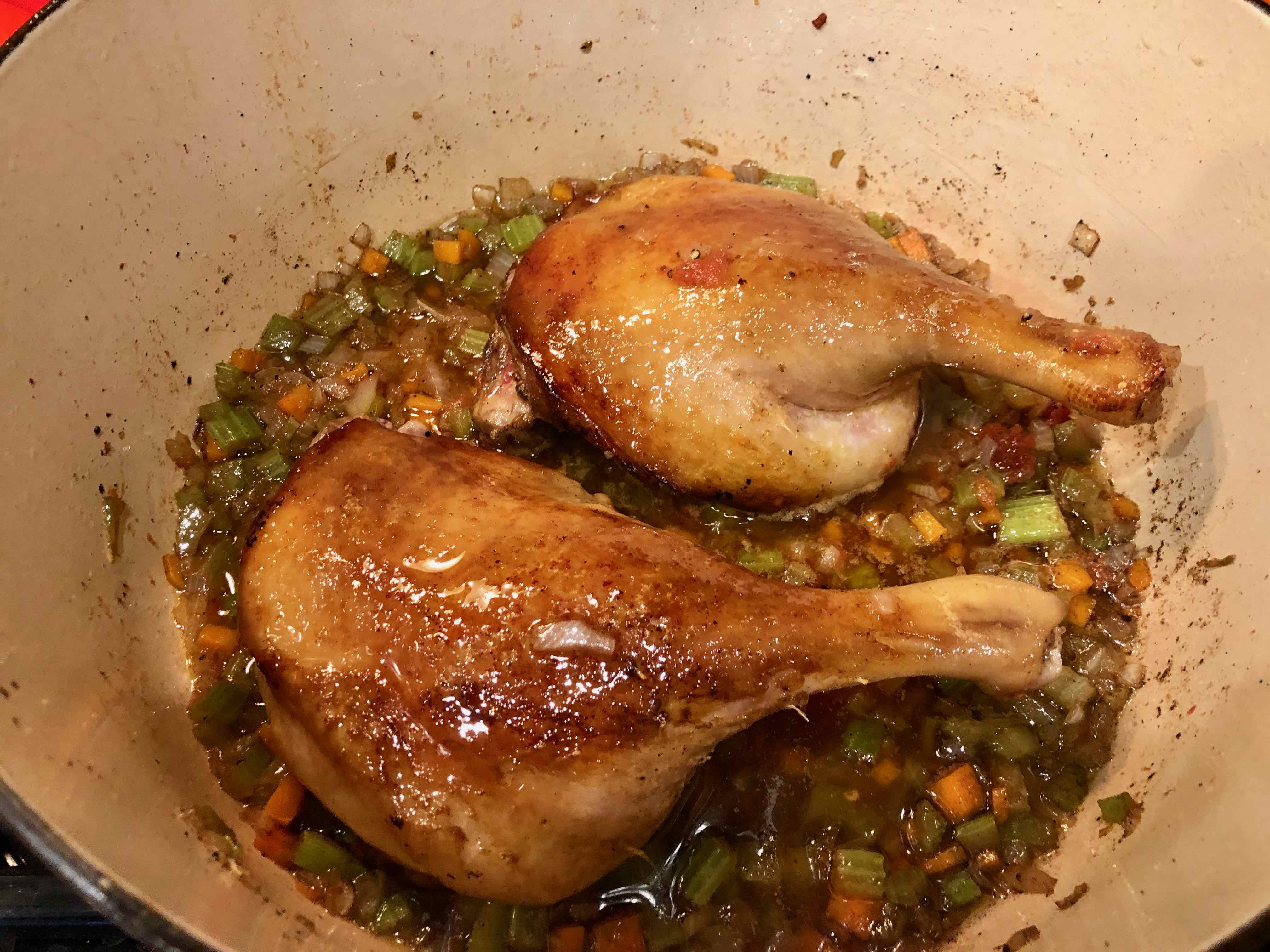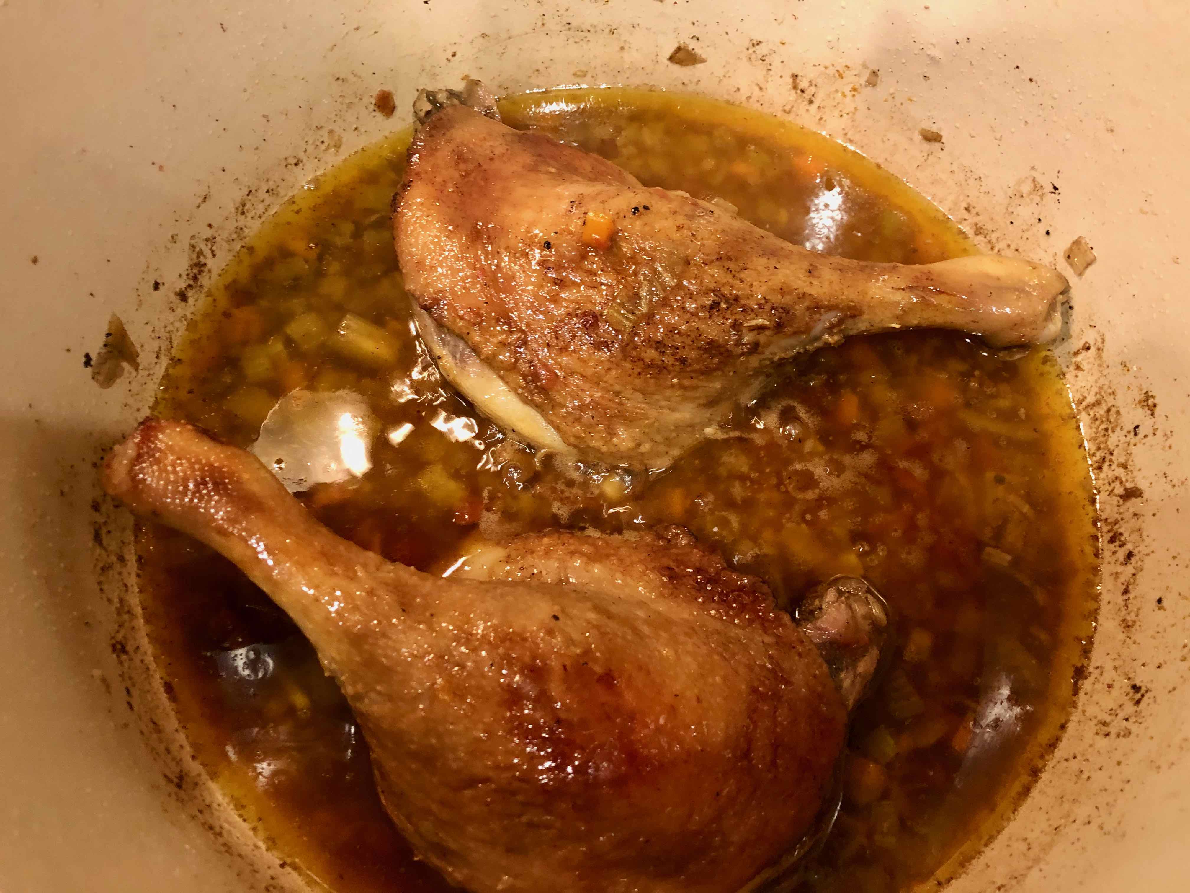 Braised Duck Legs Venetian Style (adapted from a recipe in Venetian Cooking, by H.F. Bruning Jr. and Cavaliere Umberto Bullo)