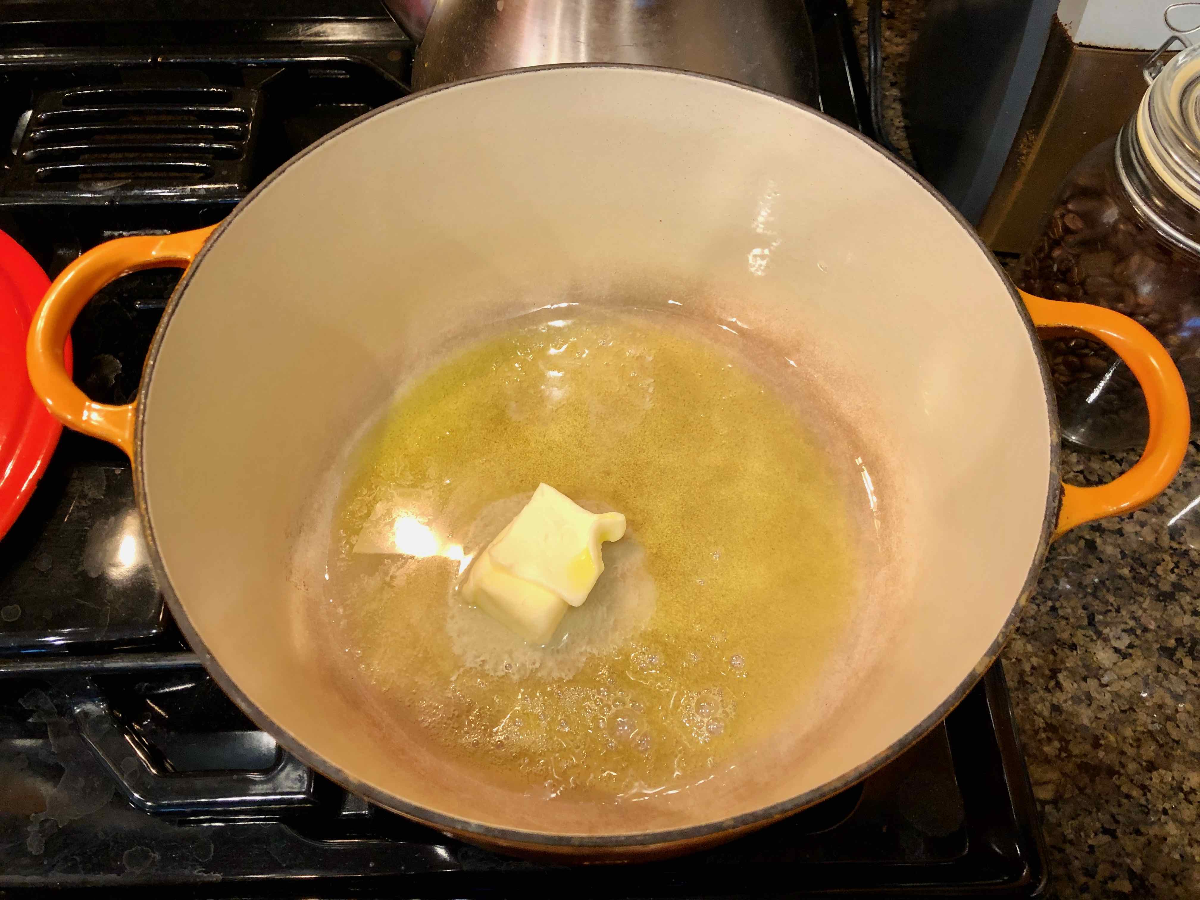 1. Place butter and olive oil in a large enameled cast-iron or similar casserole over fairly high heat.
