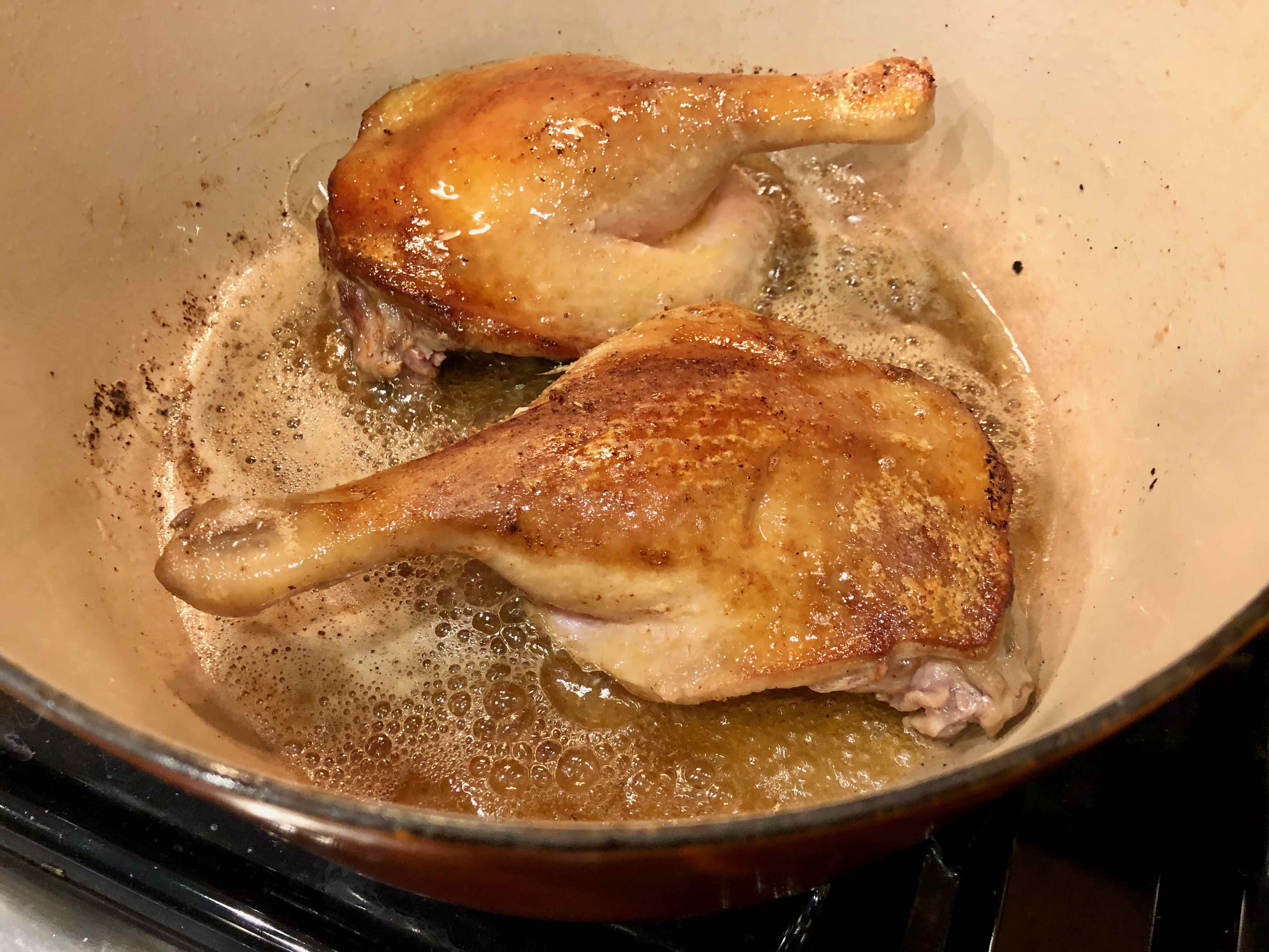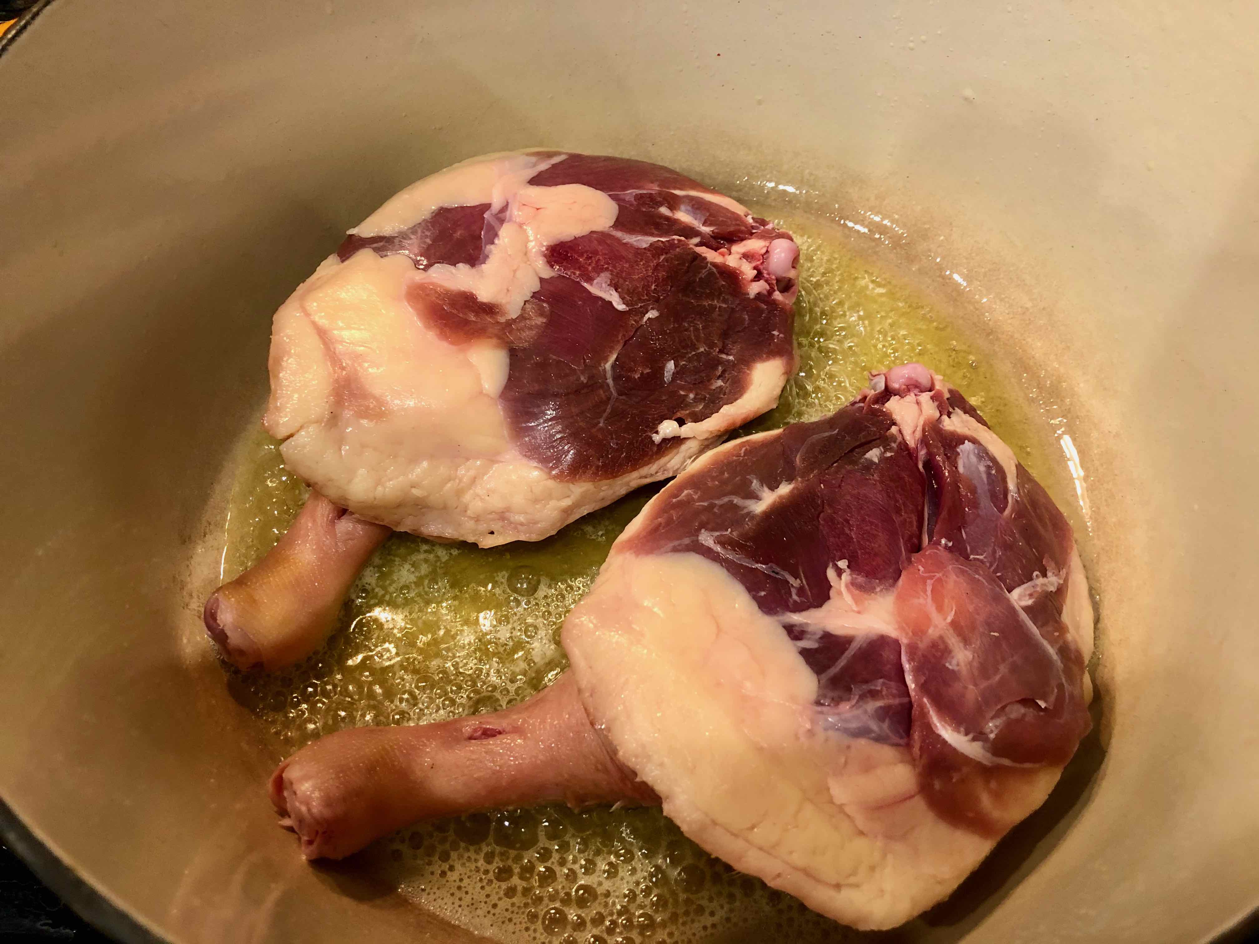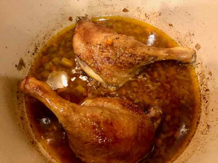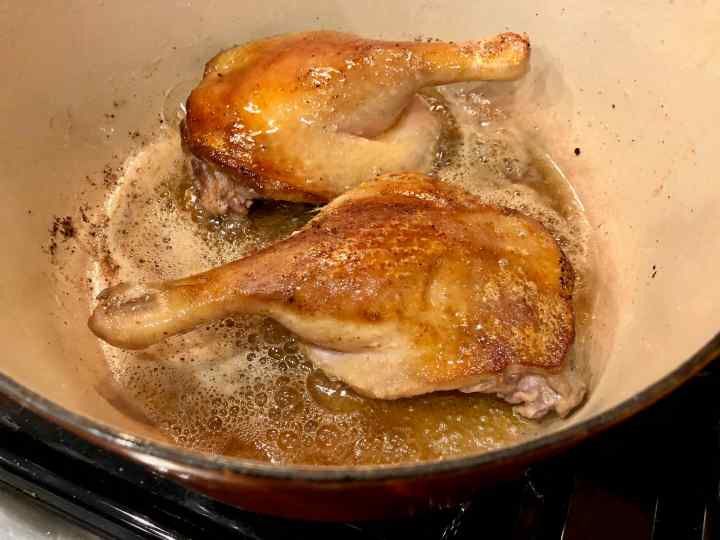 3. When the butter is sizzling add the duck legs skin side down. Cook for 3 to 4 minutes on each side or until lightly browned. Remove from the pot and set aside.