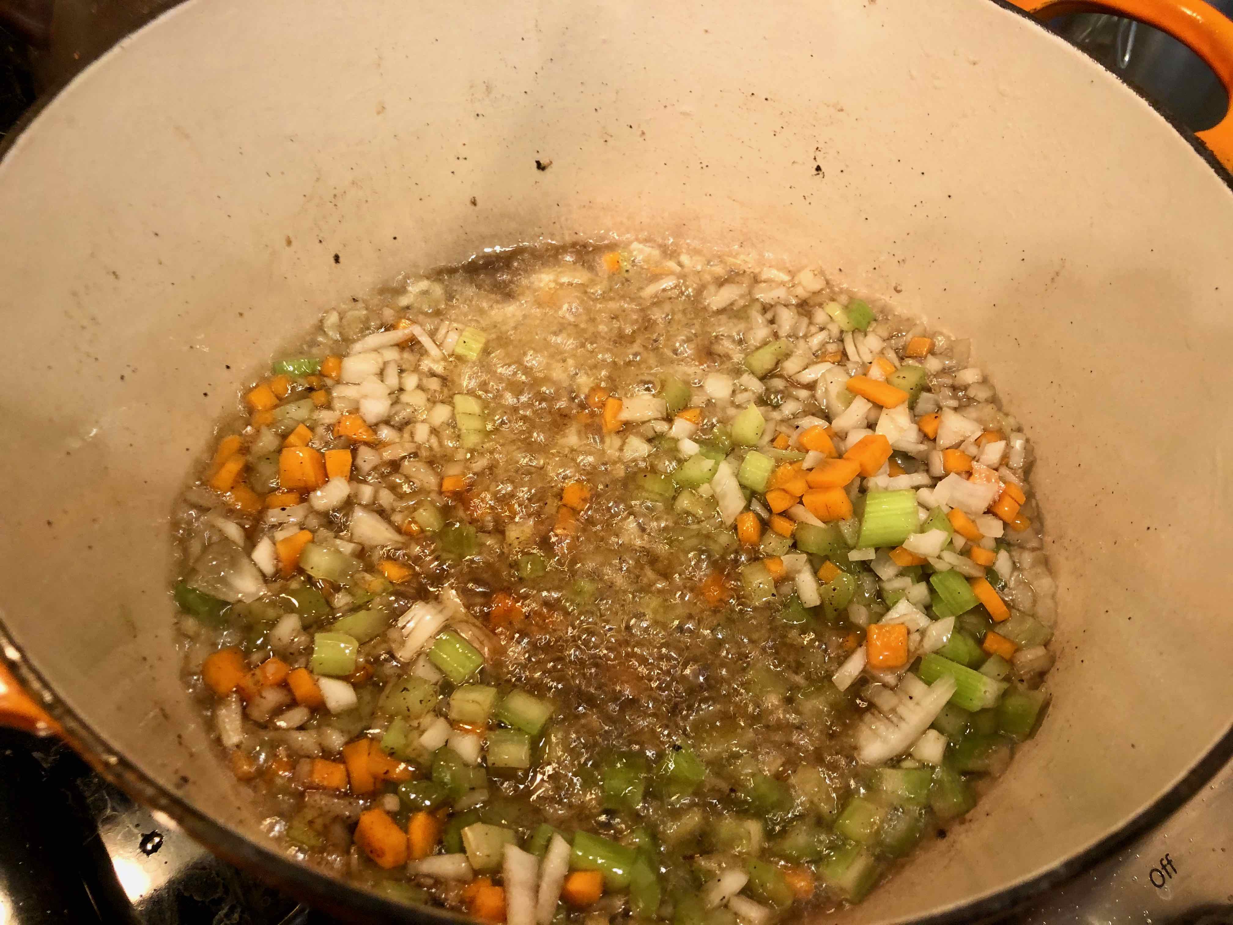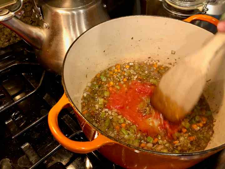 4. Reduce the heat just under medium and add the vegetables to the pot. When the onions become translucent, add the tomato sauce and water.
