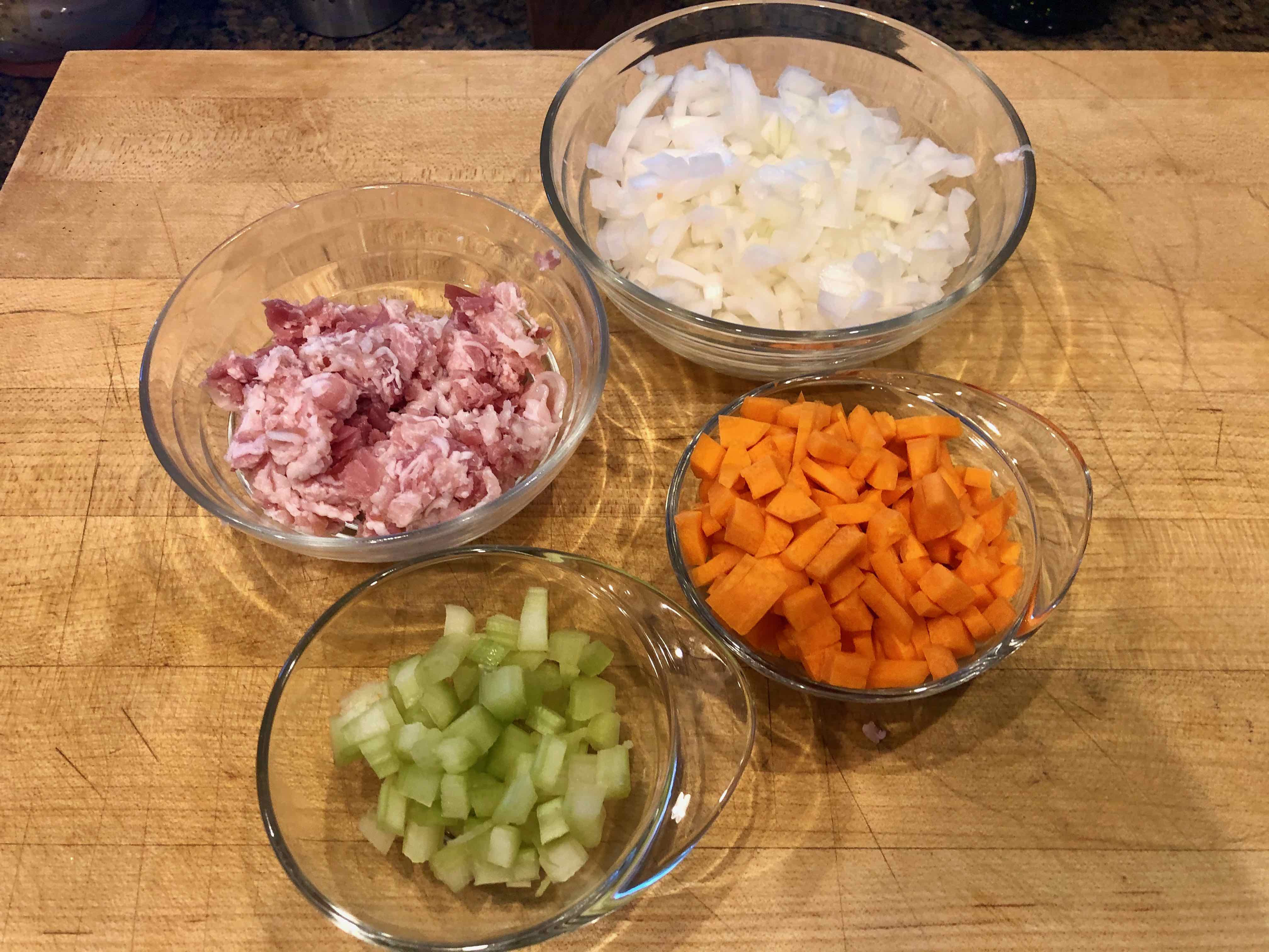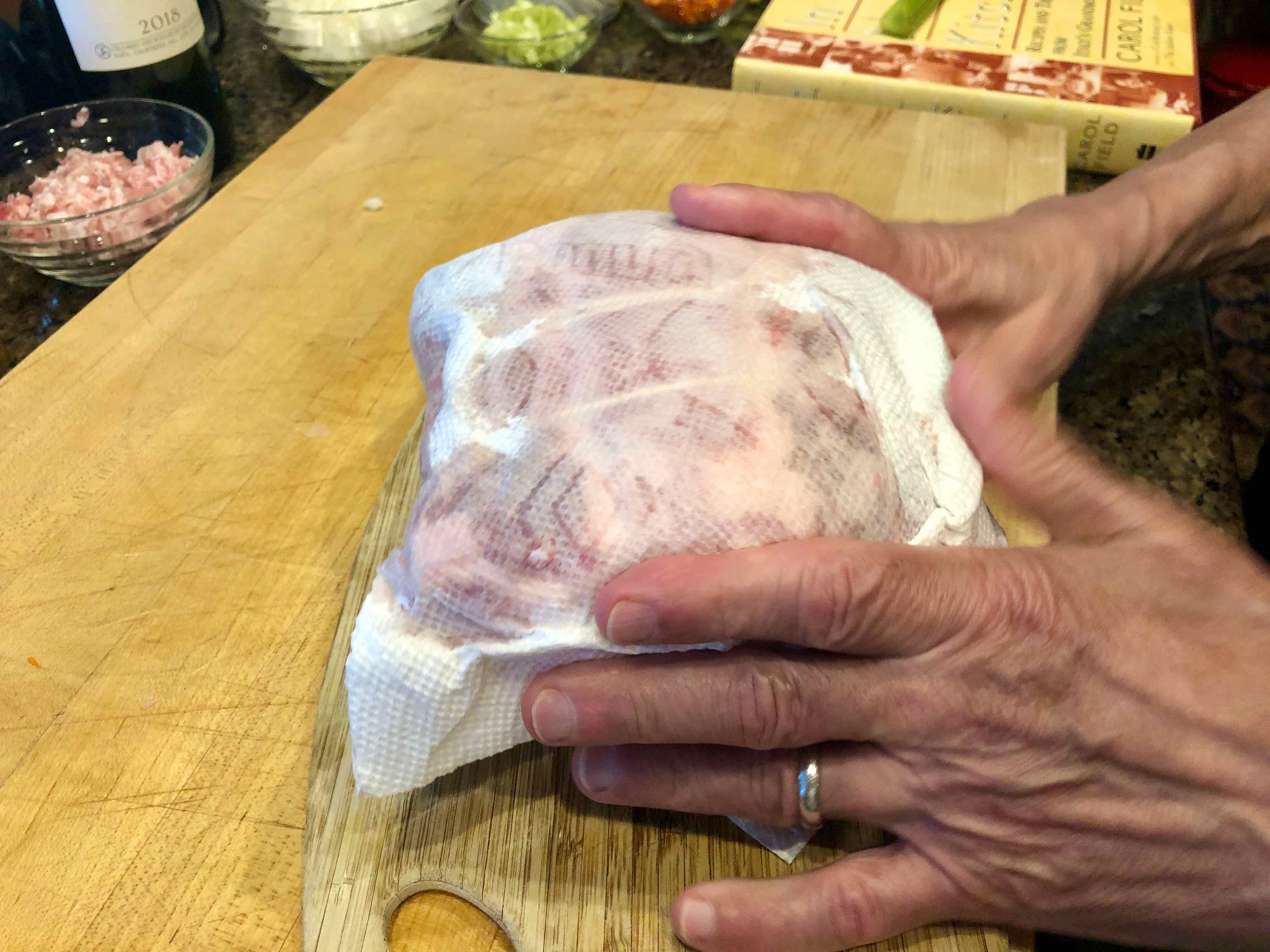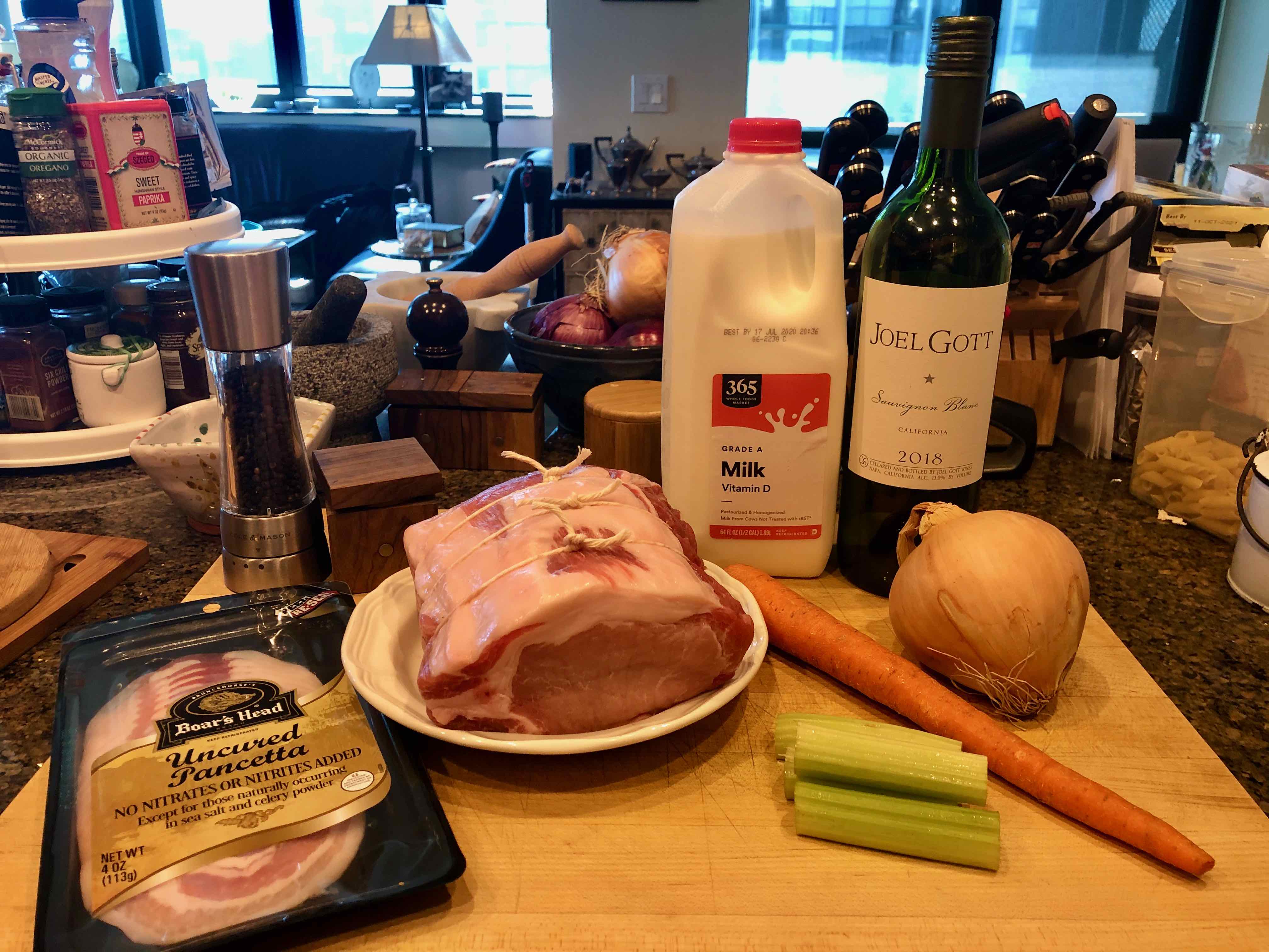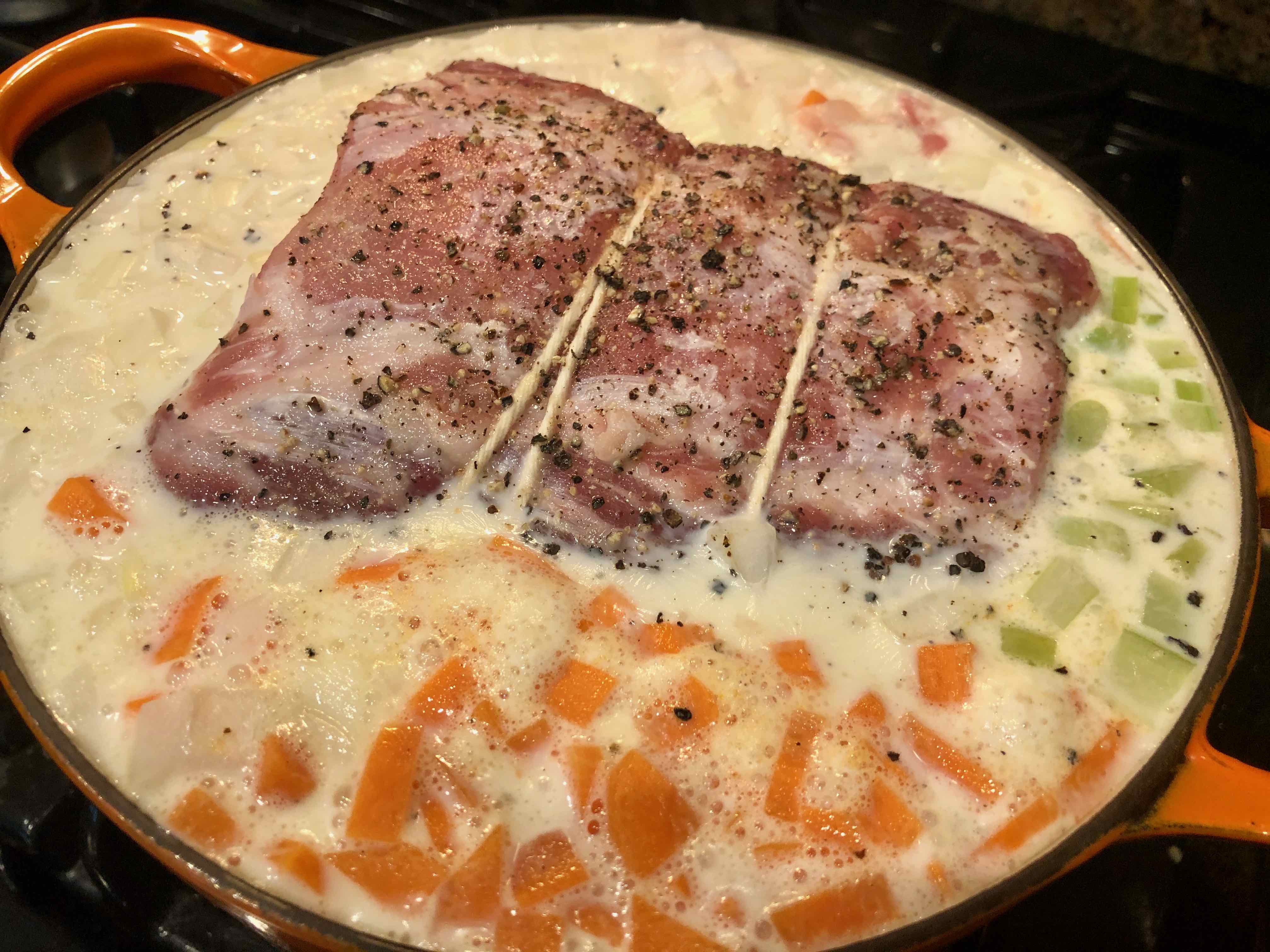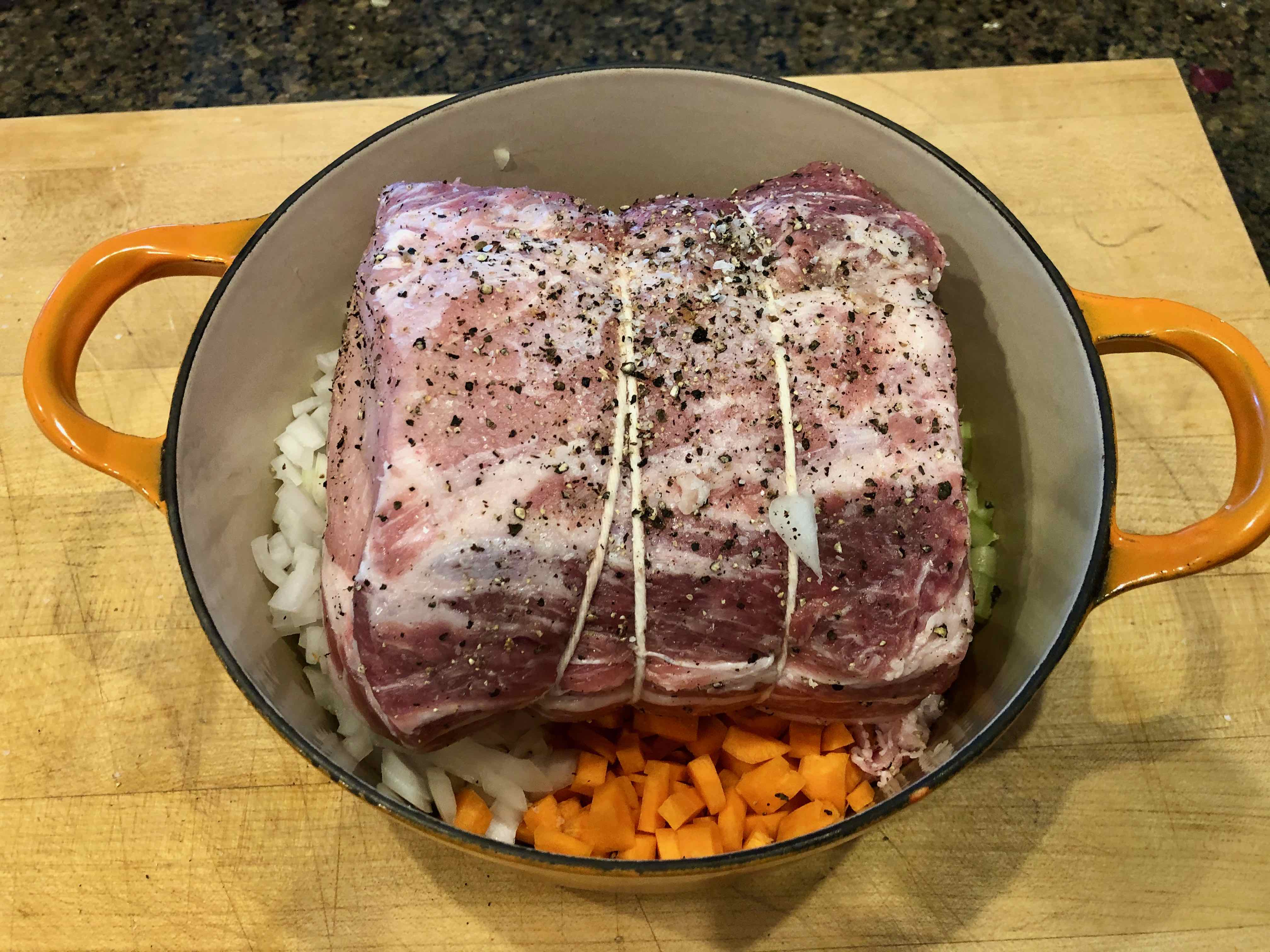 3. Put the pancetta, carrot, celery and onion with the pork in a heavy enameled casserole or Dutch oven just large enough to hold the meat.