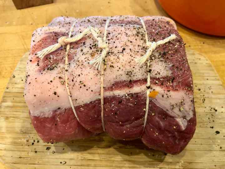 1. What I especially like about Marcella’s version is that the roast in browned before the braise and consequently looks better than the one from this recipe. This recipe, on the other hand, yields a dish with far more flavor and a better sauce. As I said in my intro, my next attempt will be a hybrid of the two recipes.