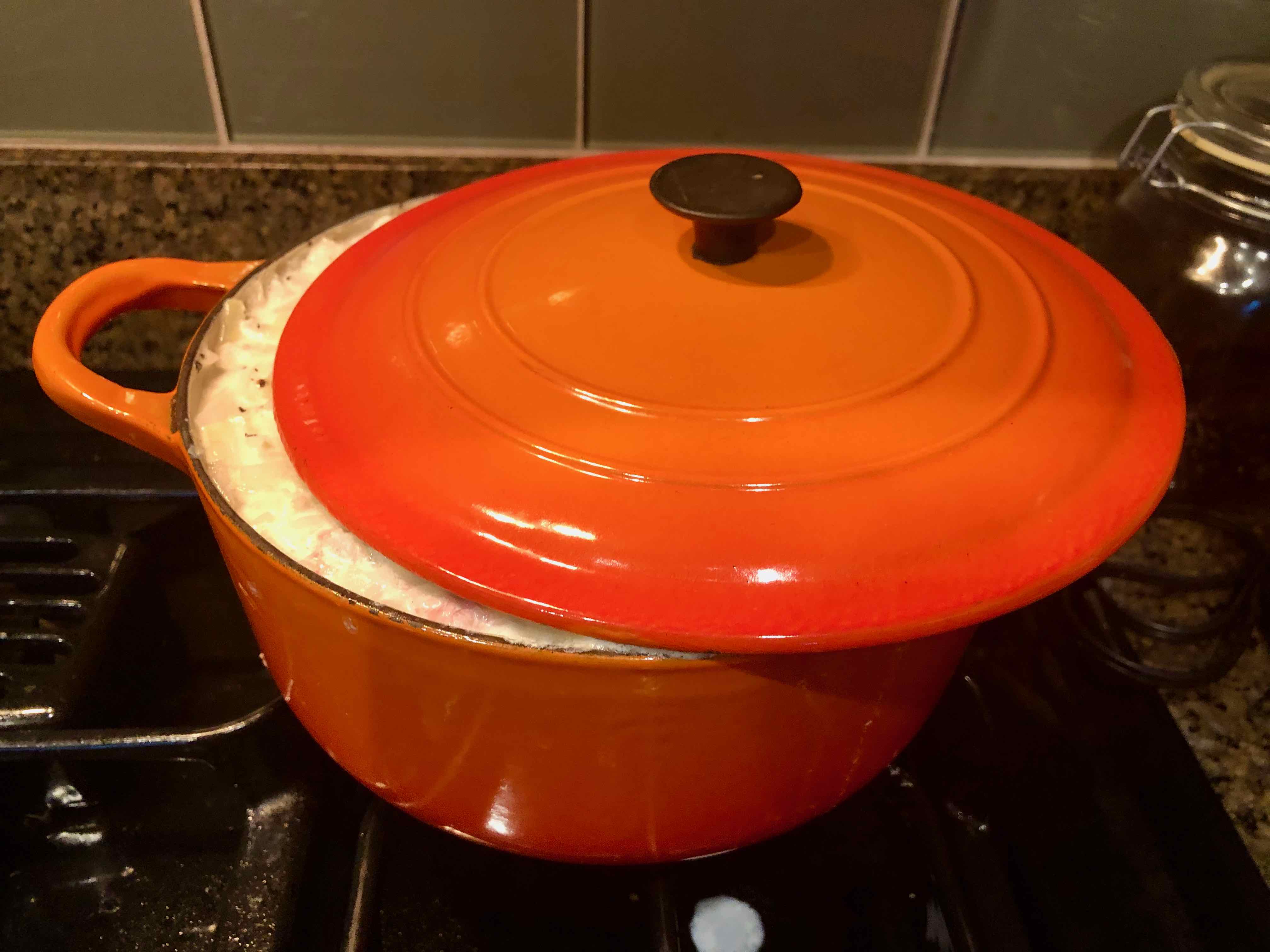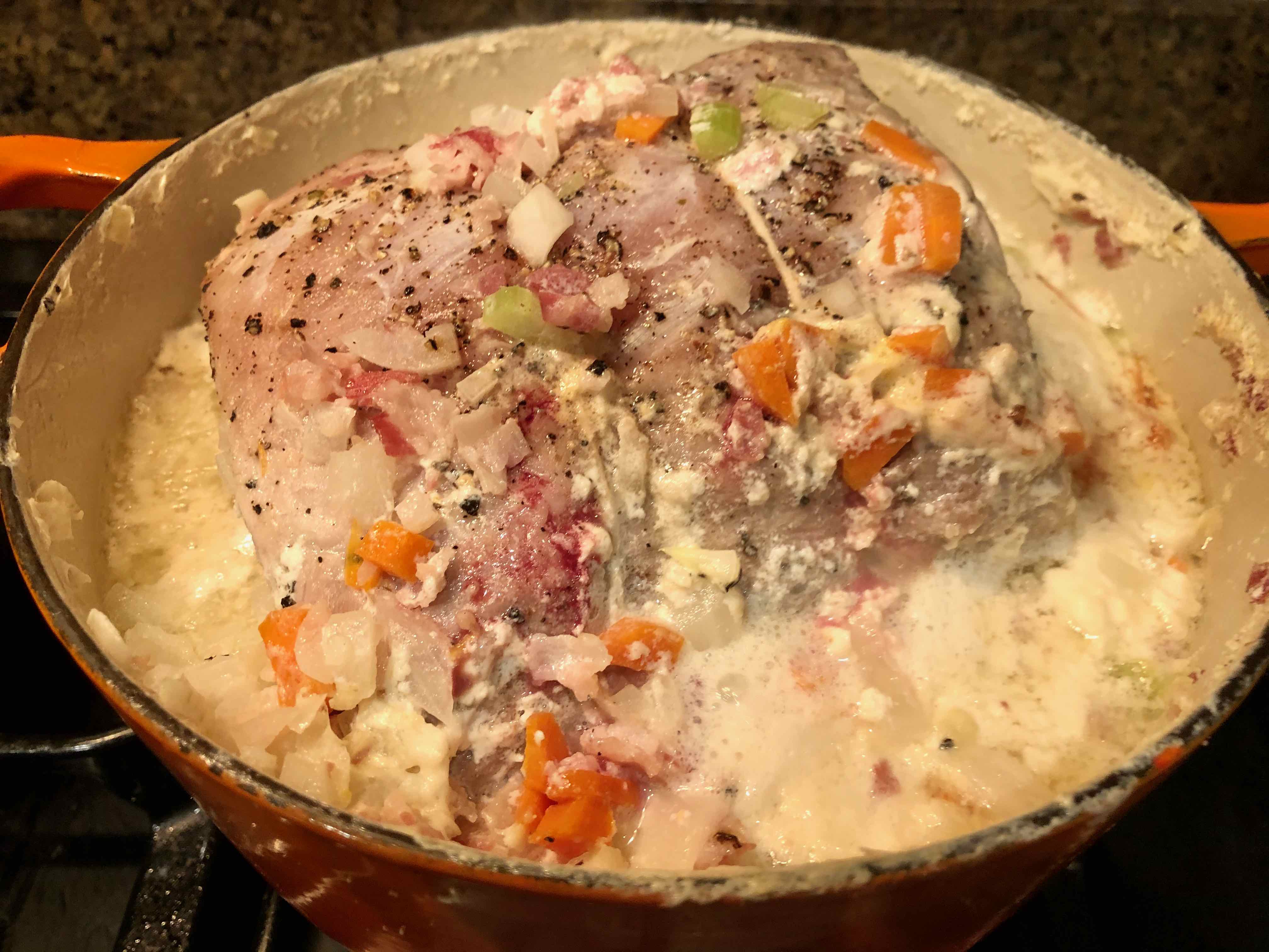 4. Pour in the milk. Let it come to a slow boil. (Do not over fill the pot. As long as ¾ of the roast is submerged, it should be enough.)