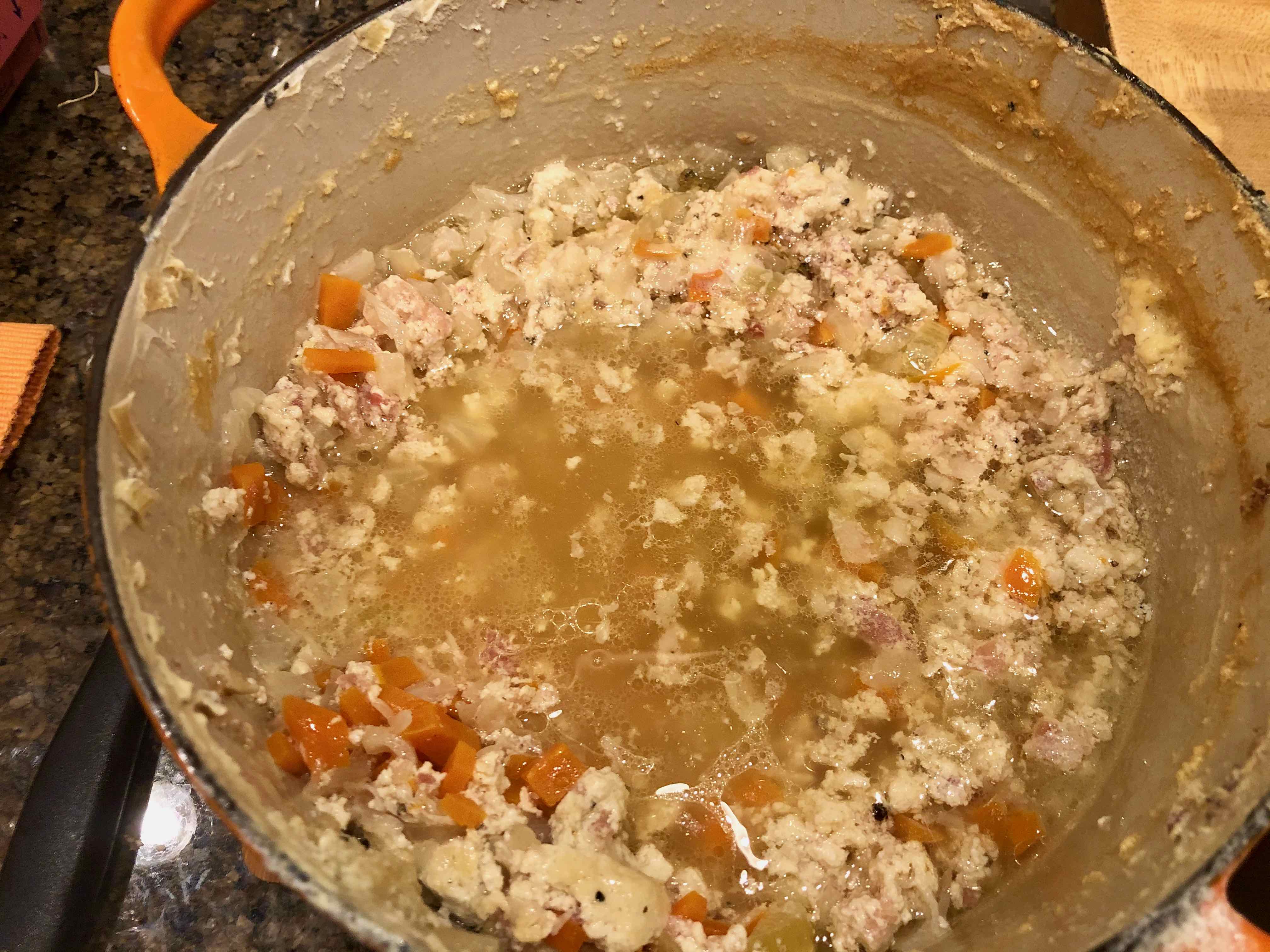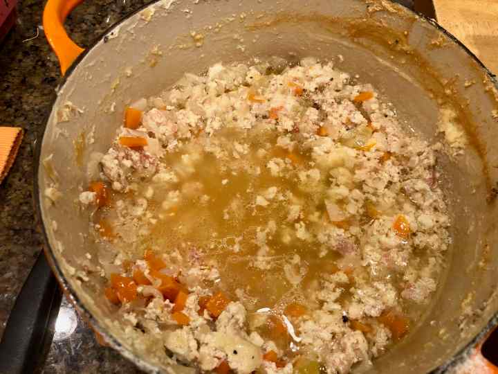 9. Add 1/3 cup white wine to the cooking pot and boil it over high heat, scraping up any loose cooking residues from the pot with a wooden spoon. Taste for salt and pepper. Don’t be surprised if there aren’t any residues. Simply reduce the wine. You may have only enough pot juices for a few slices of meat.