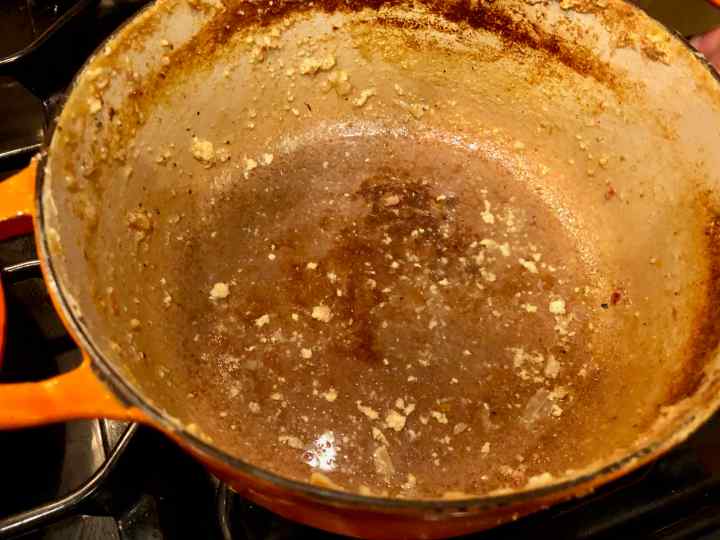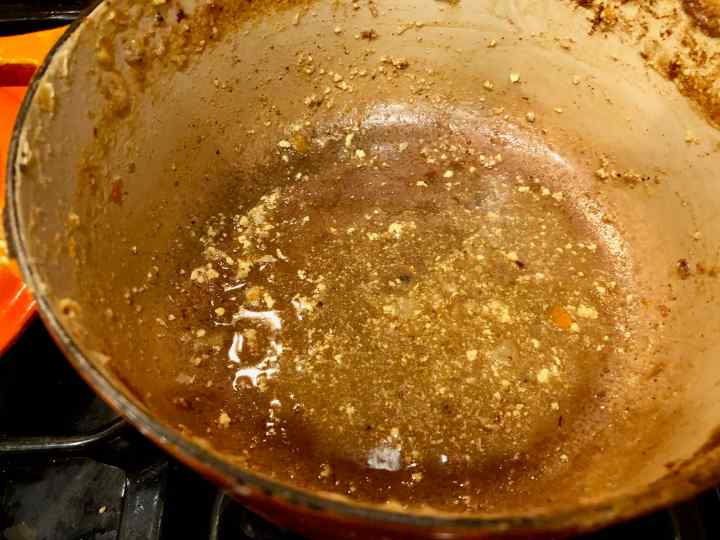 7. Raise the heat and cook down the sauce until almost all the milk has been reduced to a thick collection of light brown clusters. (This step took 15 minutes to complete.)