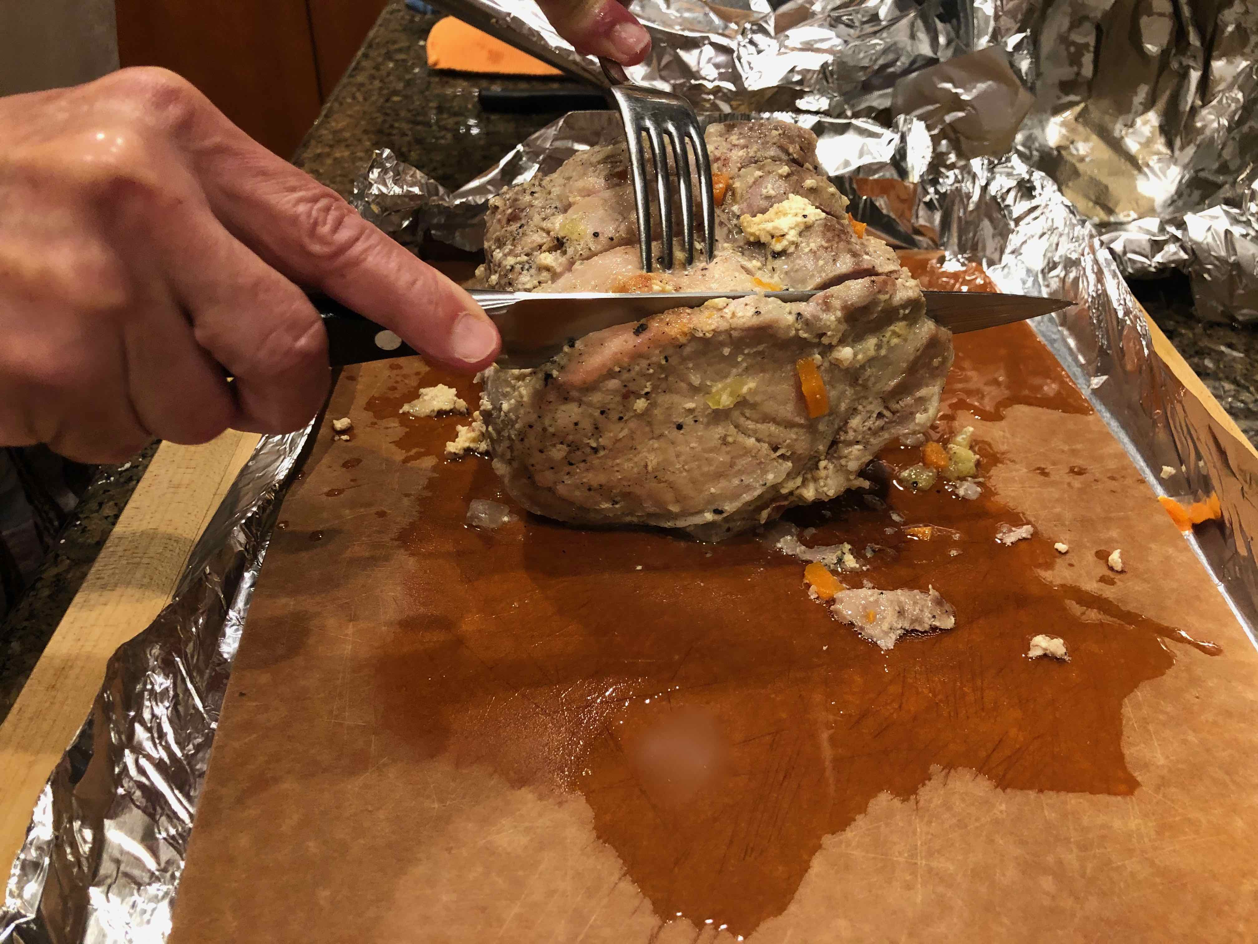 I should point out that I did have some problems with Field’s recipe. I was surprised that only seasoning she calls for is tasting the pan sauce for salt and pepper after the meat has been cooked and removed from the pan. I chose to season my roast liberally before adding it to the pan. Another problem was the amount of milk called for. I started with the recipe’s 4 cups, which came up to the brim of the pot, only to find when I returned to check on the roast, the milk had overflowed and created a mess on the stove top. The final challenge came with deglazing the pan with wine, which was supposed to provide “pot juices” to drizzle over the meat, while the sieved sauce was served on the side. The trouble was there was almost nothing at the bottom of the pan to scrape up. It left me thinking that perhaps the meat should have been browned either before the braise or perhaps even after it.