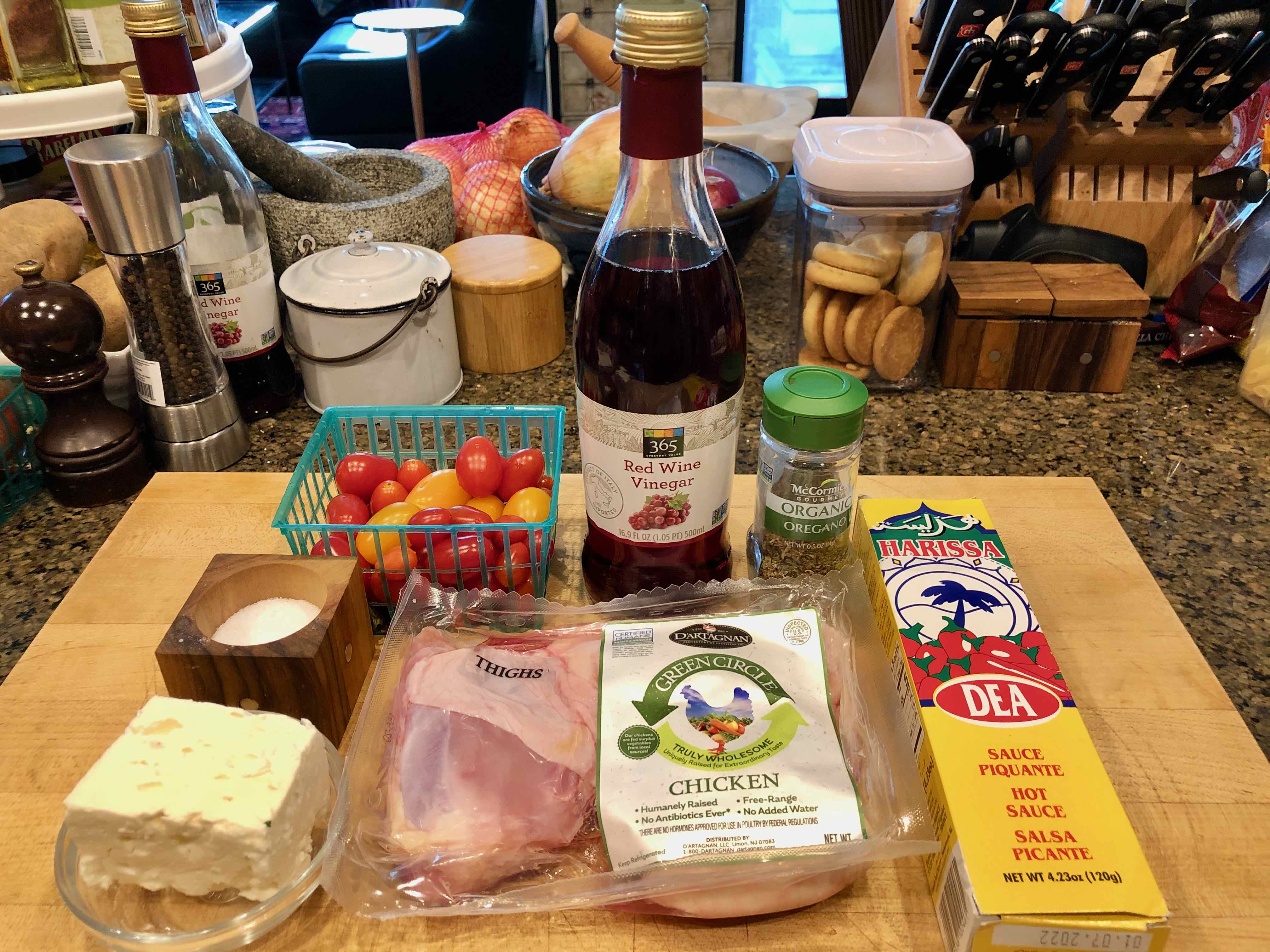As I only had three chicken thighs, I pretty much halved the recipe, except for the harissa with which I may have gone a bit overboard as I like its heat. I also departed from the recipe in several ways. To avoid sticking, I lightly oiled the skillet before placing the chicken in it. I also added some white wine after the tomatoes had burst to loosen the sauce and deglaze the plan. Since I wanted to warm the cheese, I added the feta immediately after taking the chicken off the heat rather than waiting five minutes. Finally, for fresh oregano I substituted dried in the sauce as well as chopped parsley for the garnish.