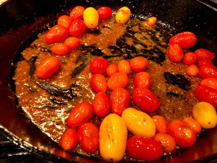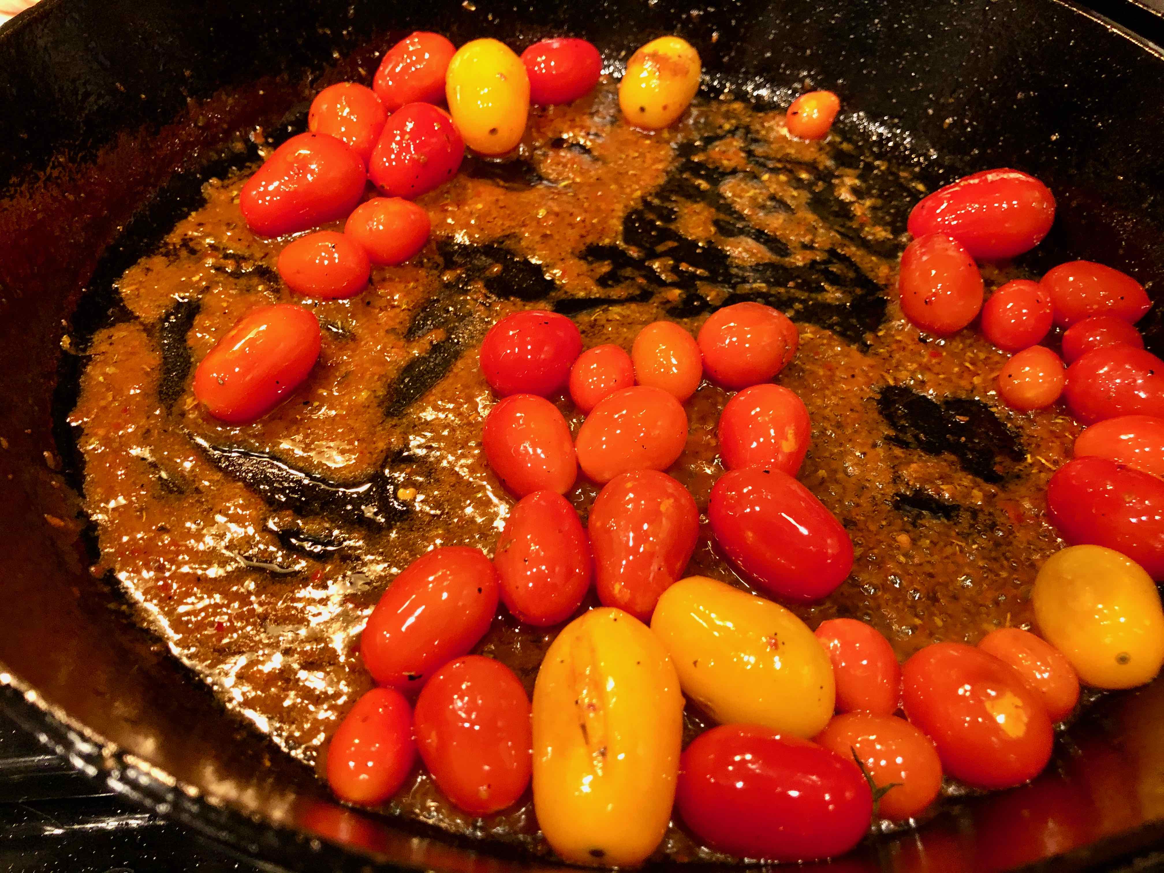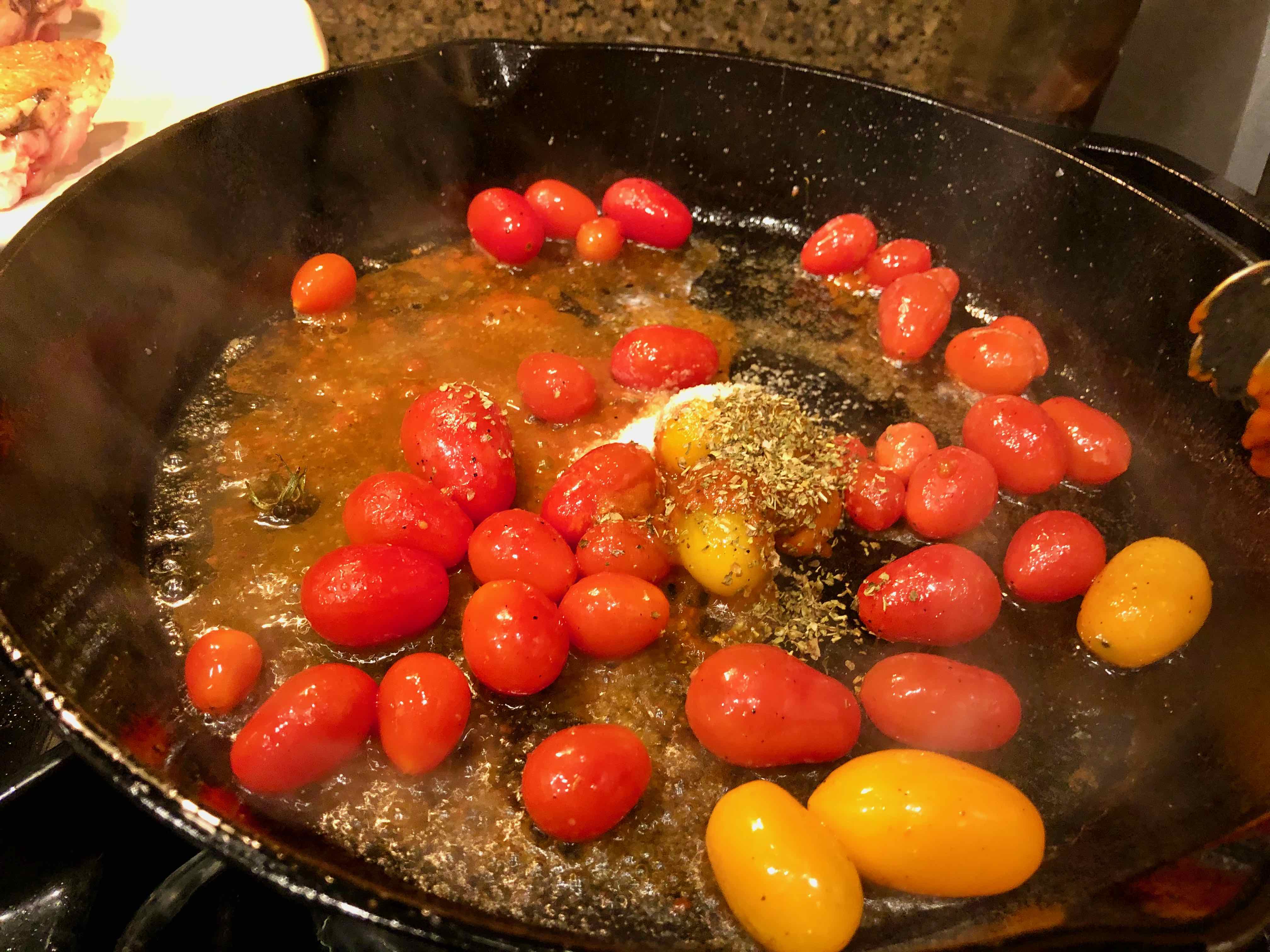 Such was the case yesterday, when I saw some delicious grape tomatoes that were just beyond their prime, a half piece of feta that I couldn’t remember when I had opened, and some defrosted chicken thighs that were in the back of the fridge.