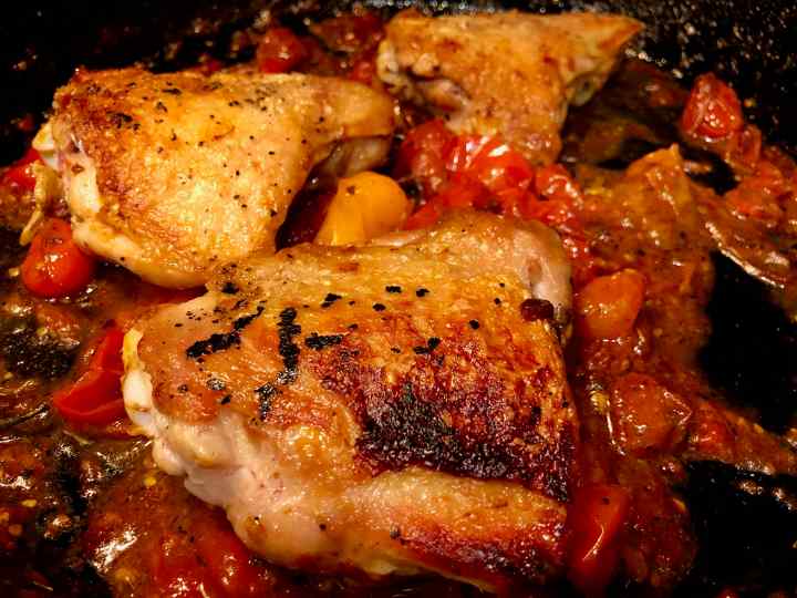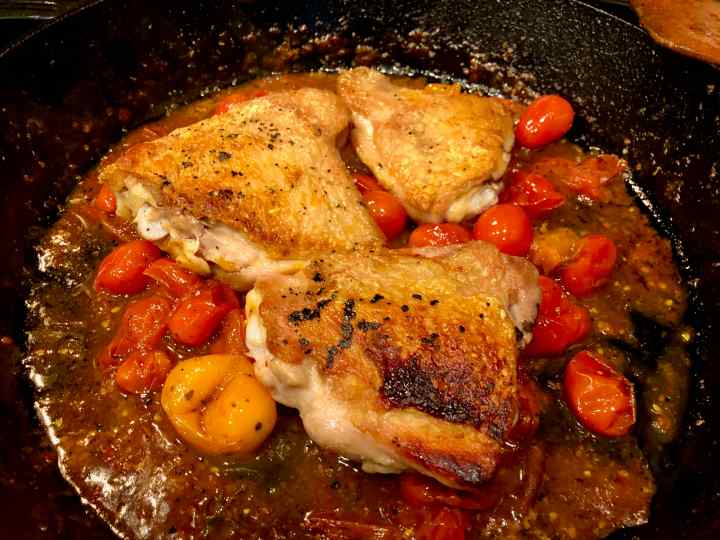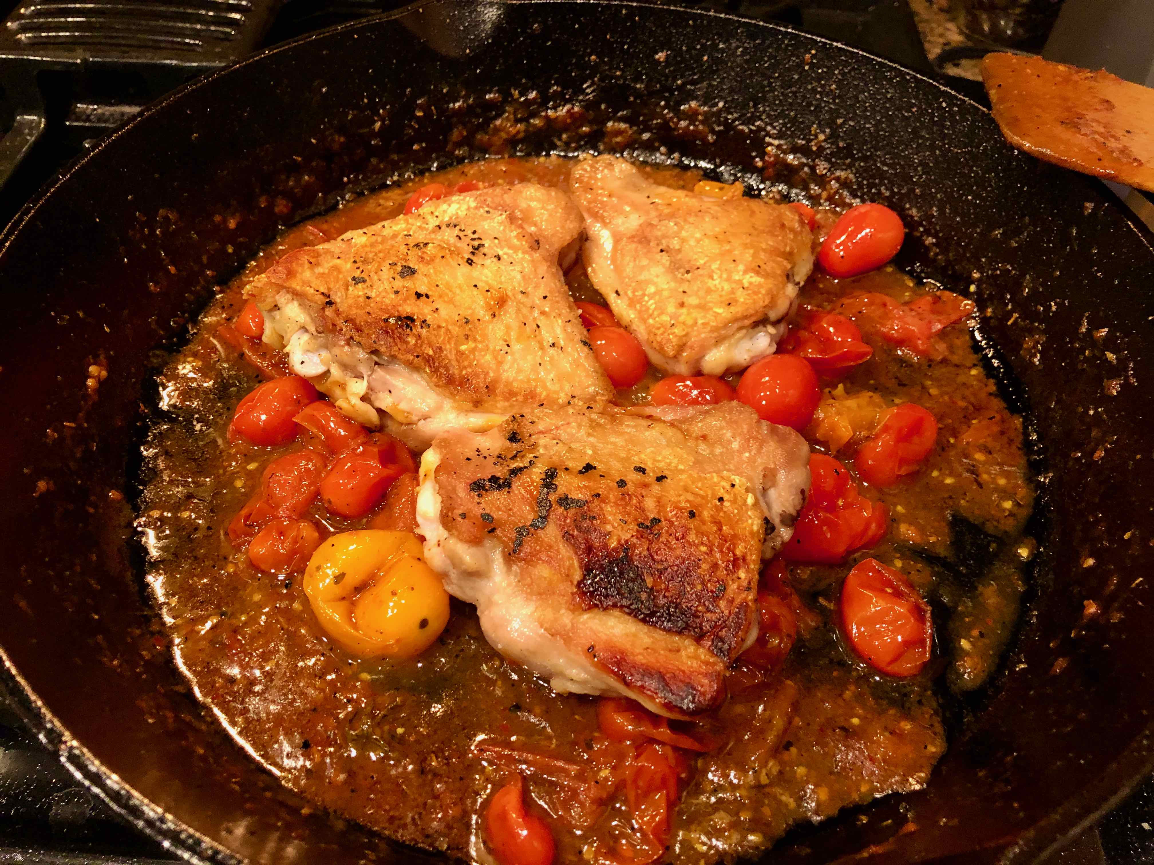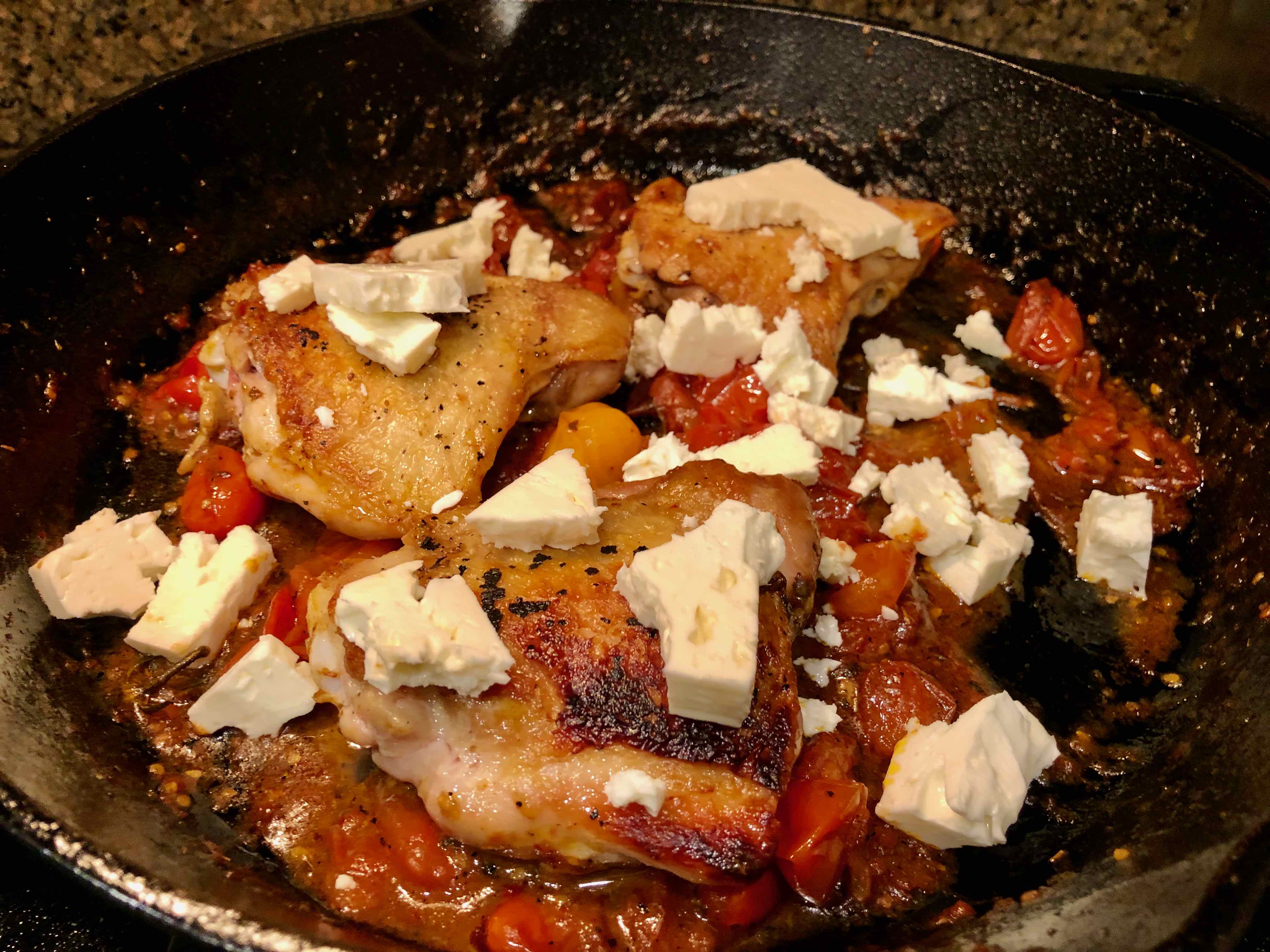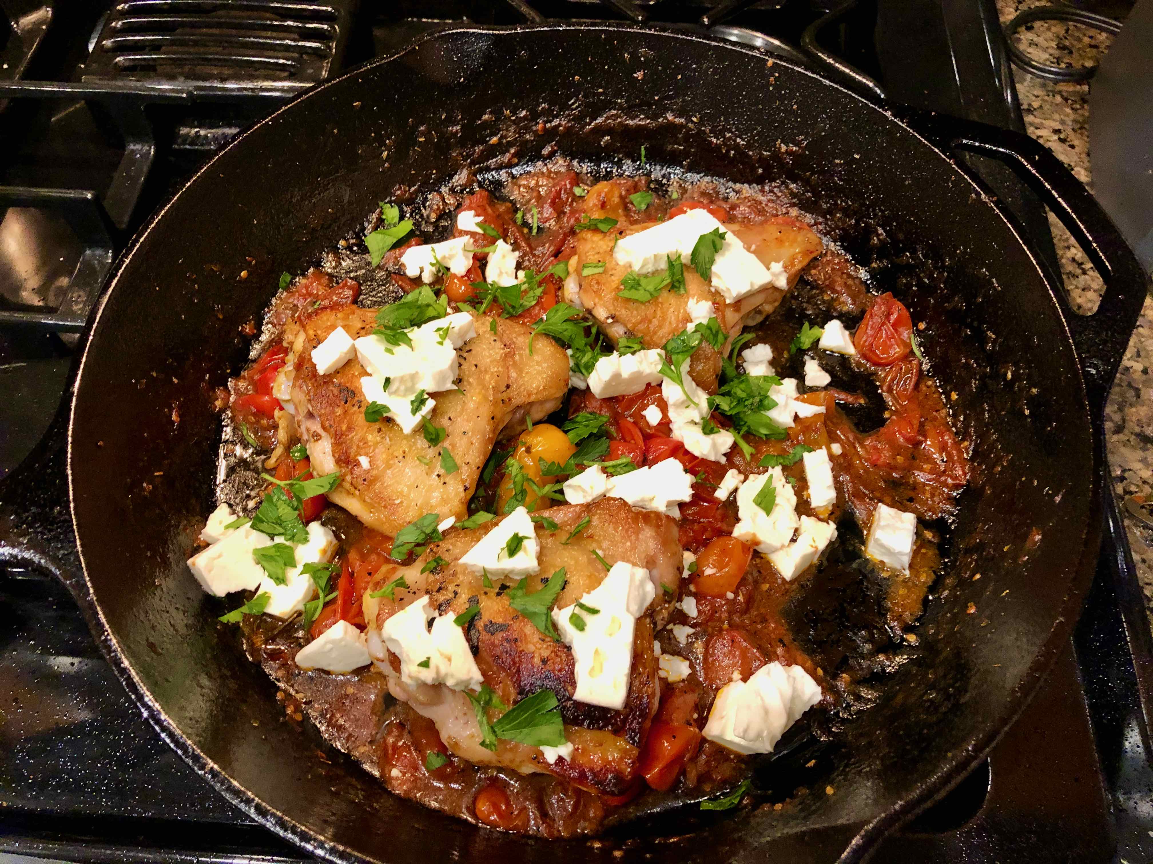 Chicken Thighs with Tomatoes and Feta (adapted from a recipe by Molly Baz in the August 2020 issue of Bon Appétit.)