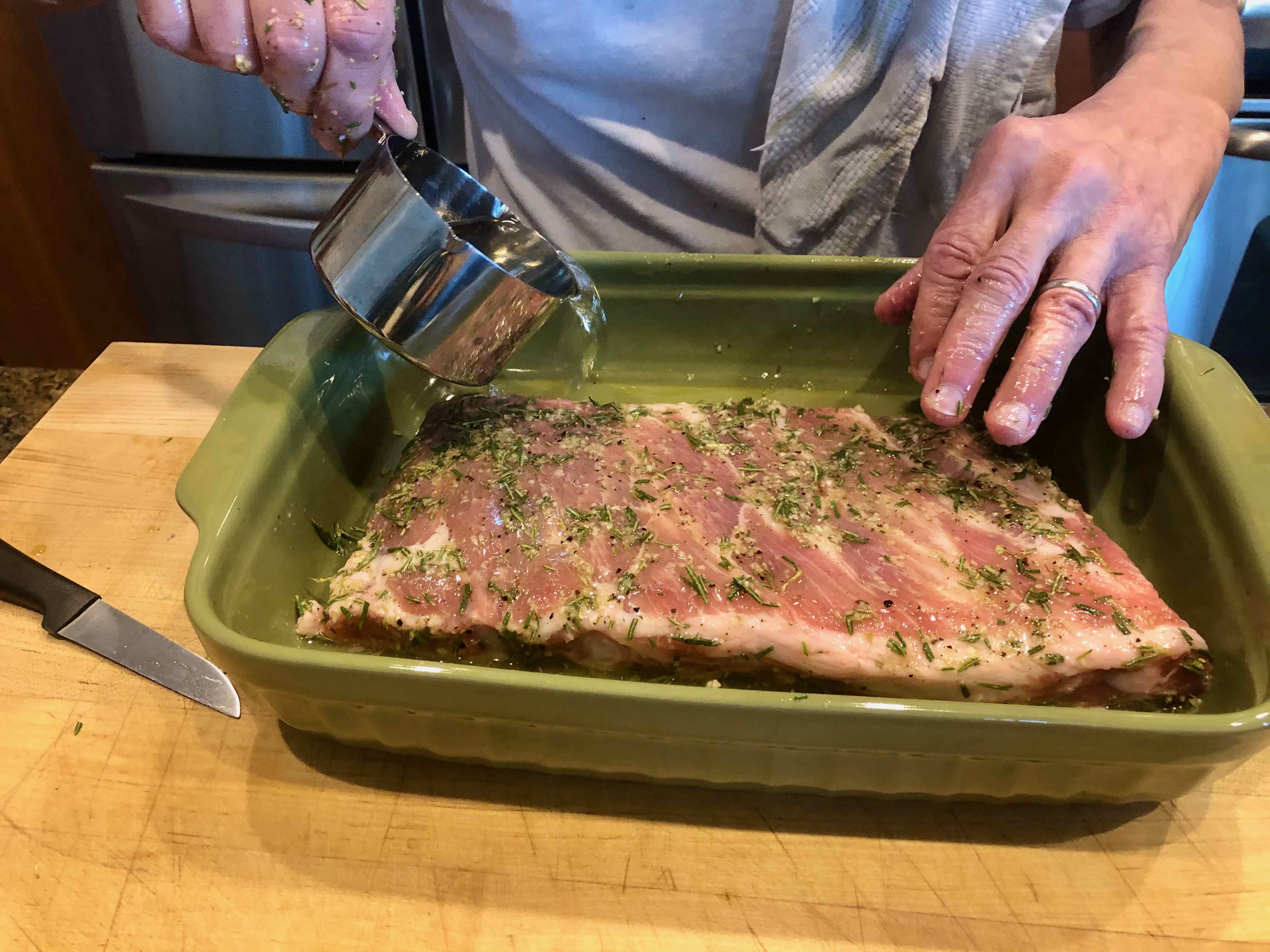 3. Drizzle with one cup of the wine and let rest at room temperature for 1 hour. Be careful not to let the wine wash the rub off the ribs.