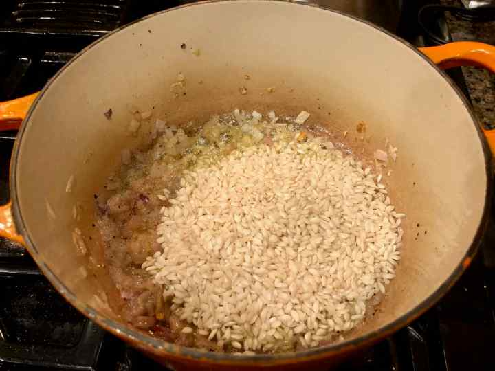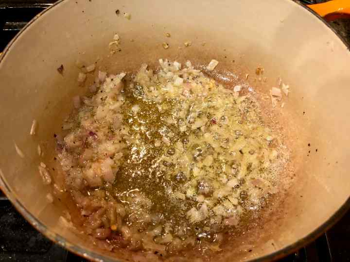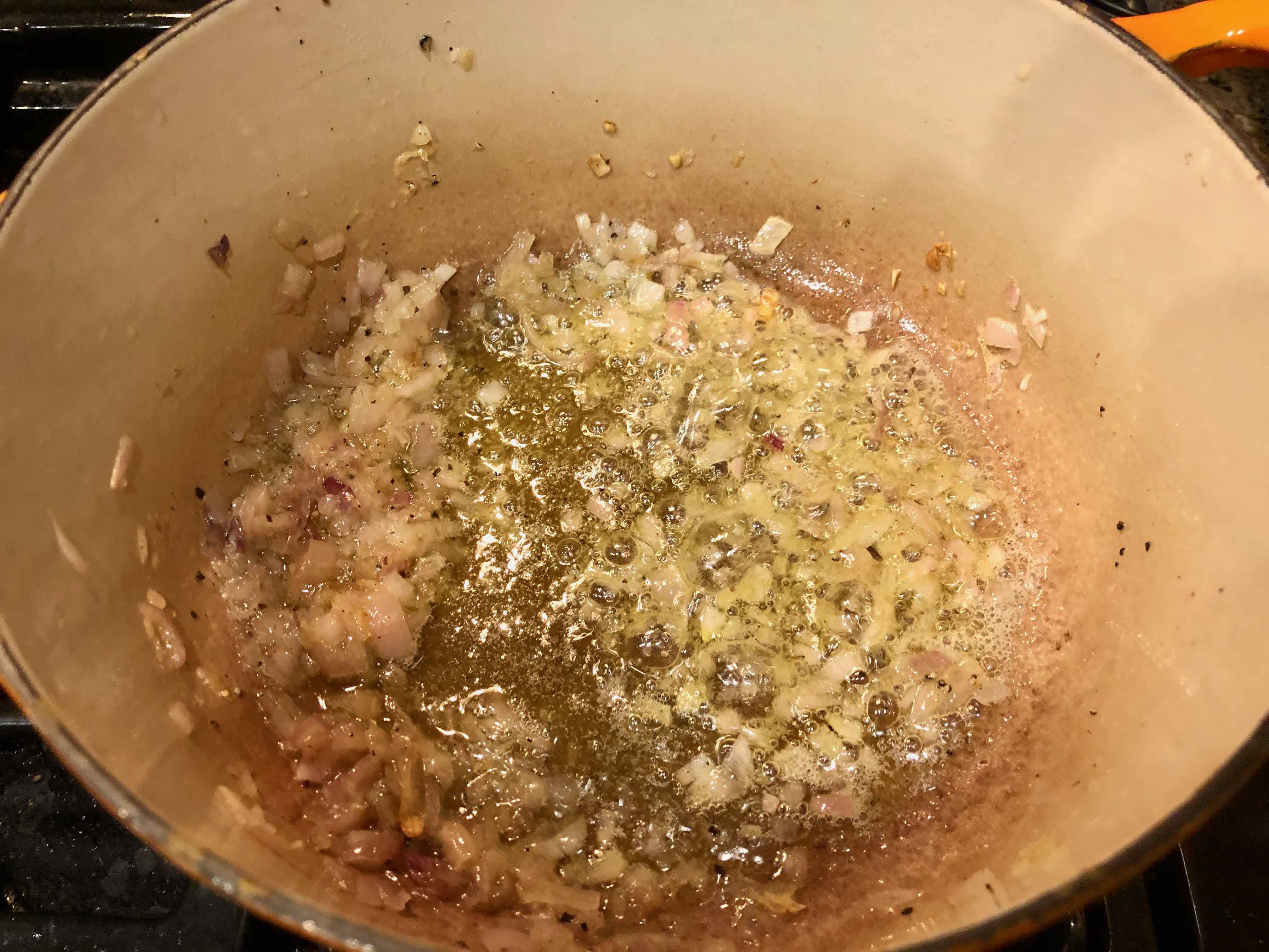 1. Put 2 tablespoons olive oil and 1 tablespoon of butter in a heavy-bottomed saucepan over medium-high heat, then add the onion, and season generously with salt. Add pepper to taste, and cook until softened, about 5 minutes. (Because I decided to use butter in this recipe as I was cooking, the first photo below only shows the olive oil.)