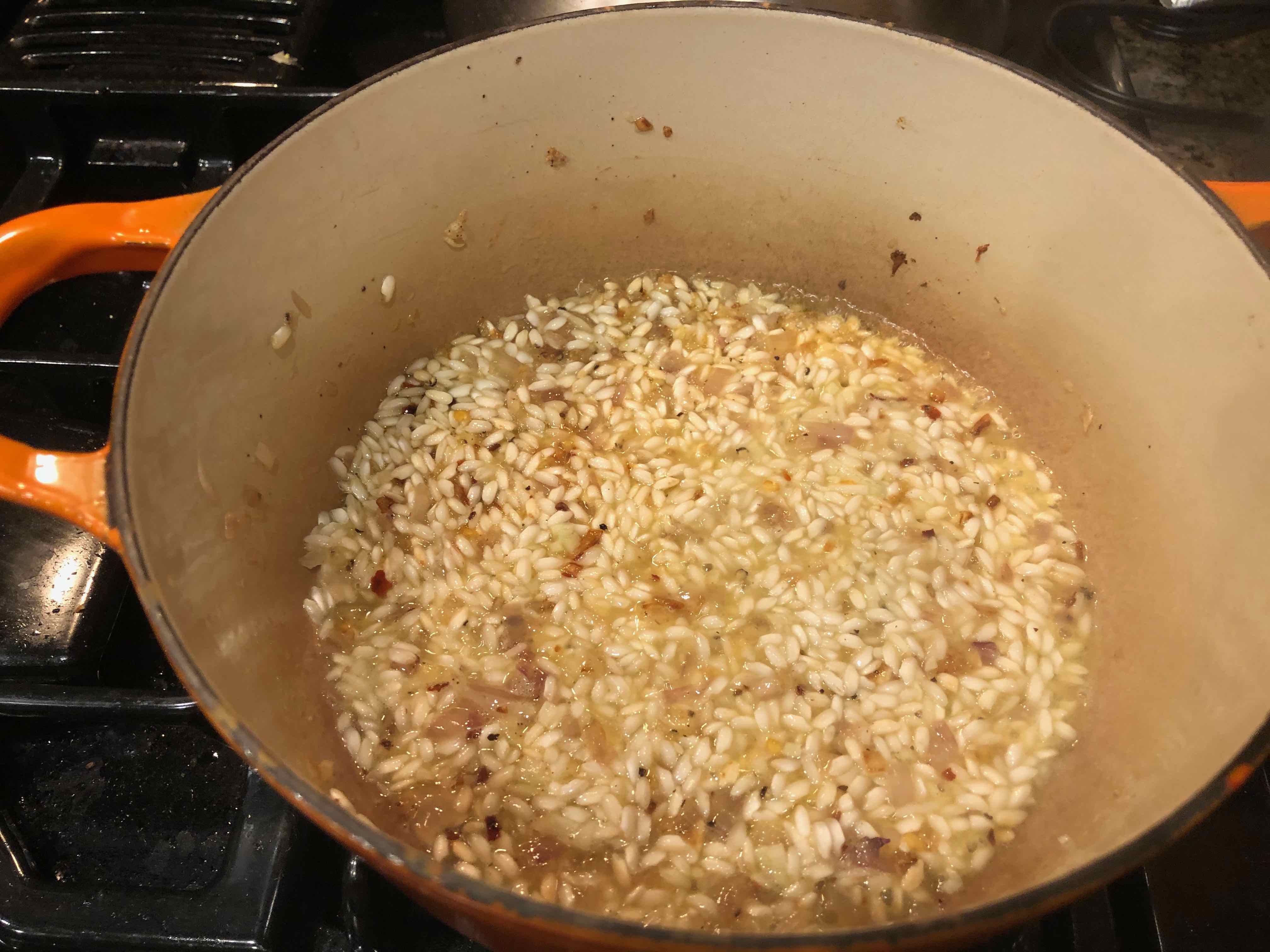 2. Add the rice and cook the onions, stirring, until the onions are barely brown and the rice is coated with the fat, about 2 minutes. Add red-pepper flakes, garlic, white wine, and cook until most of the liquid has evaporated, about 2 minutes more.