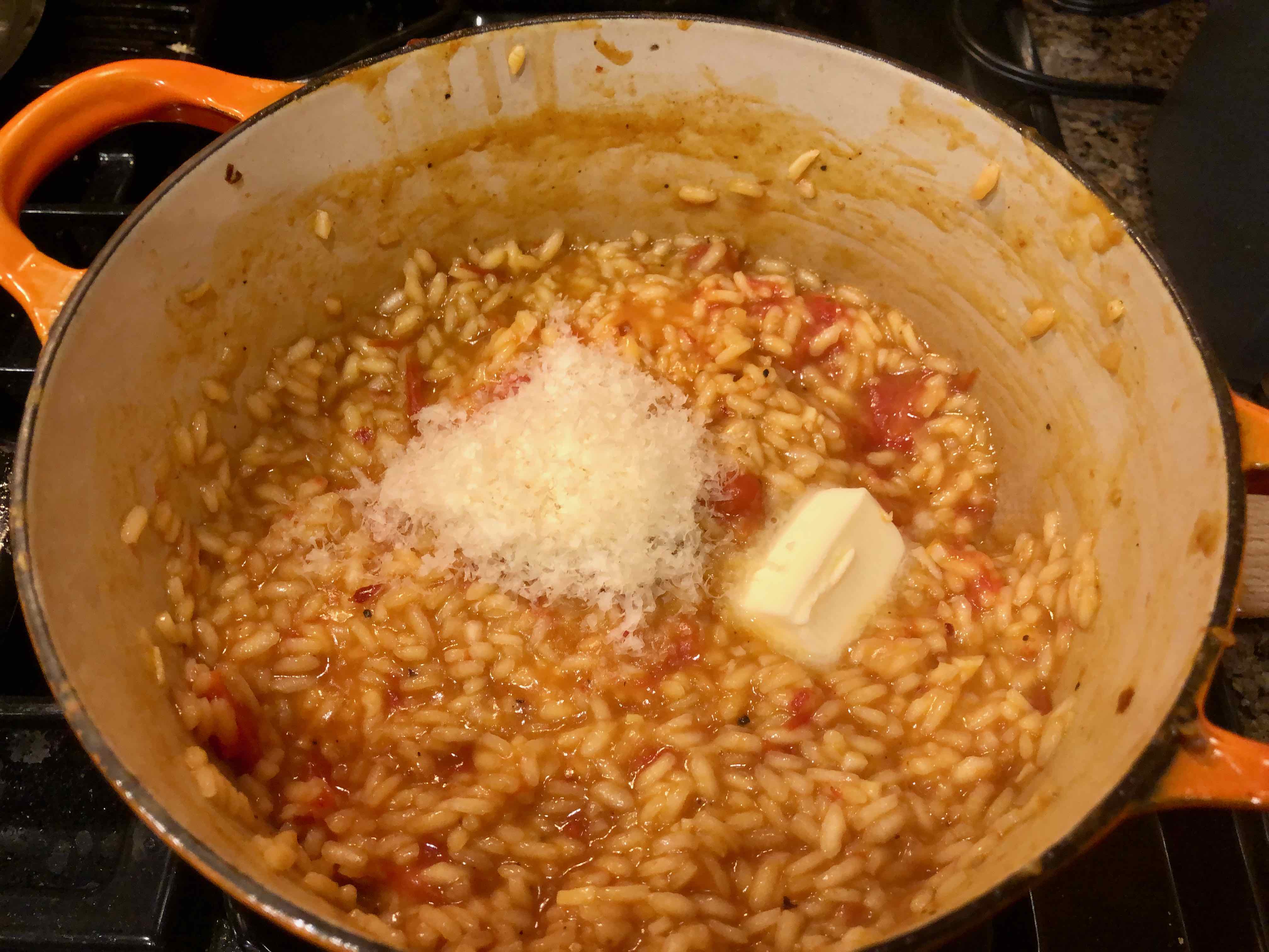 As I stood there considering how to use them, Andrew suggested a recipe he had come across in The New York Times for a tomato risotto and brought it up online. It looked pretty good and after checking my pantry, I had all the ingredients but one—vegetable broth. No big deal, I’d substitute chicken, which went contrary to the recipe’s being more vegetarian. And that’s when I decided to throw in some butter as well. After all, what’s risotto without any butter?