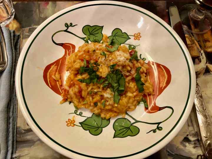 Despite that this was a rather impromptu choice of recipes that I modified as I went along, our risotto was spectacular, far better than either of us had expected. Andrew commented “Out of this world!” The rice, saturated with concentrated tomato flavor, was perfectly al dente; the sauce, silky smooth. The Parmigiano added a hint of nuttiness, and the basil, a subtle floral note.