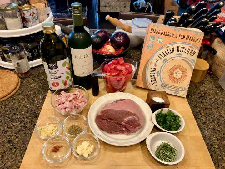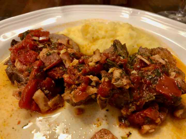 The original recipe called for the meat to be served with homemade wide egg noodles, buttered and sprinkled with Parmigiano, but I substituted a creamy polenta. Other substitutions included fresh tomatoes for canned Italian style and bacon for pancetta.