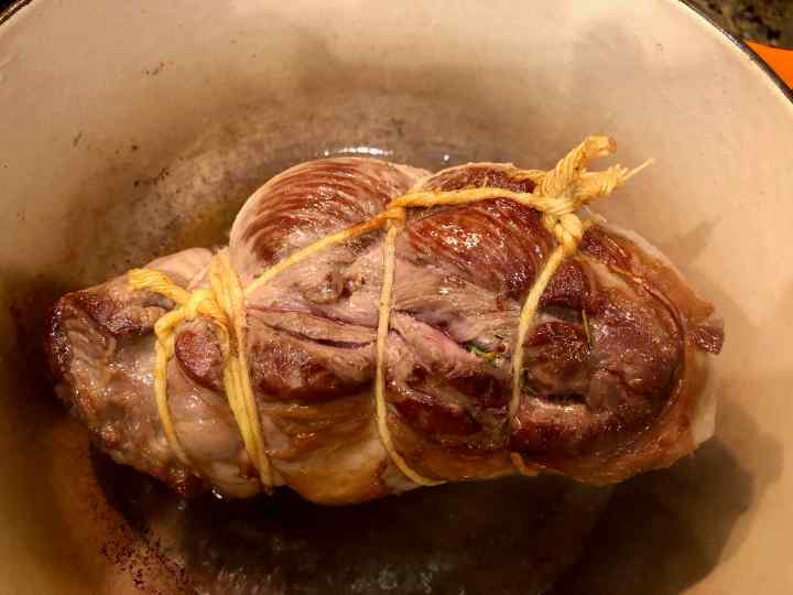 11. Remove the strings from the lamb and carve into thick slices or chunks and serve on warmed plates, with polenta or noodles.