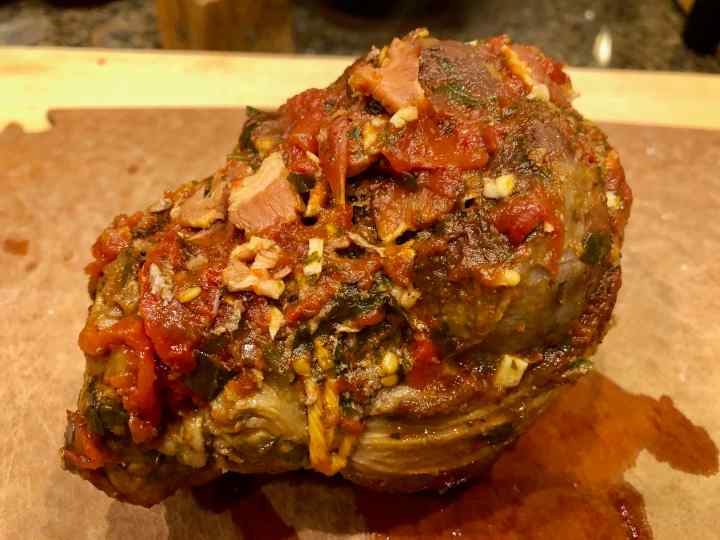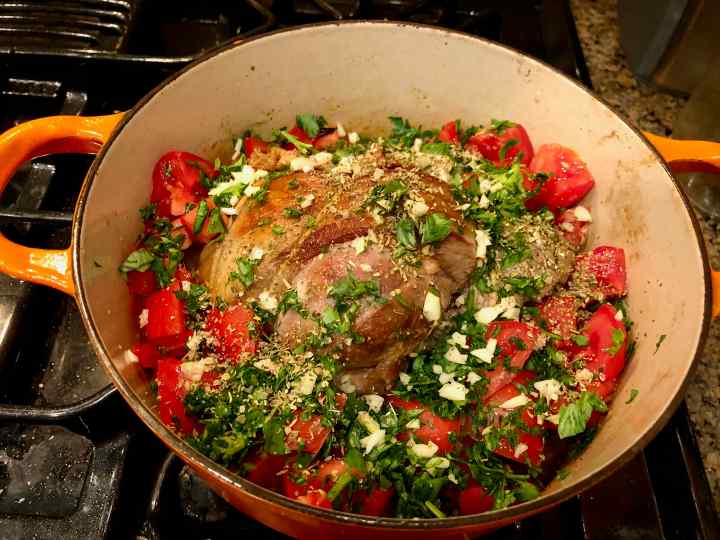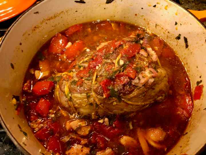 Eventually, I found a recipe that seemed custom made for these ingredients in Diane Darrow and Tom Maresca’s Seasons of the Italian Kitchen: “Braised Lamb Abruzzi Style.” Although this dish would traditionally be prepared with lamb shoulder, the recipe allowed for boneless leg. Moreover, its calling for just a few ingredients would allow the tomatoes and lamb to take center stage.