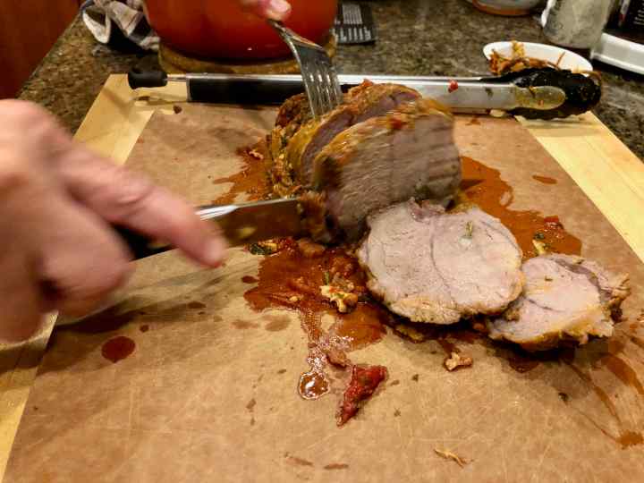 2. Make small incisions in the interior of the roast and insert the slivered garlic.