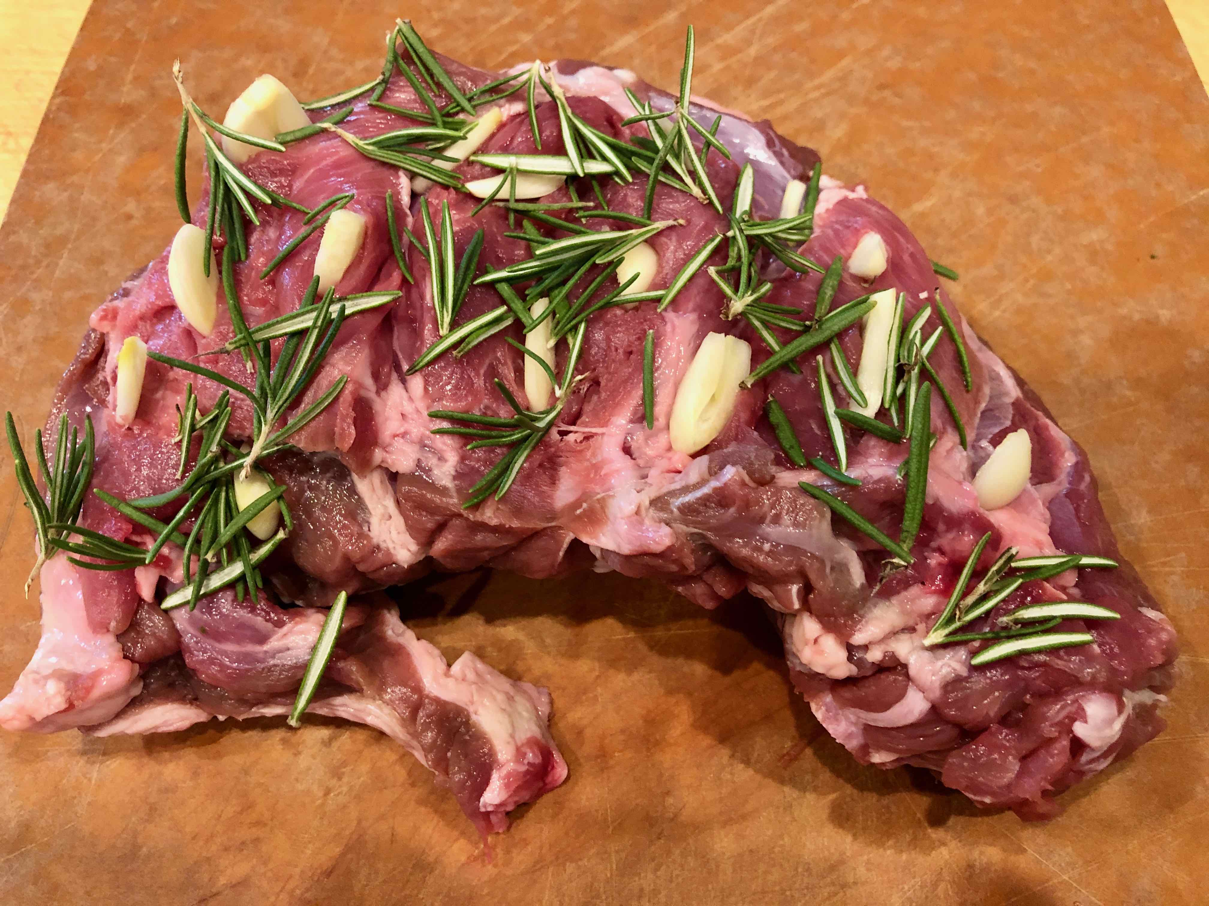 2. Make small incisions in the interior of the roast and insert the slivered garlic.