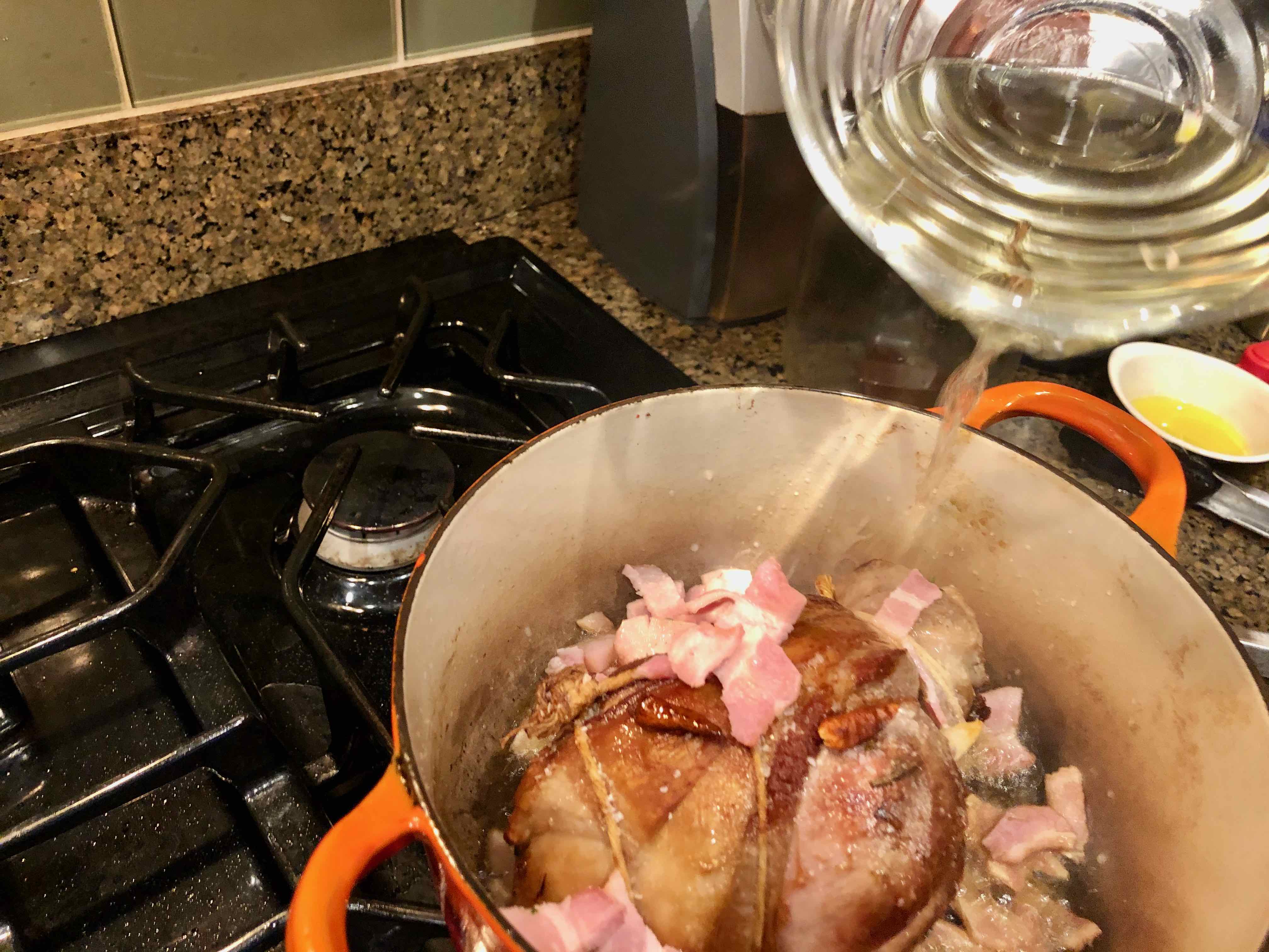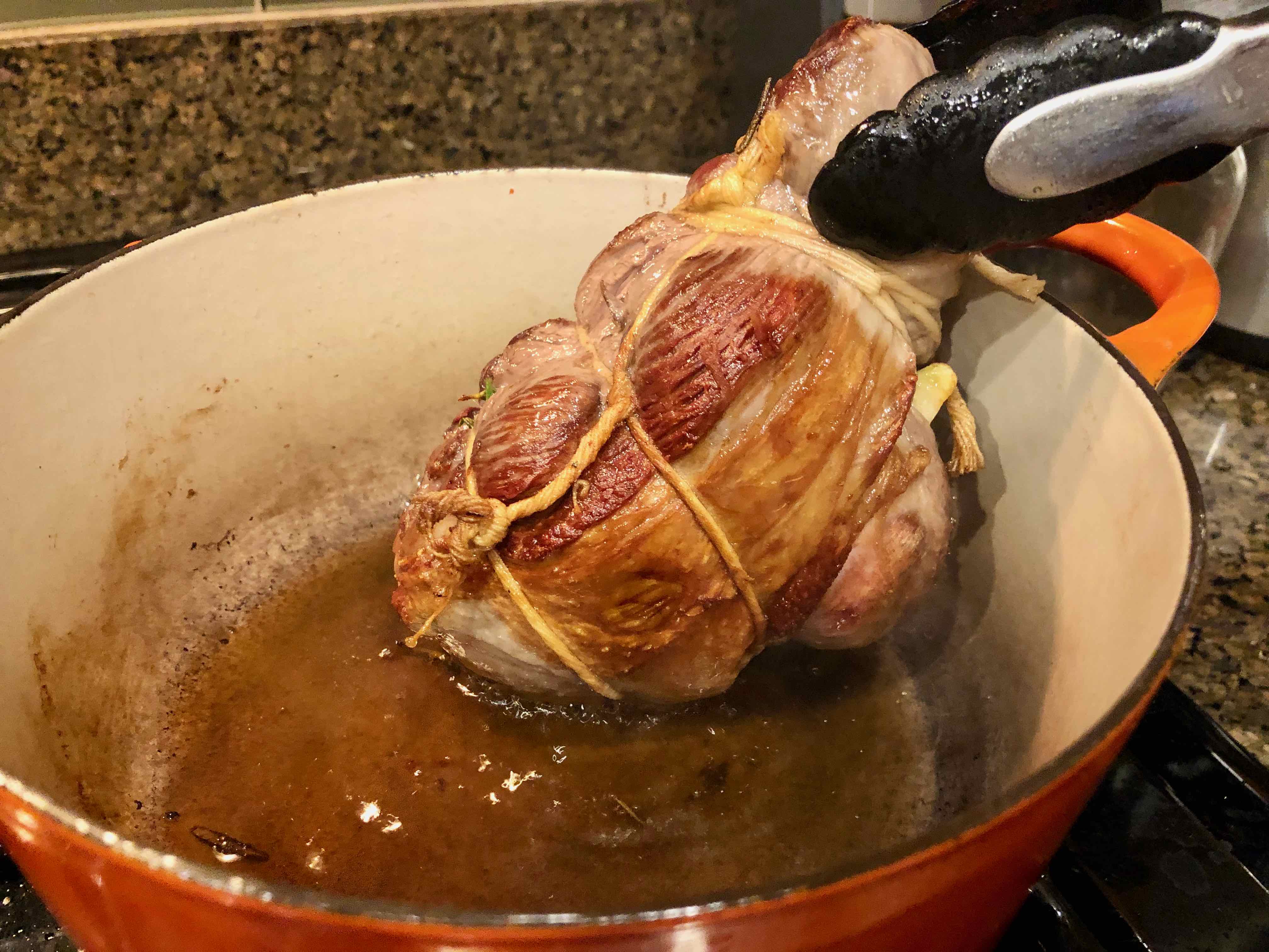 5. In a heavy-bottomed casserole or Dutch oven, just large enough to hold the roast,heat the olive oil and brown the roast on all sides over medium-high heat, approximately 8 to 10 minutes.
