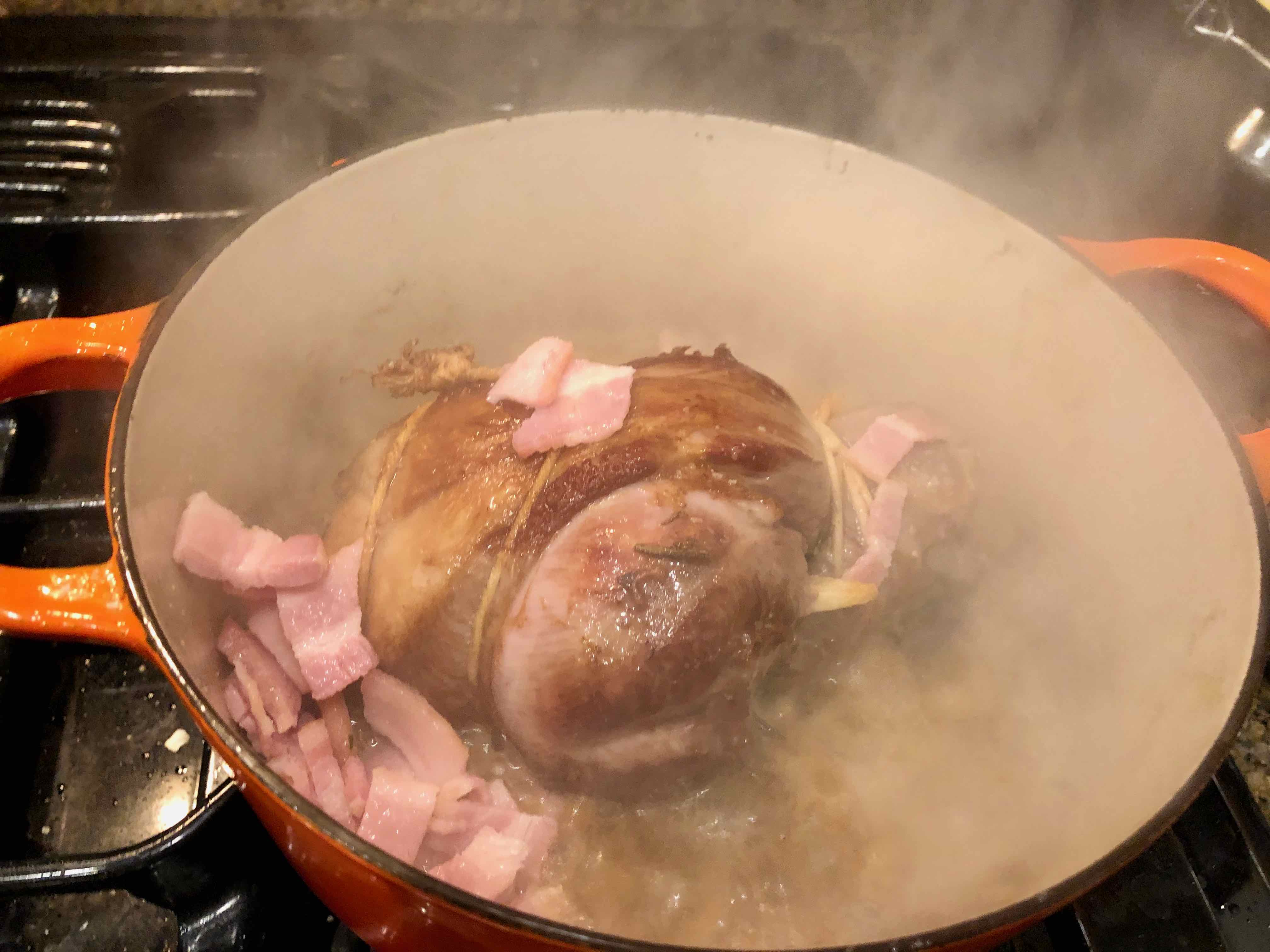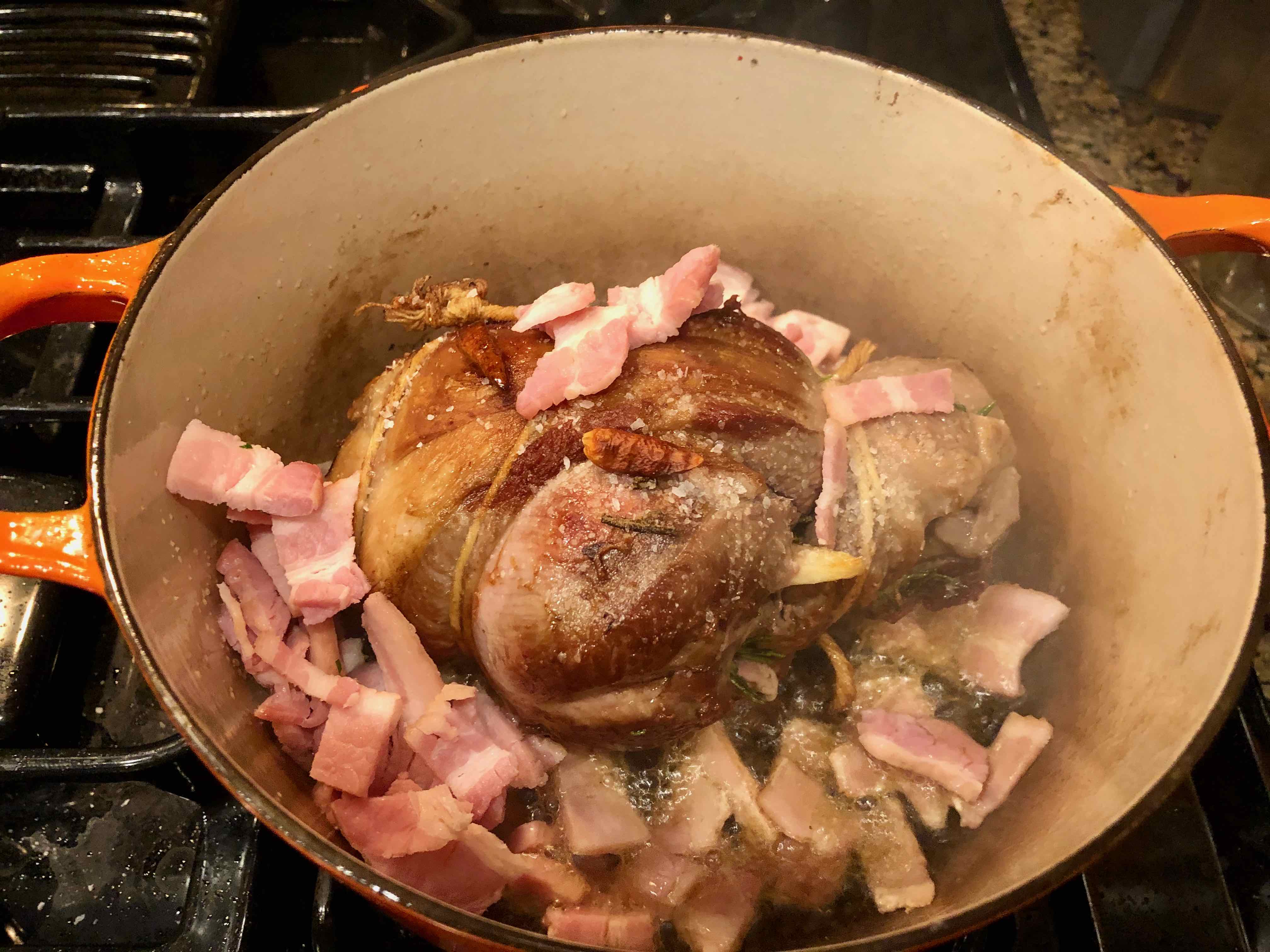 The original recipe called for the meat to be served with homemade wide egg noodles, buttered and sprinkled with Parmigiano, but I substituted a creamy polenta. Other substitutions included fresh tomatoes for canned Italian style and bacon for pancetta.