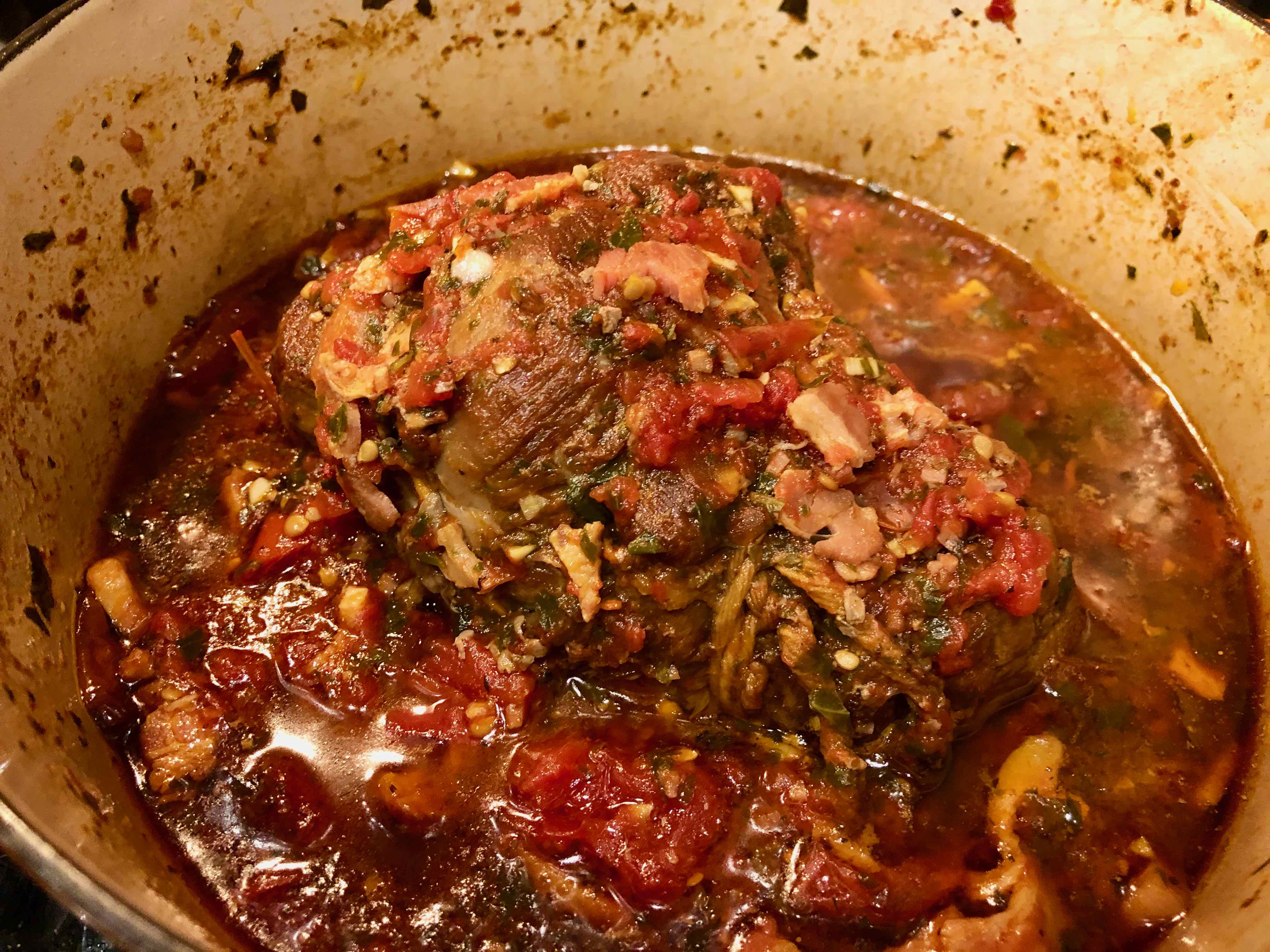 9. Cover and simmer 1 1/2 – 2 hours, or until the lamb is tender. During cooking, occasionally turn the meat and stir the sauce. After the first hour, check the level of liquid in the pot and continue cooking either covered or uncovered as necessary to thicken the sauce.