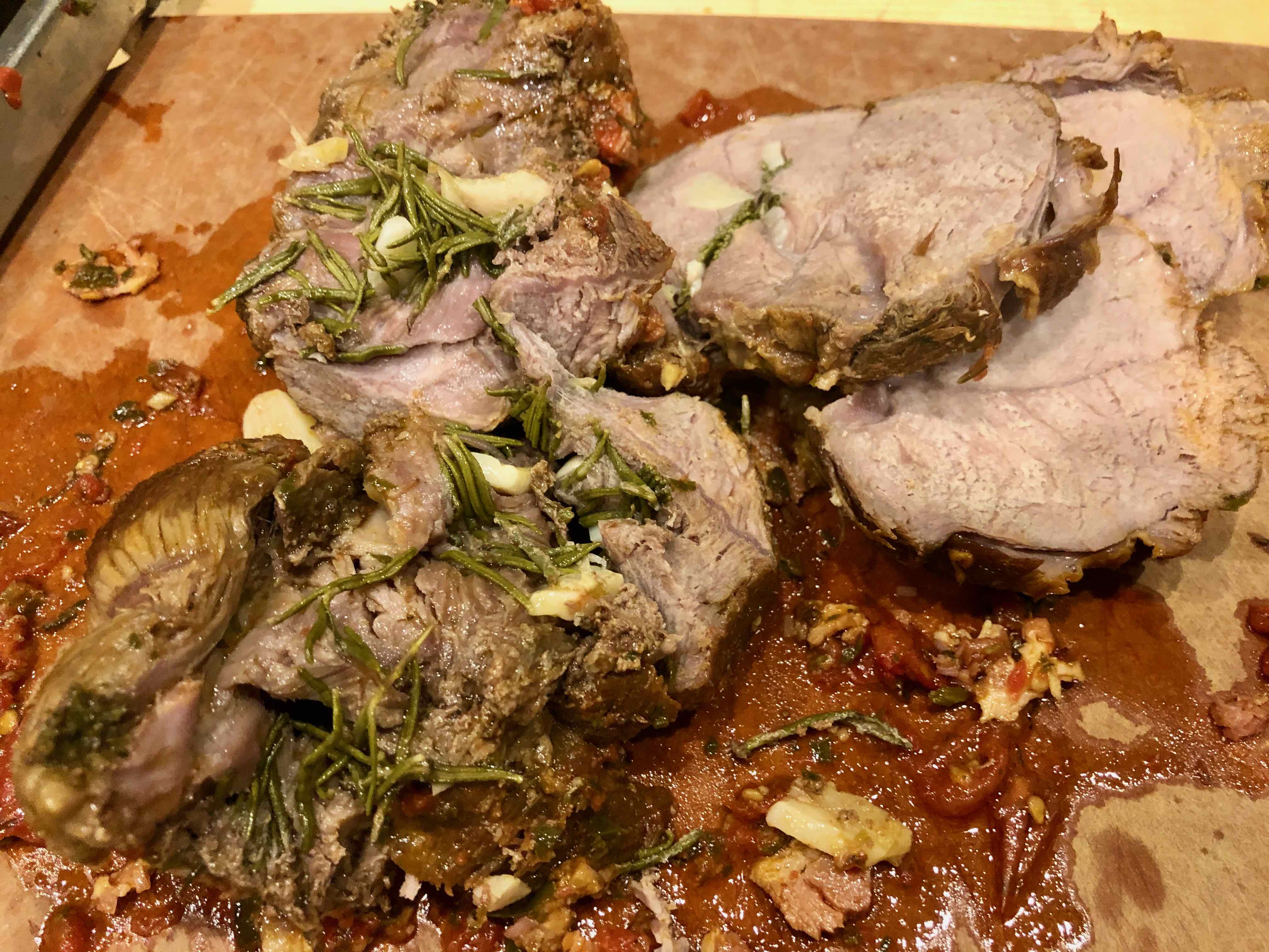 As the conductor for this performance, and alas its only critic, I must say it was a hit. The tomatoes and the lamb sang in perfect harmony, both exhibiting their strengths. The lamb was juicy and tender, infused with rosemary and garlic notes. The tomatoes yielded a richly flavored savory sauce that lingered on the palate with hints of heat from two tiny peperoncini and an unctuousness from some diced pork. (I should add here that the pork role, which was to be played by pancetta, was assumed at the last minute by some thick-sliced bacon, owing to the former’s unavailability that night.) Indeed, the entire cast came together in what the only other attendee called an “exhibition of counterpoint” between sweet and savory as well as spicy and herbaceous.