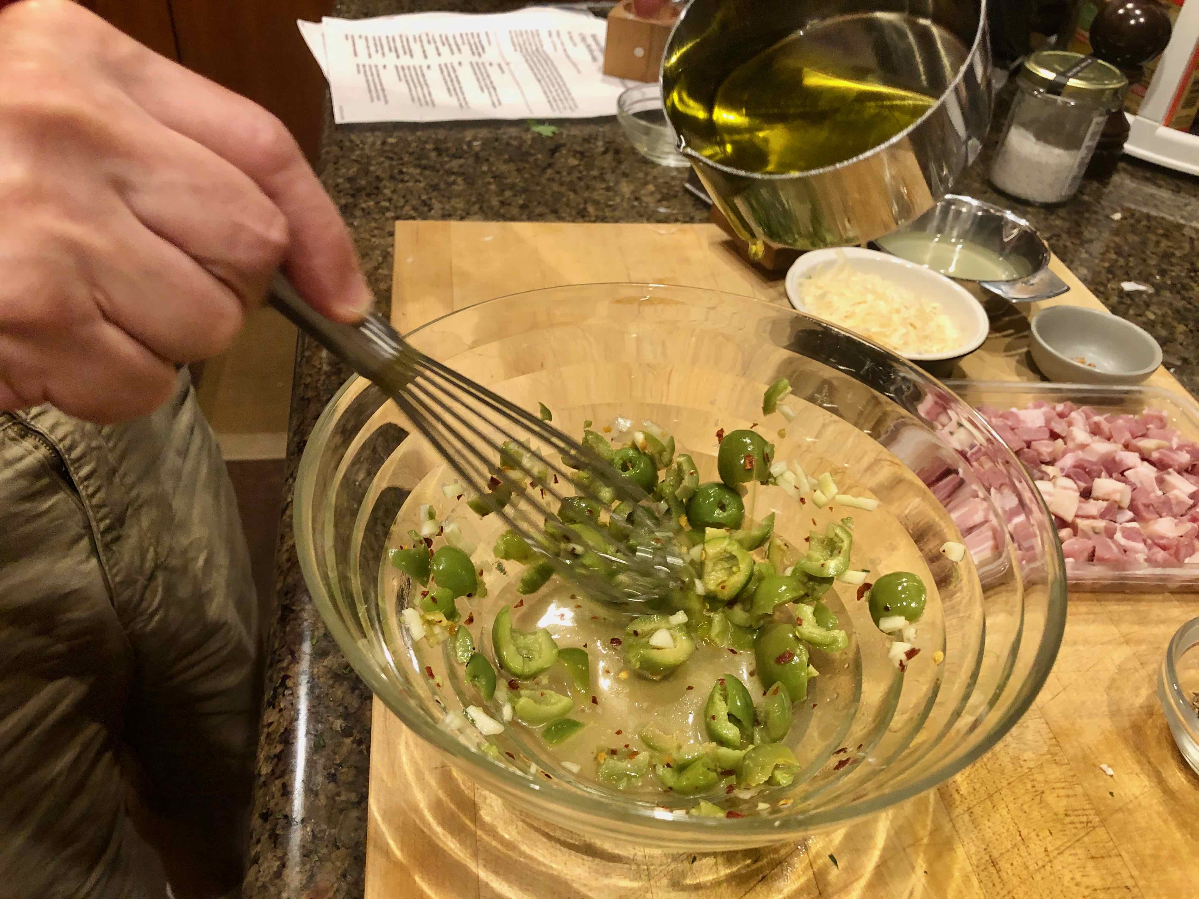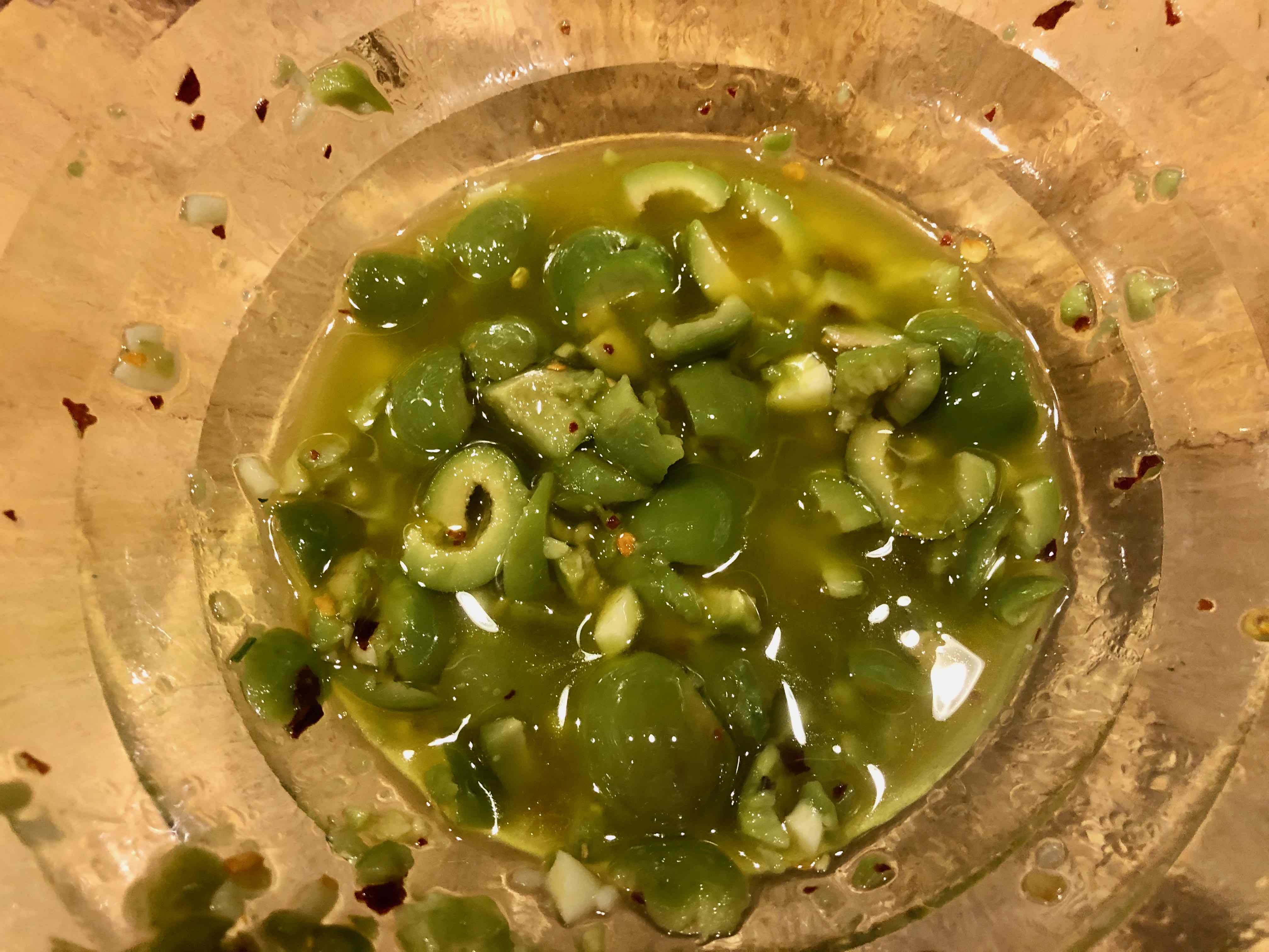 2. In a small bowl, toss the chopped olives, garlic, red-pepper flakes, salt to taste with the lemon juice. Keep the salinity of olives in mind when adding salt. Whisk in 1/4 cup olive oil.