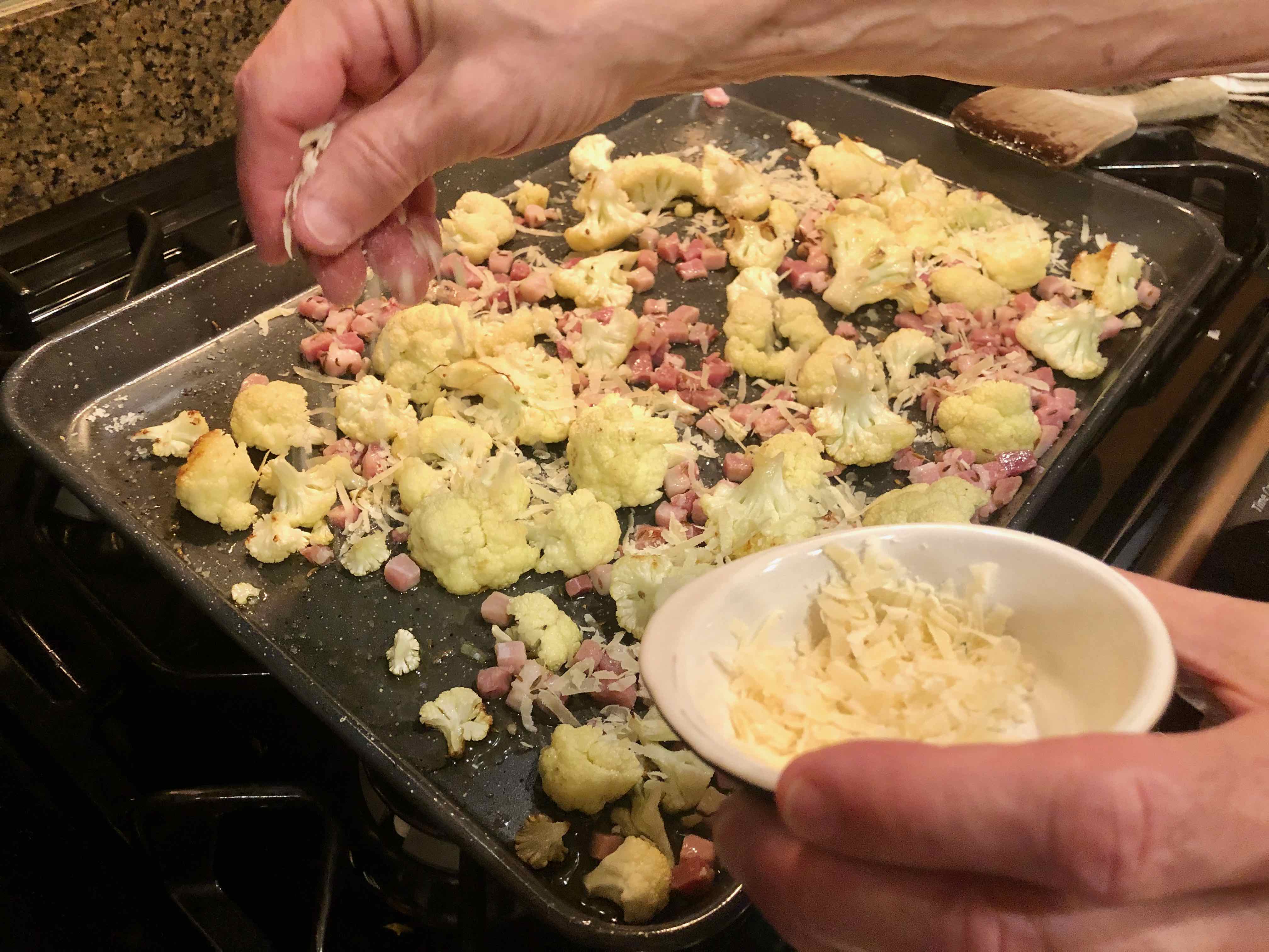 6. Sprinkle the Parmigiano on top and roast for another 15 to 30 minutes, or until cauliflower is tender and the cheese is lightly browned.