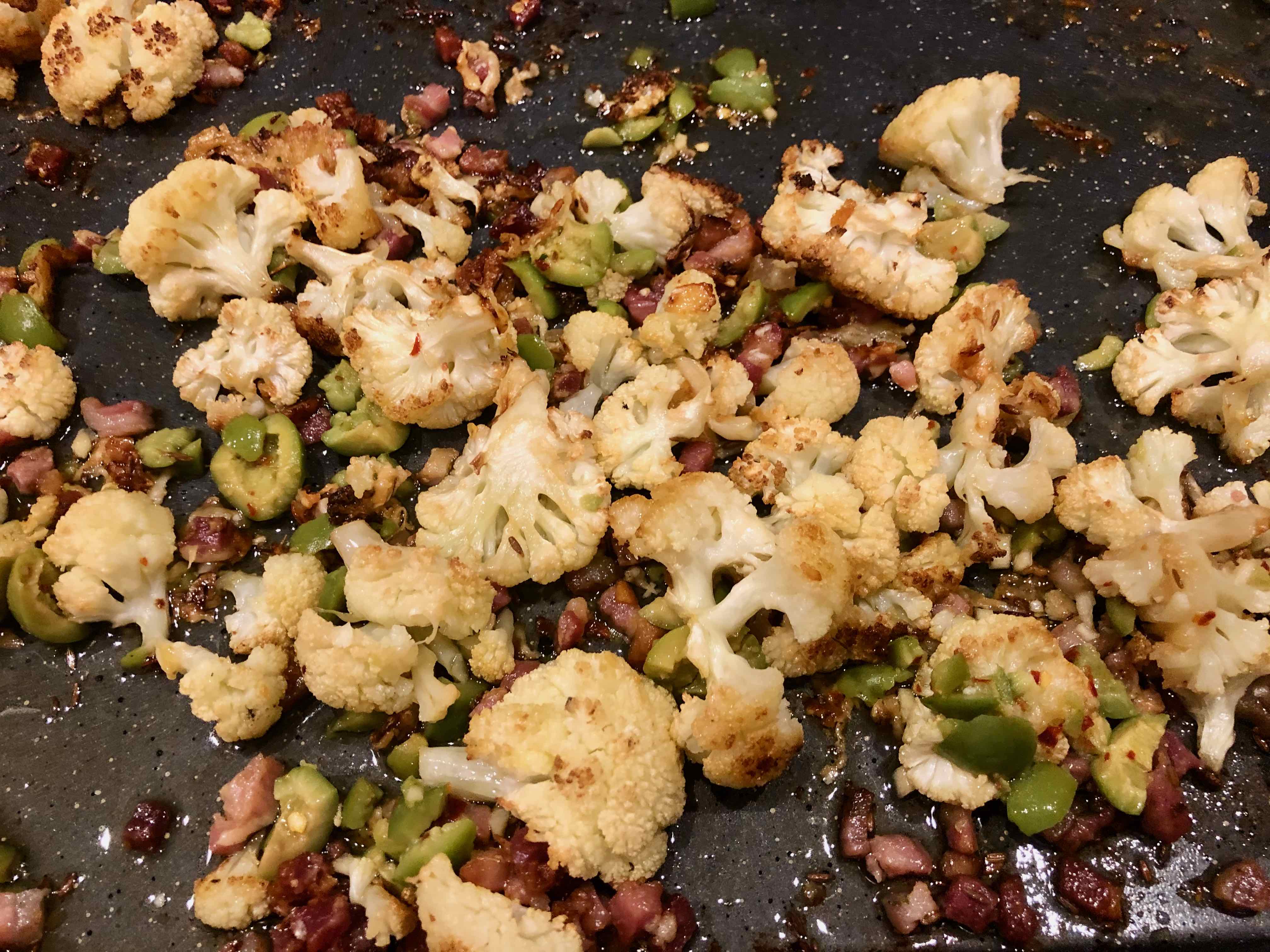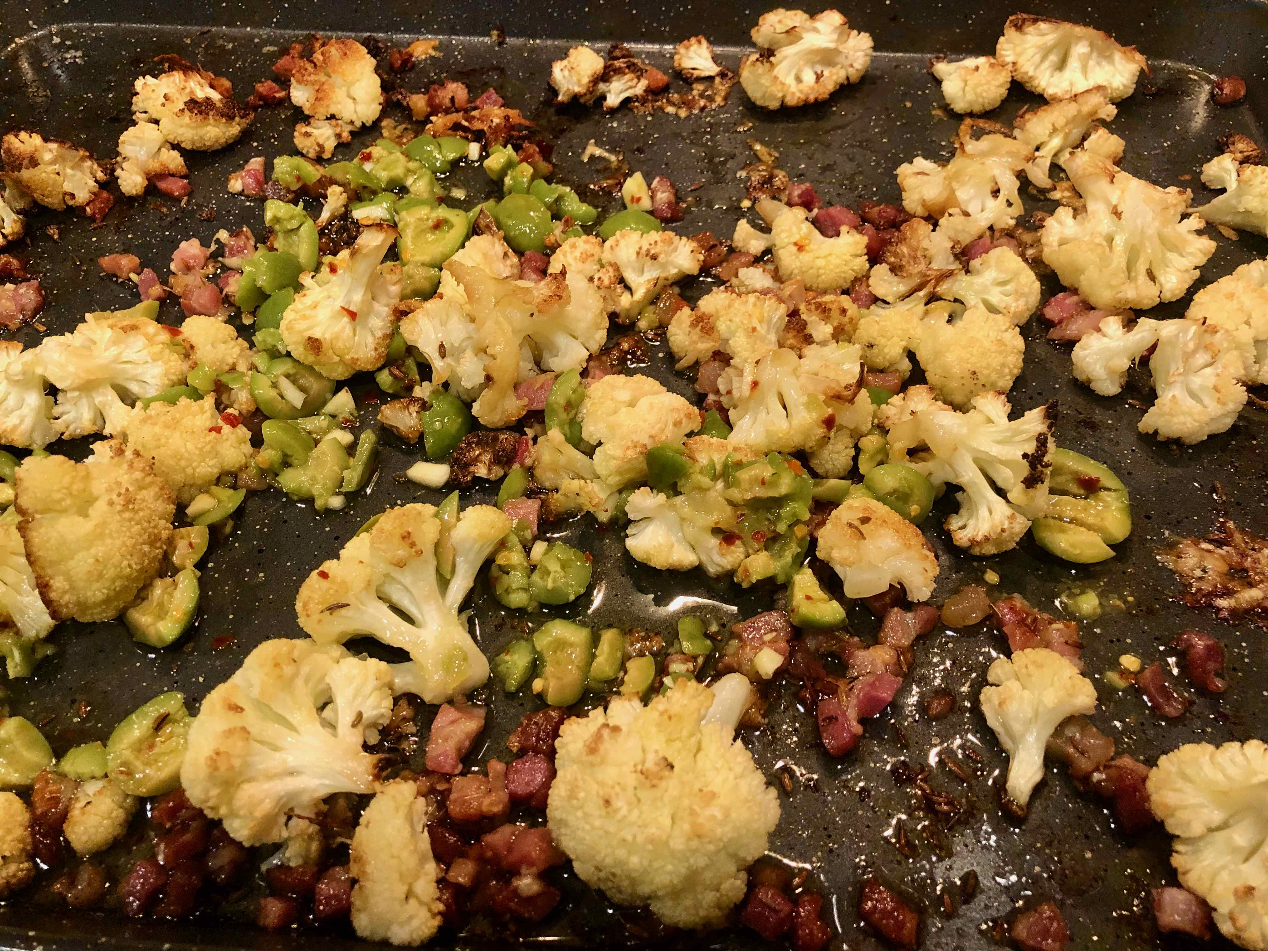 5. Remove the cauliflower from the oven, add the pancetta and cumin seeds to pan, and gently toss.
