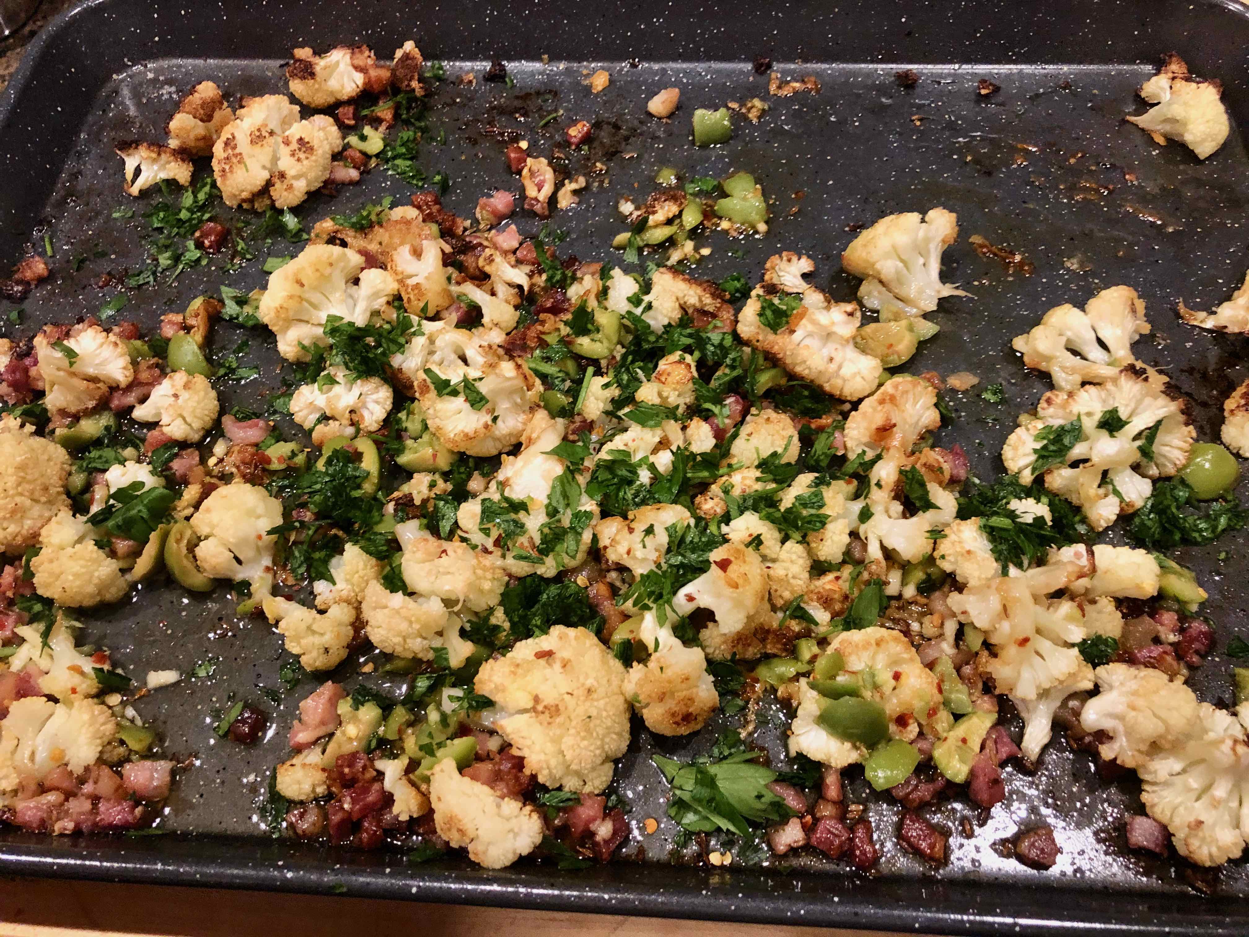 Roasted Cauliflower With Pancetta and Olives (adapted from a recipe by Melissa Clark in The New York Times.)