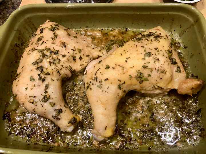 After I decided to make the dish, however, I realized I didn’t have some of the ingredients the recipe called for. Back in those early days of cooking, I probably would have chosen another recipe. But having grown more confident after some 40 years of cooking, I decided to make some substitutions: for tarragon, basil with a pinch of fennel powder; for chopped chives, diced shallot; for dry sherry, dry Marsala. Confidence also came to rescue when I opted to put my rather pale looking baked chicken under the broiler for some extra browning. As I was cooking for two, I only used two leg quarters as opposed to two quartered plump broiling chickens, but kept to the recipe’s other measurements for the herbs and the sauce.