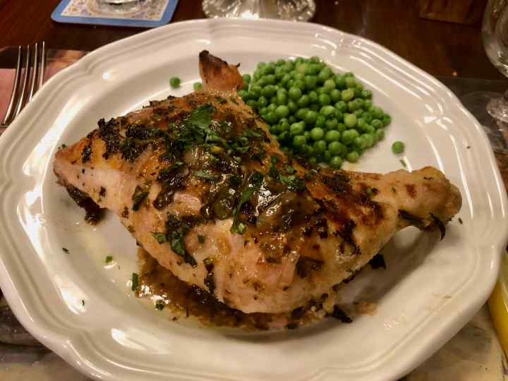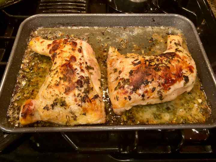 So when the other night my better half suggested making “something different” for a brace of chicken-leg quarters, I turned to my copy of the book and rediscovered a recipe from my past: “Herbed Baked Chicken.” Reading the recipe made me nostalgic; I think that may have been the first time I used tarragon (albeit dried) or served anything atop thin slices of toast.