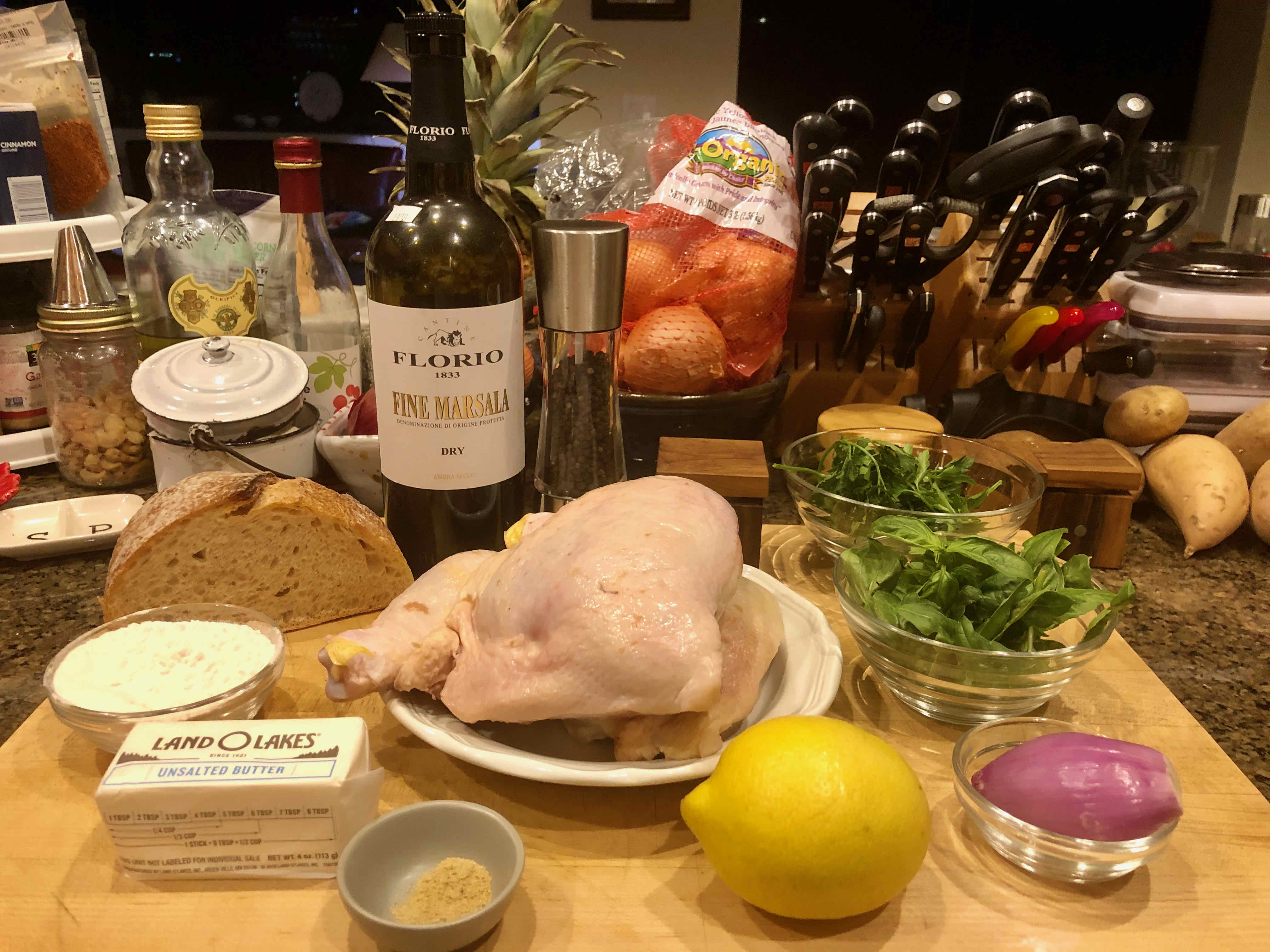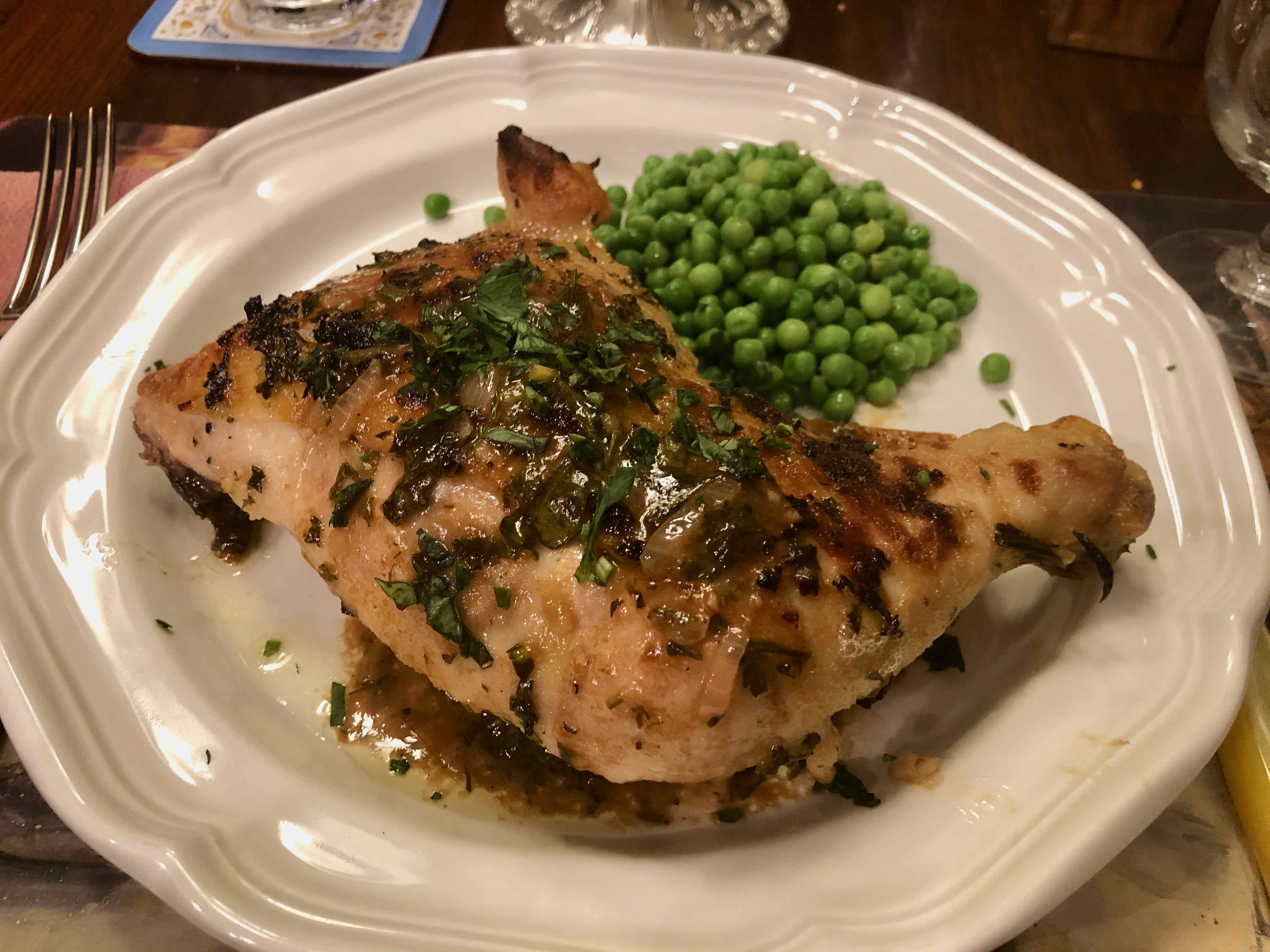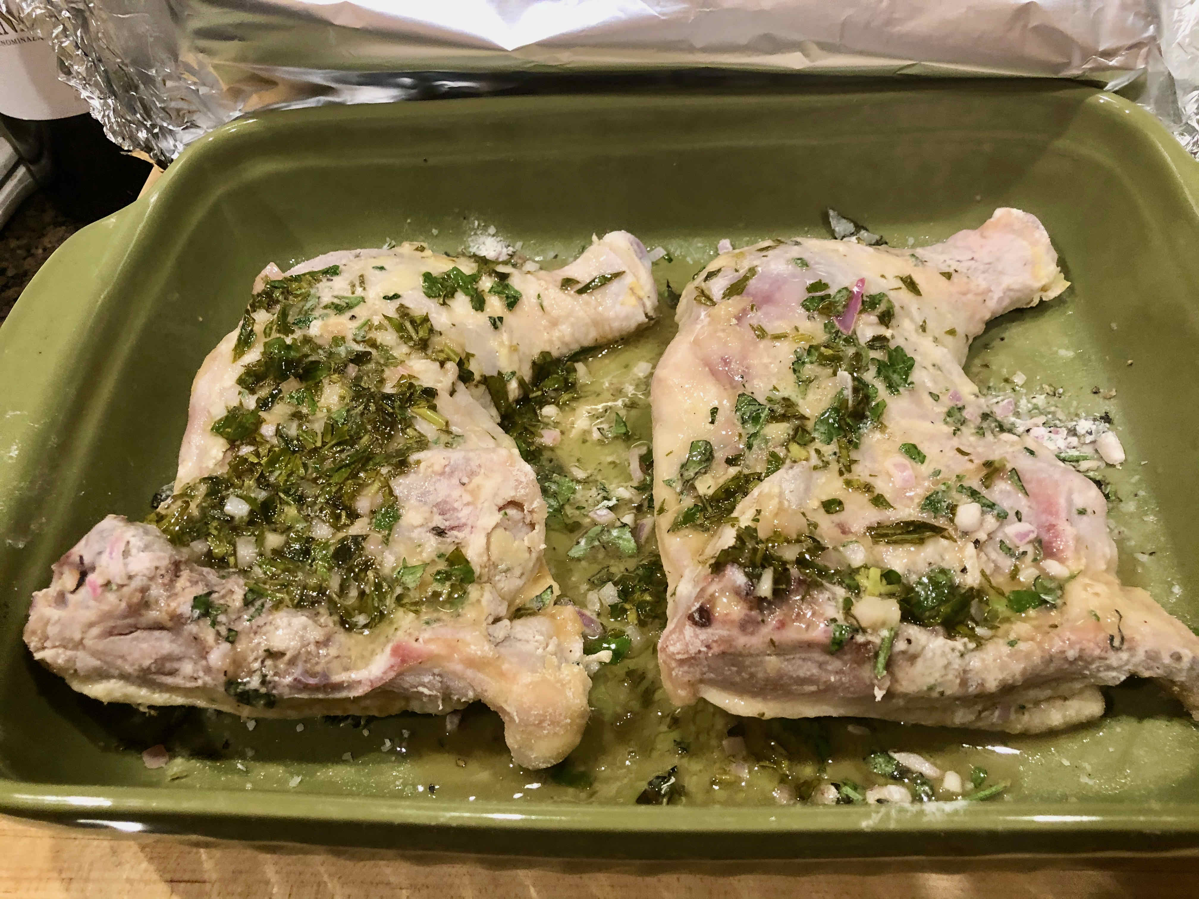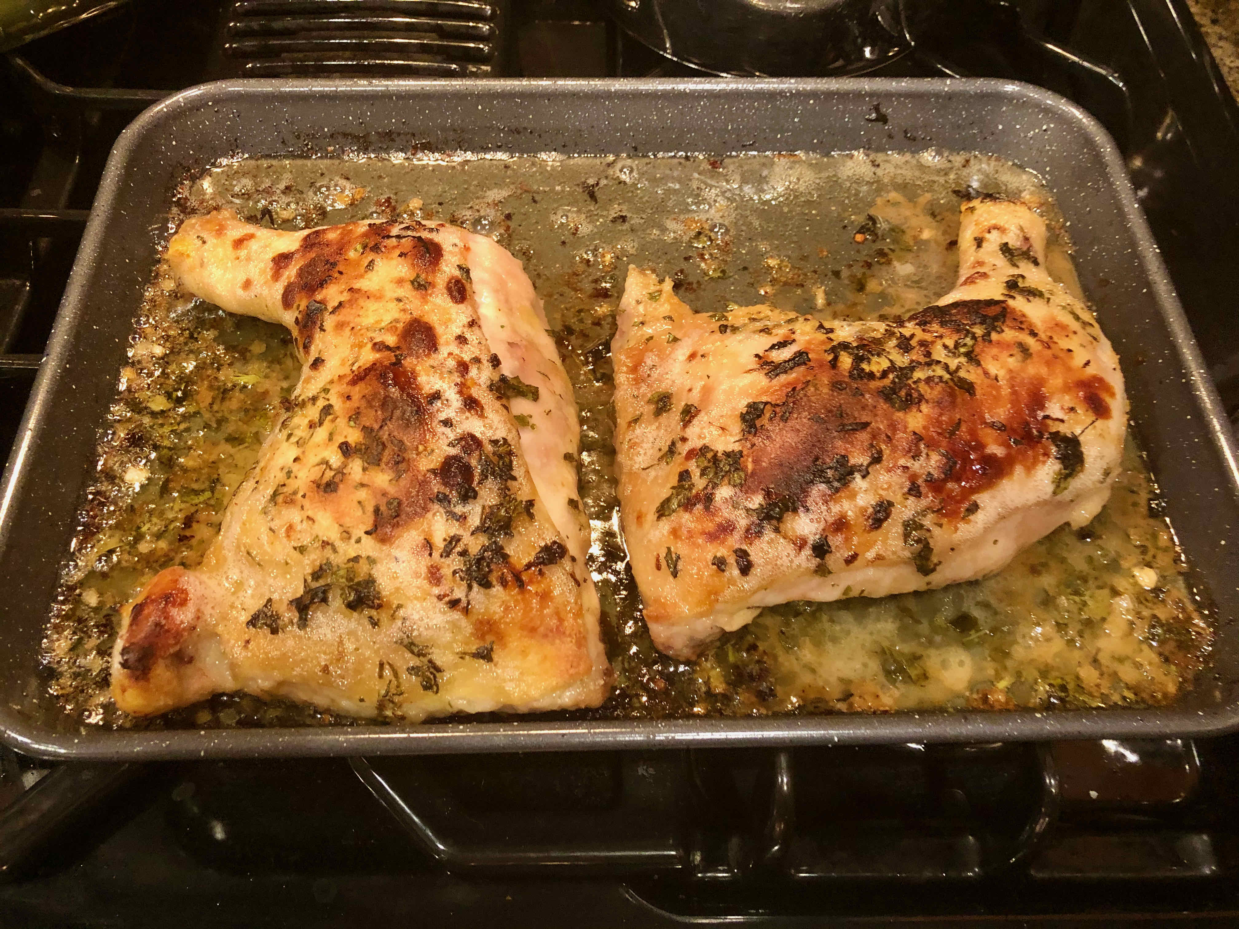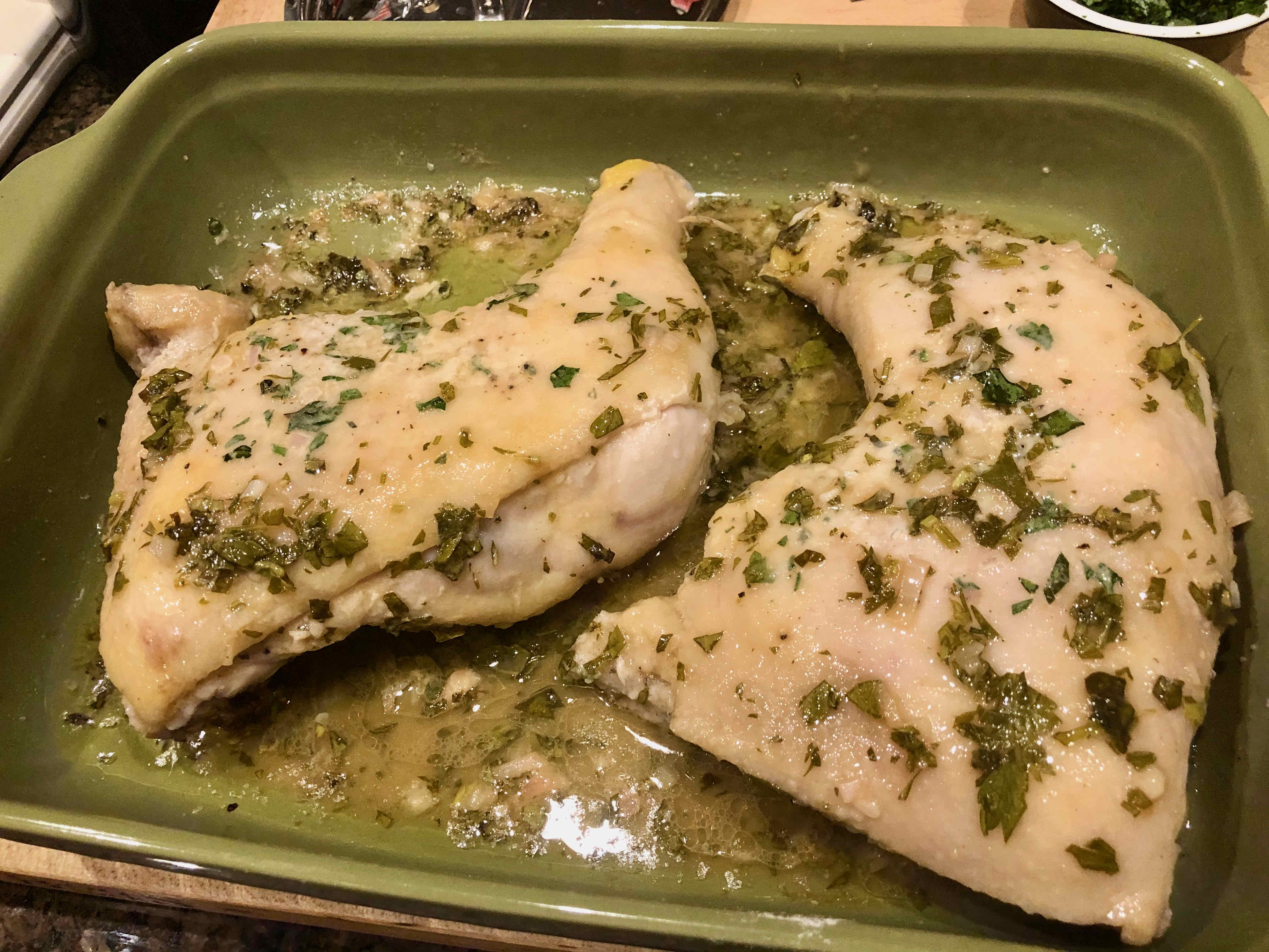 After I decided to make the dish, however, I realized I didn’t have some of the ingredients the recipe called for. Back in those early days of cooking, I probably would have chosen another recipe. But having grown more confident after some 40 years of cooking, I decided to make some substitutions: for tarragon, basil with a pinch of fennel powder; for chopped chives, diced shallot; for dry sherry, dry Marsala. Confidence also came to rescue when I opted to put my rather pale looking baked chicken under the broiler for some extra browning. As I was cooking for two, I only used two leg quarters as opposed to two quartered plump broiling chickens, but kept to the recipe’s other measurements for the herbs and the sauce.