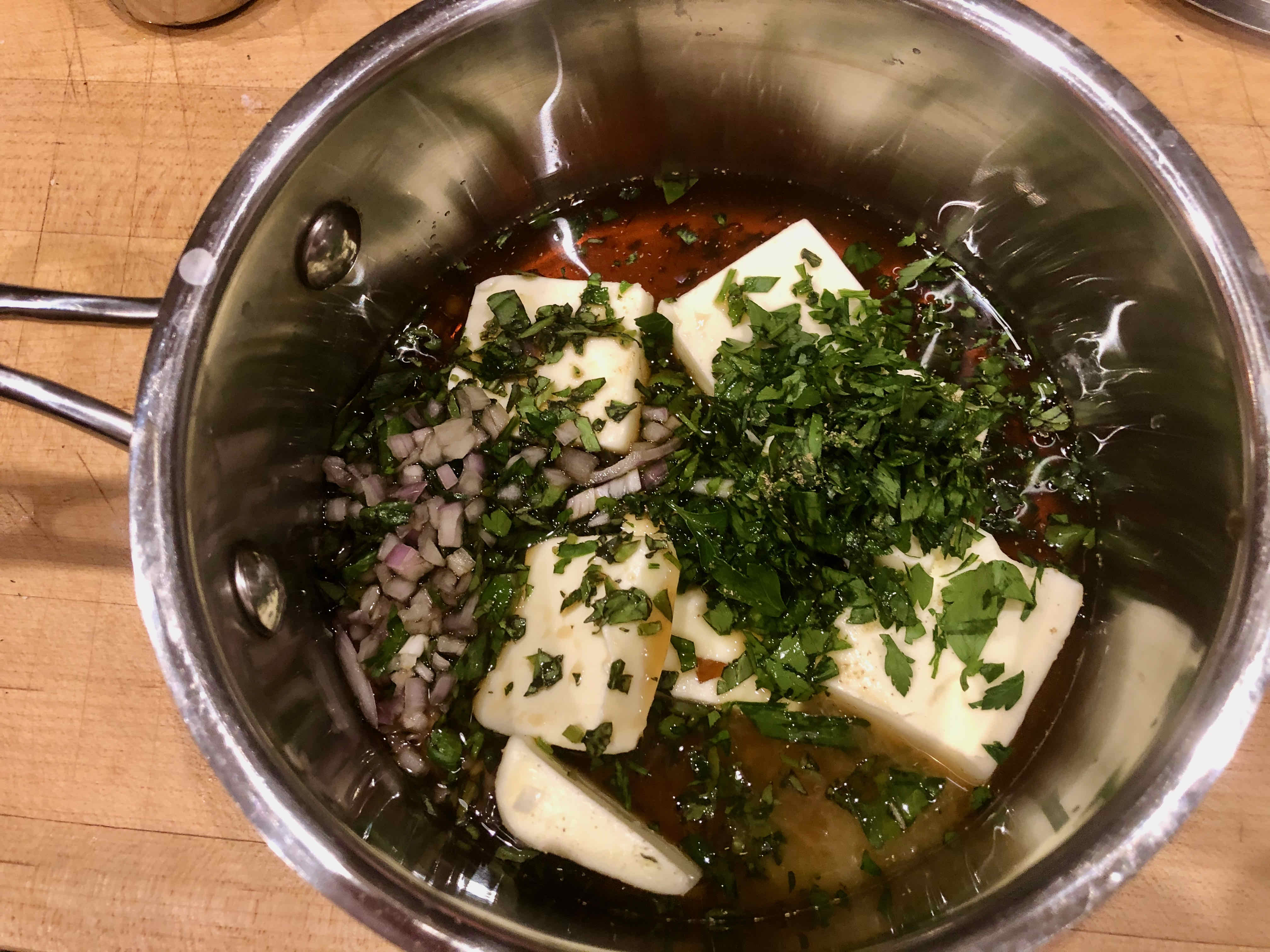 3. In a small sauce pan, combine the butter, lemon juice, sherry, and the remaining herbs. Over low heat, heat just until the butter melts, and then whisk to combine. Keep warm.