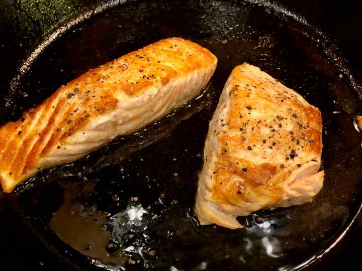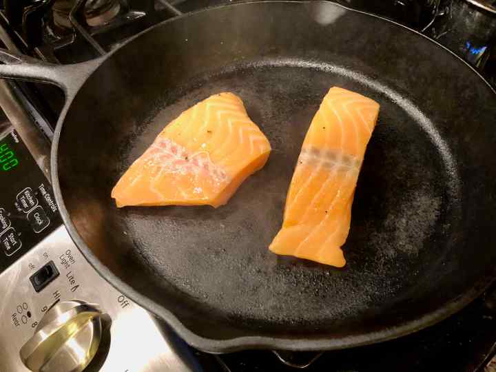 8. Place the salmon in the skillet rounded side down and cook over medium-high heat for exactly 2 minutes without moving. (If you move them, they will stick.)