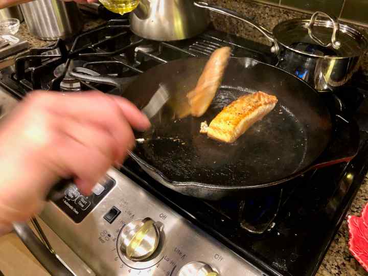 9. Using a large metal spatula, turn the fillets rounded side up, and place the skillet in the oven. (I added just a little oil to the pan while turning the salmon.)