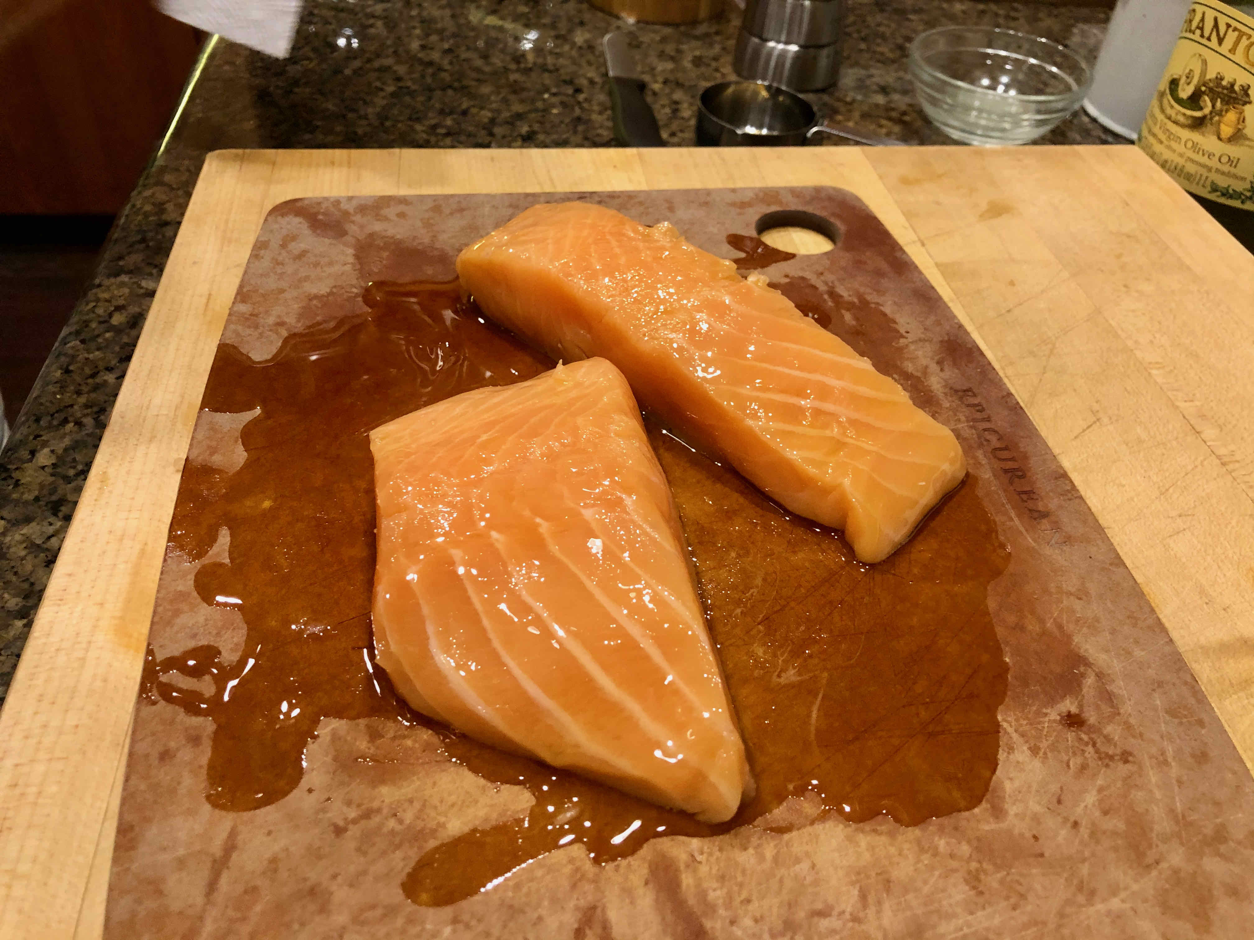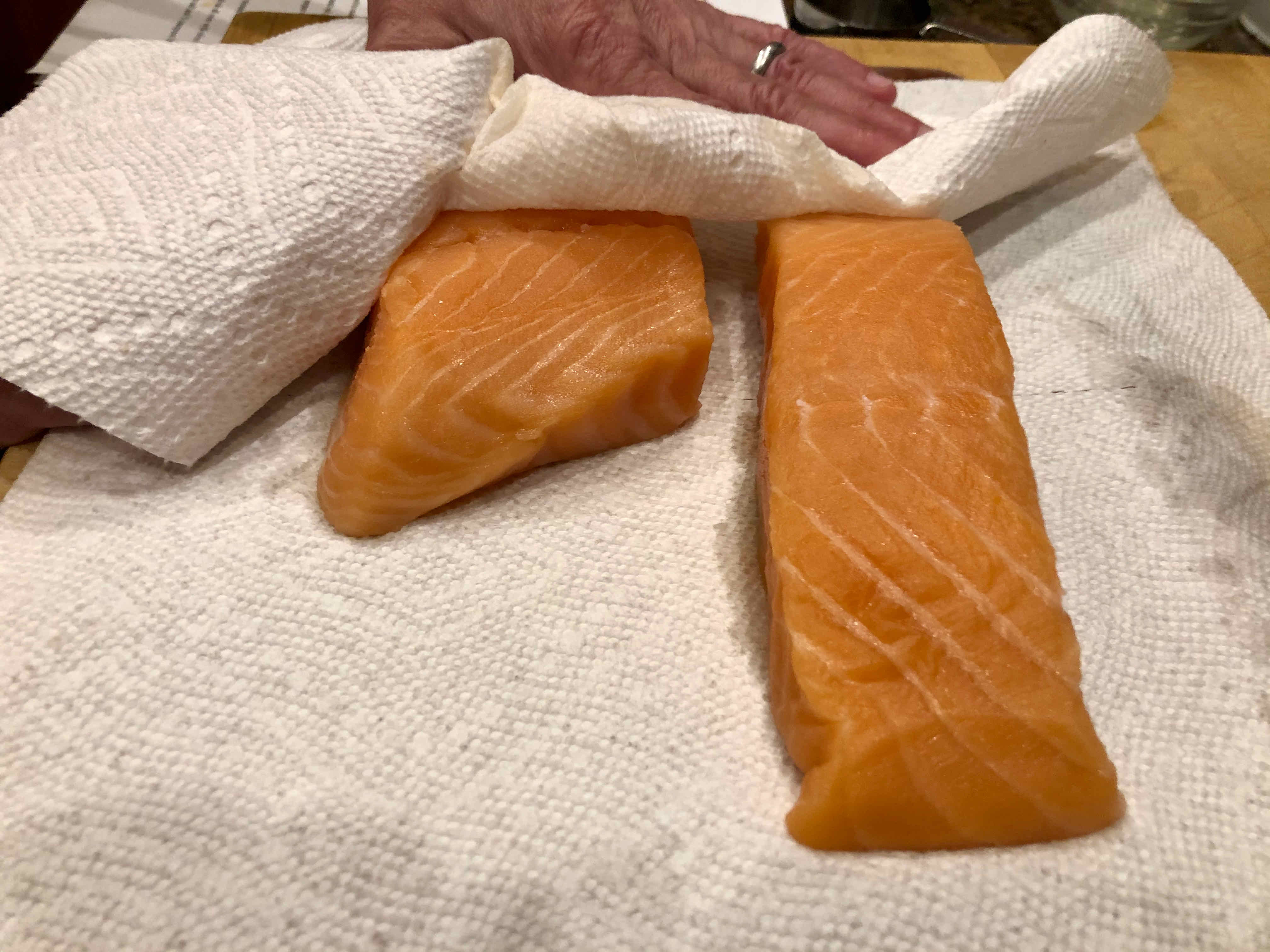 6. Place the salmon fillets on a board, pat dry with paper towels, and rub all over with olive oil. (It’s important to dry the salmon well so that the oil will adhere.)