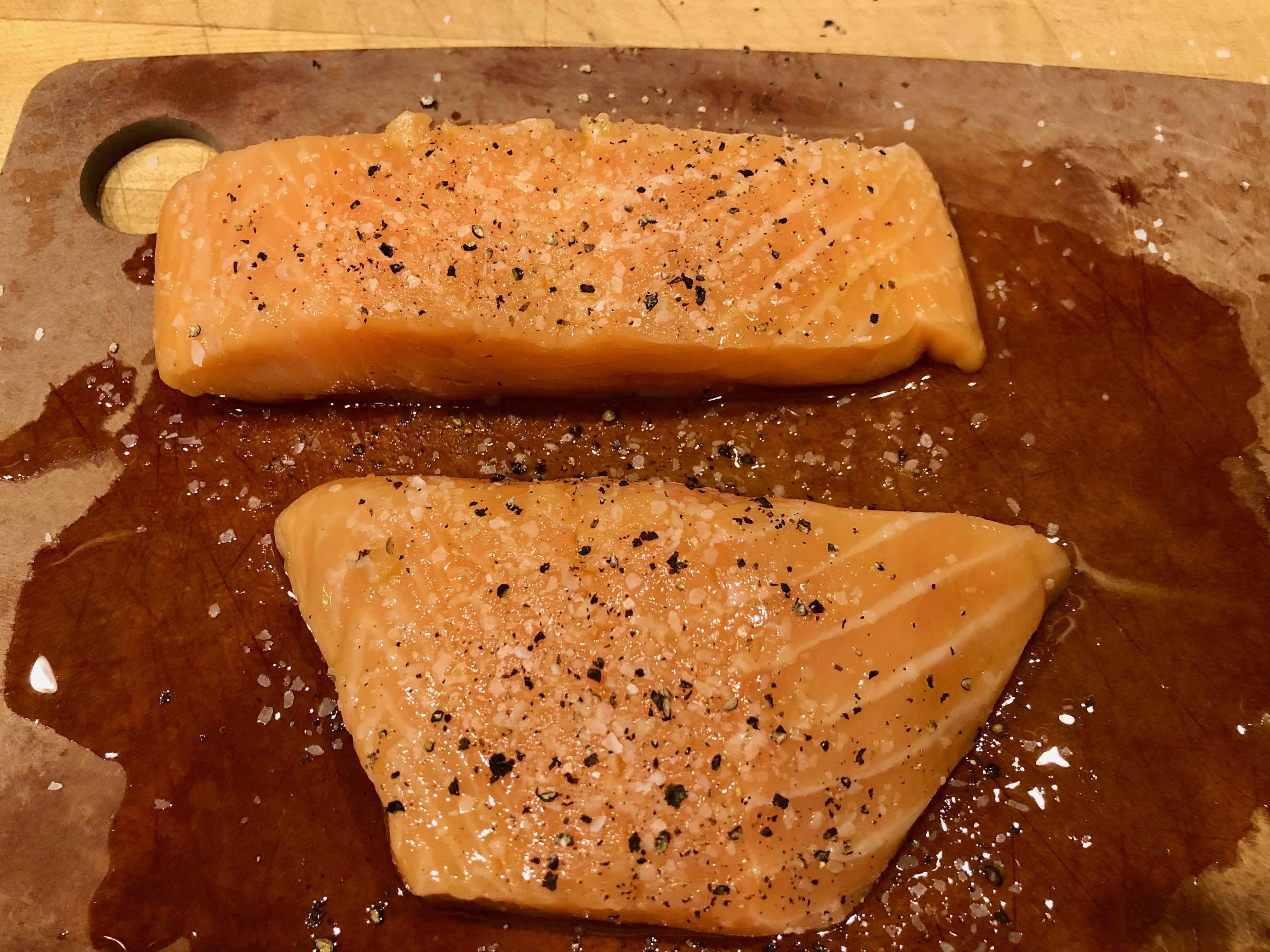 7. With the fillets rounded side up, sprinkle them with 1½ teaspoons salt and ¾ teaspoon black pepper.