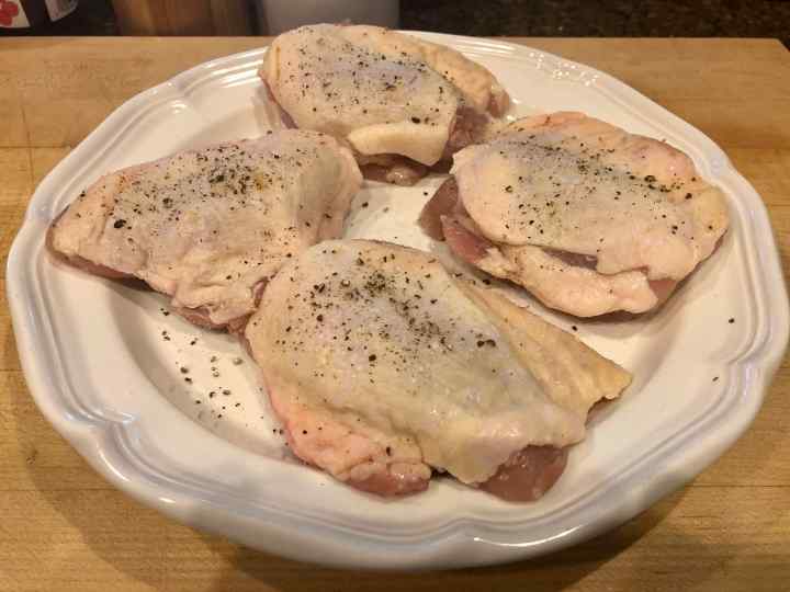 1. At least 4 hours (but not more than 12 hours) before you plan to serve, pat the chicken dry with paper towels, sprinkle the thighs all over with 1 teaspoon salt and ½ teaspoon pepper.