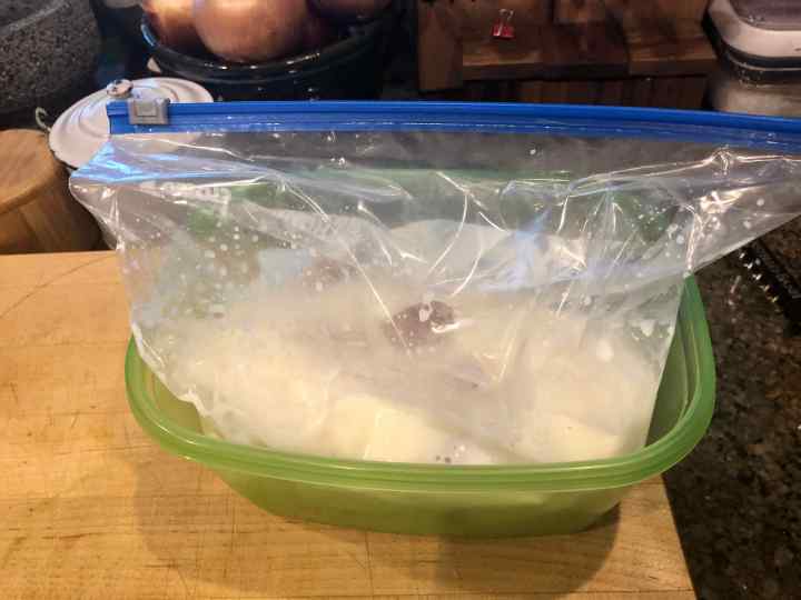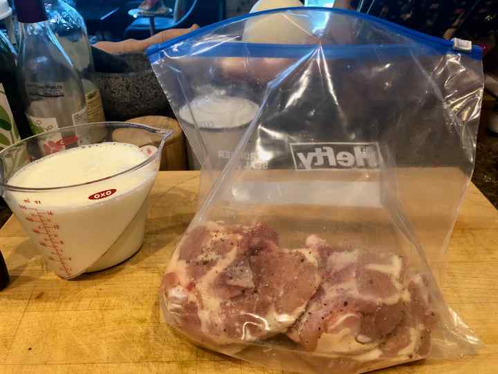 2. Place in a 1-gallon sealable plastic bag and pour in the buttermilk. Seal the bag and massage it lightly to be sure the chicken is coated with the buttermilk. Place in the refrigerator to marinate.