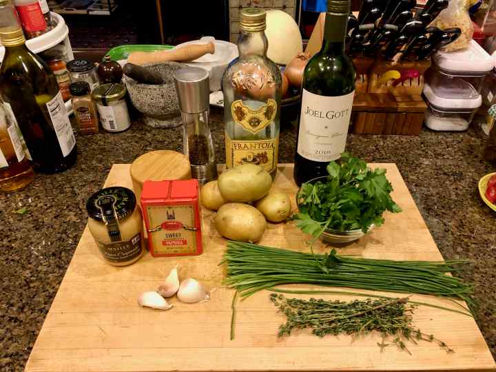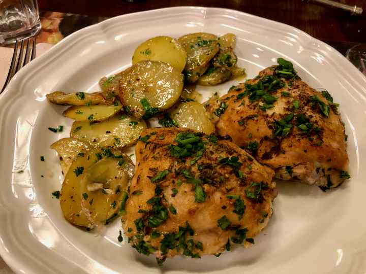 Well, the old dog has a learned a new trick; marinating the chicken in buttermilk for six hours made the roasted thighs perfectly tender and wonderfully moist. Garten’s choice of flavorings for roasting the dish after discarding the marinade—Dijon mustard, fresh thyme, and Hungarian paprika—contributed even more flavor. In addition, roasting the potatoes in two stages, the first with the chicken and the second on their own with plenty of minced garlic, made them tantalizingly good. Finally, finishing the dish just before serving with minced parsley and chives made this one of the most flavorful roast chicken thighs I’ve ever prepared.