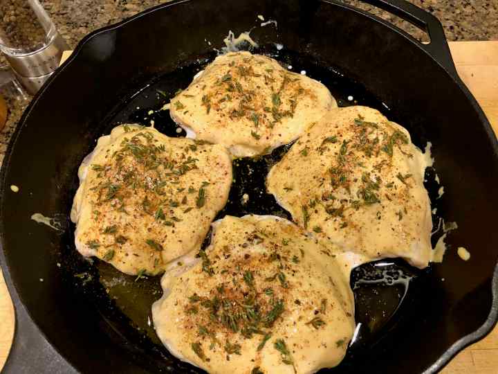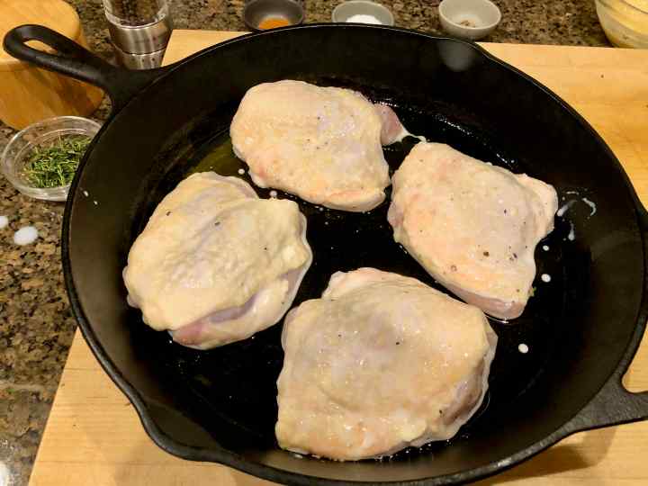 4. Lift the thighs out of the buttermilk, letting any excess buttermilk drip off, and place them in the skillet, skin side up, in one layer. Discard the marinade.