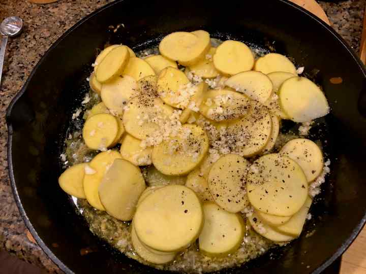 Potatoes, garlic, seasoning added to the pan