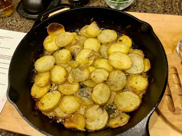 11. Transfer just the chicken to a plate and cover loosely with aluminum foil to keep warm. Return the skillet to the oven, raise the temperature to 425 degrees, and roast the potatoes for 15 minutes, or until they’re tender and starting to brown. (My potatoes needed an additional 10 minutes.)