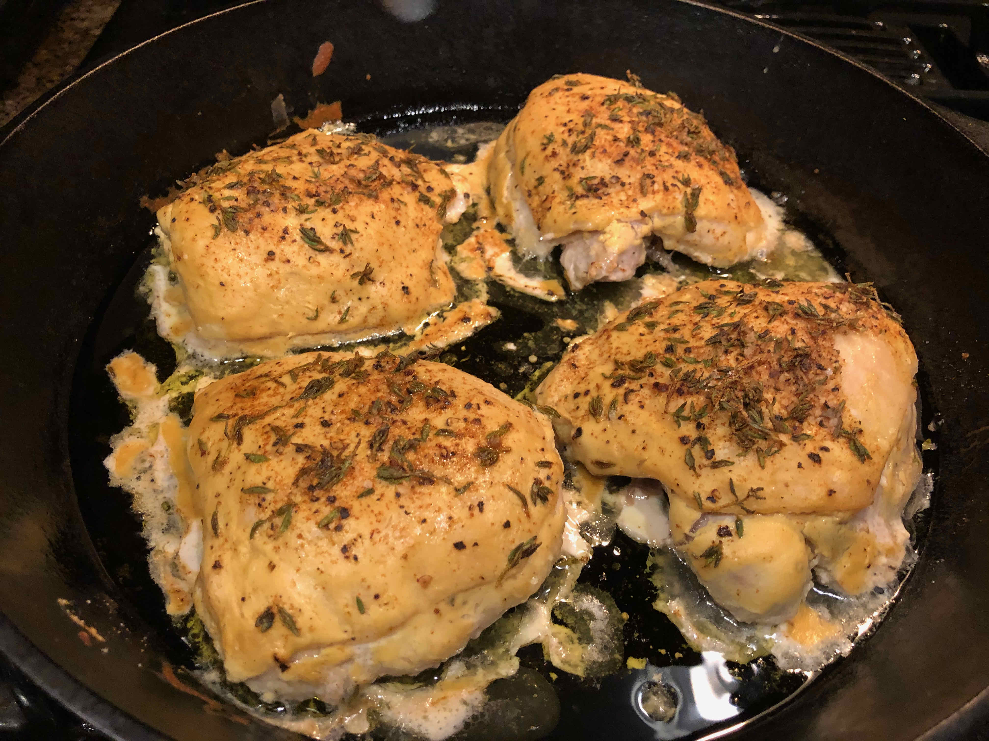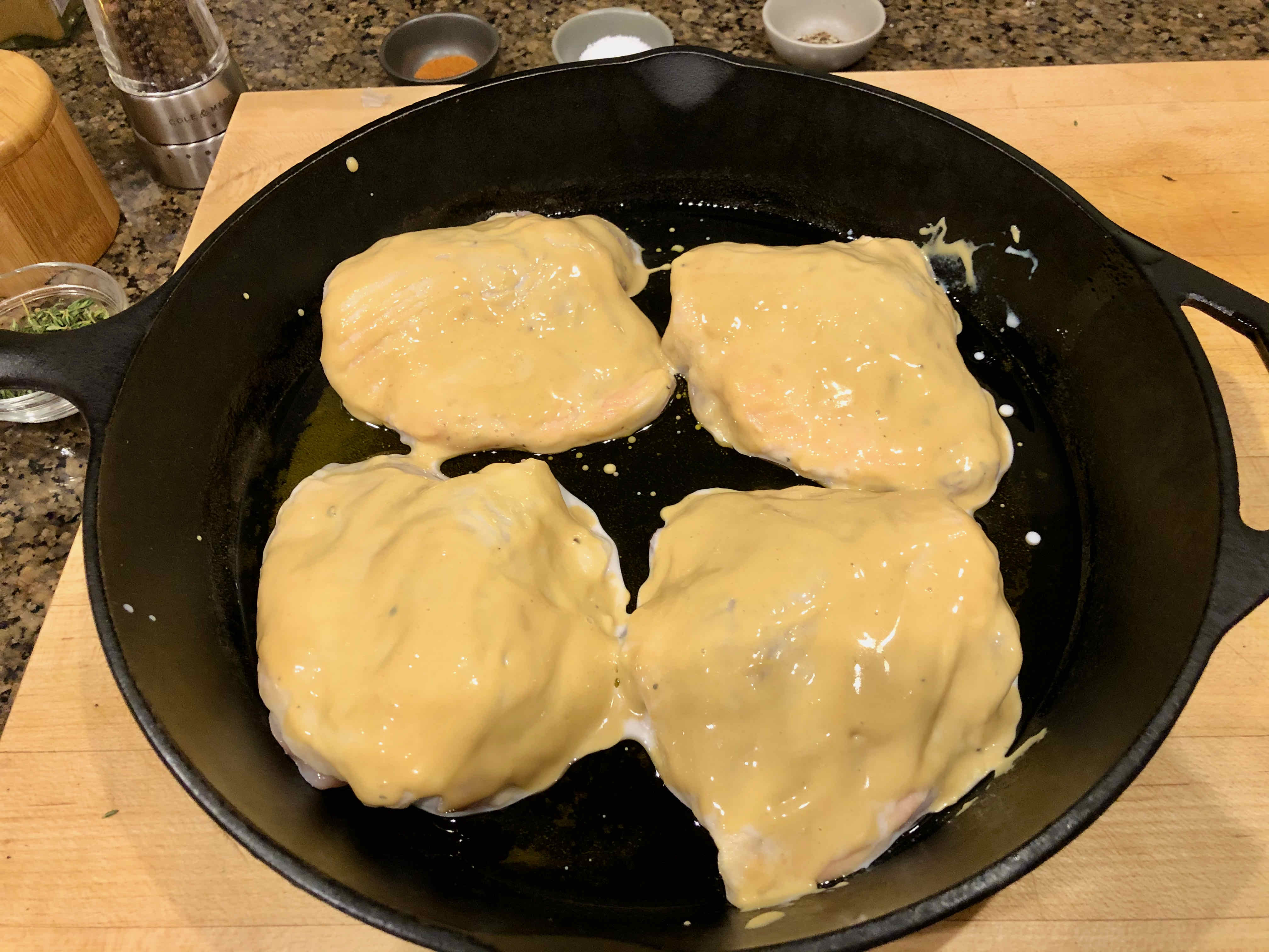 4. Lift the thighs out of the buttermilk, letting any excess buttermilk drip off, and place them in the skillet, skin side up, in one layer. Discard the marinade.