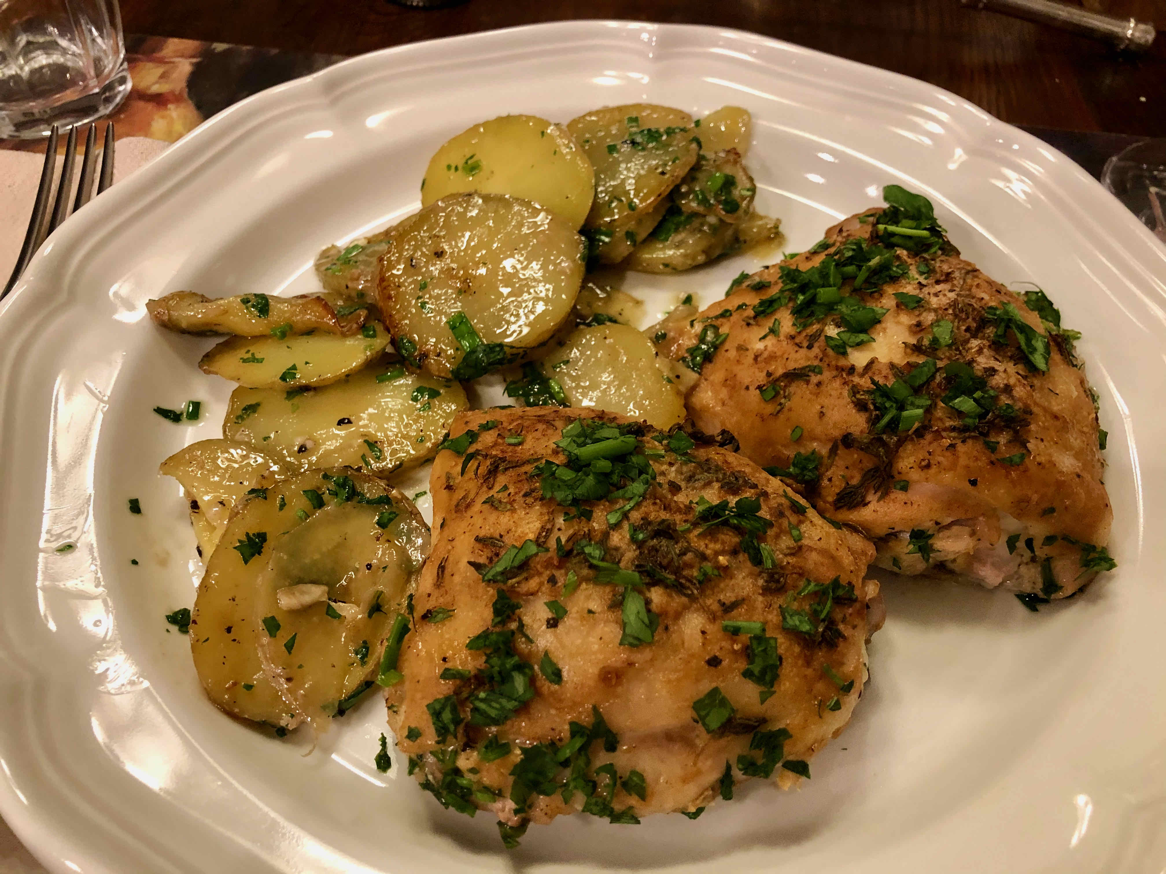 12. Return the chicken to the pan and sprinkle with the parsley, chives, and extra salt. Serve hot from the skillet on warmed plates.